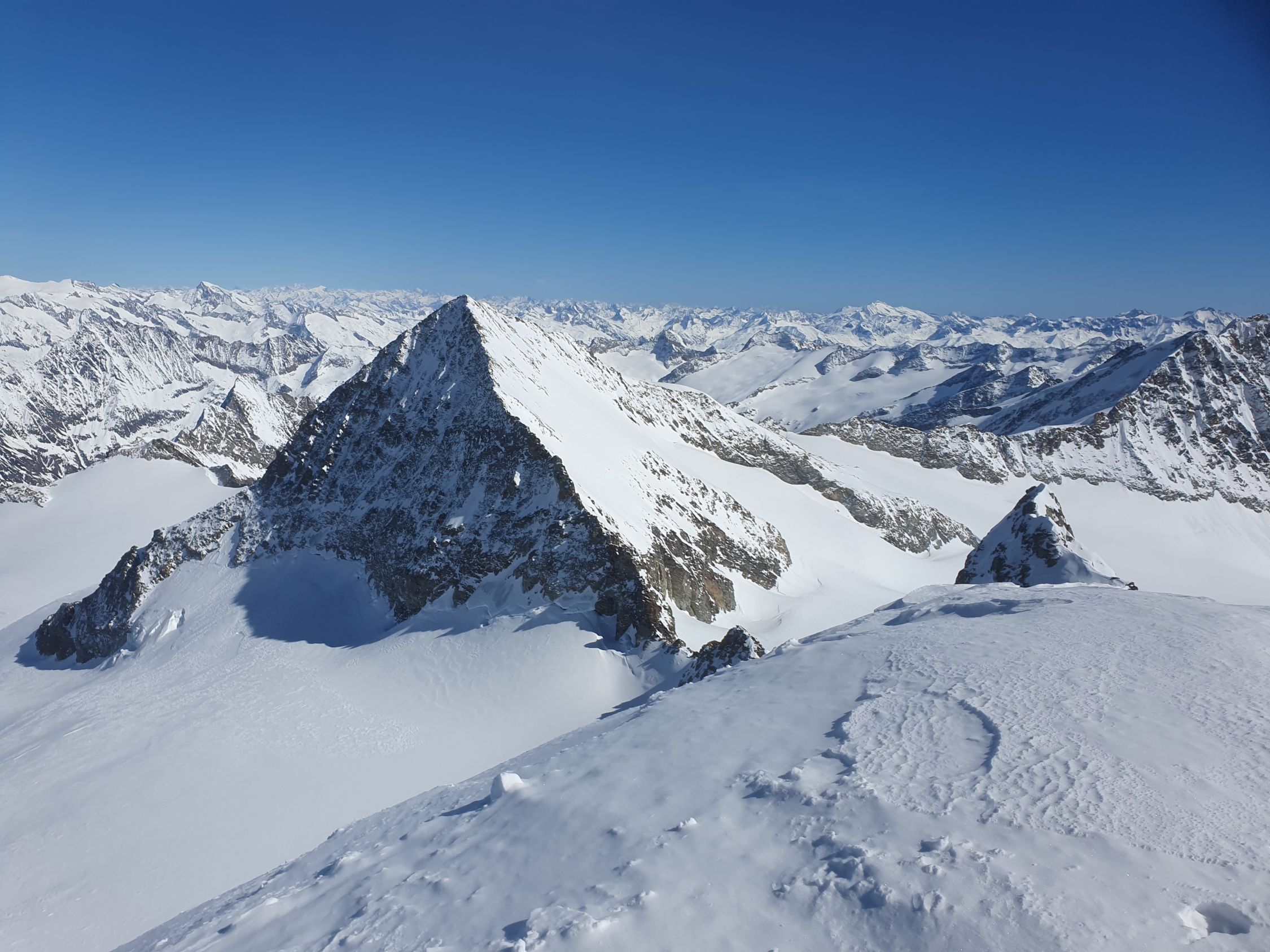 Nun Aufstieg auf Hartschnee in Richtung Mittelhorn. Ich machte bei 3587Hm Skidepot, zog wieder meine Steigeisen an und stieg auf einer Fussspur steil hoch zum Mittelhorn. Der Schnee hier war nicht ganz kompakt und auch wenig vorhanden, so, dass ich oft die Felsen spürte. Zuletzt auf dem W-Grat zum Gipfel. Oben leider keine Spuren direkt hinab nach E. Auch keine beim Übergang zum Oberer Grindelwaldgletscher bei P3550 und P3496 gesichtet.