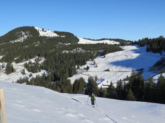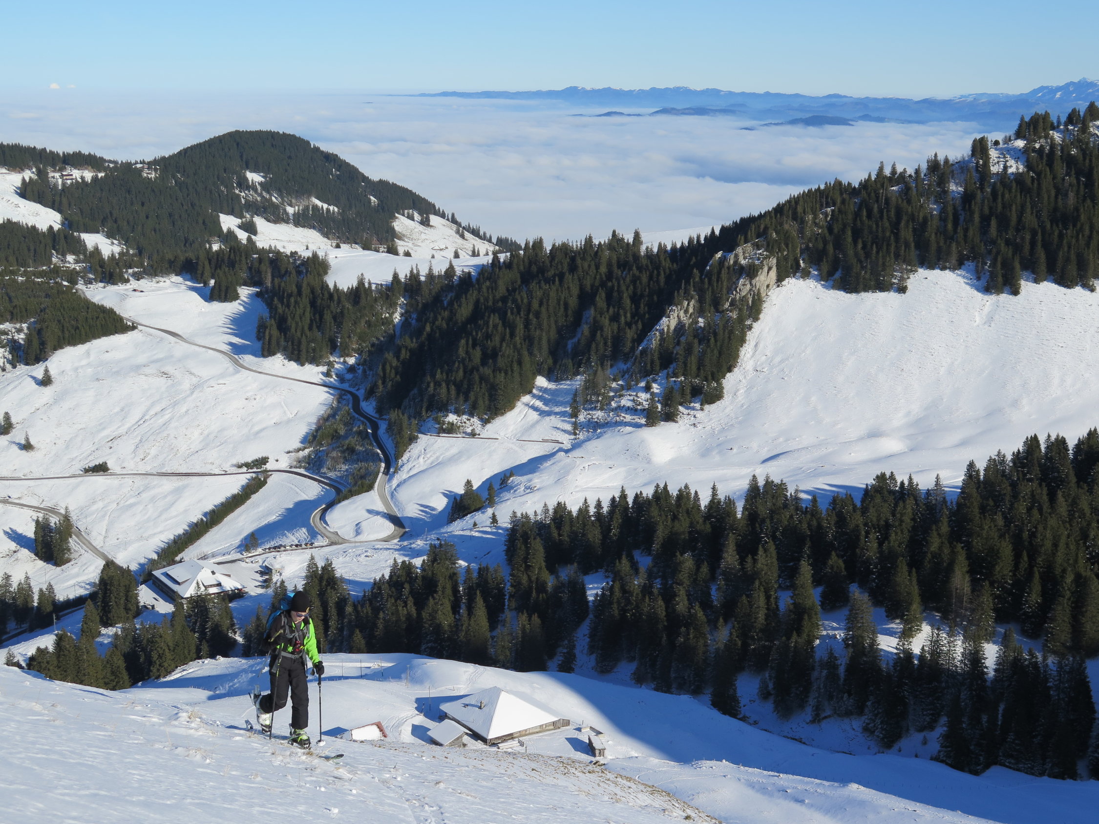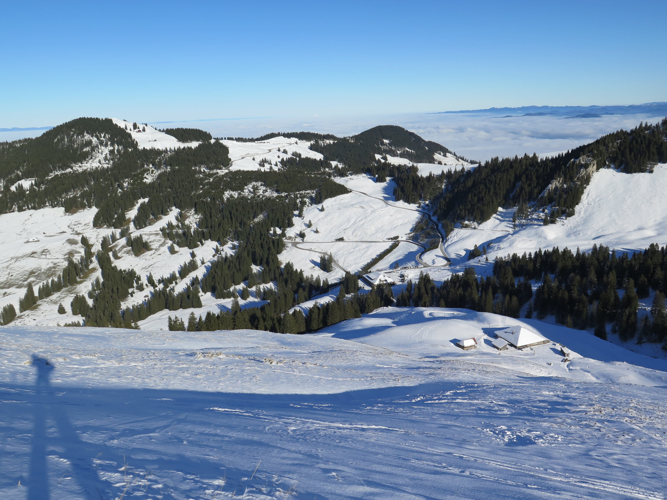 Wie schon in den lezten beiträgen erwähnt alle Schneearten angetroffen. Pulver Hartschnee und Bruchharst. Und Grasflächen. Da aber der Untergrund meist aus Weideflächen besteht deswegen kein problem. Unten raus ( unter Birehütte) besser der Strasse folgen.