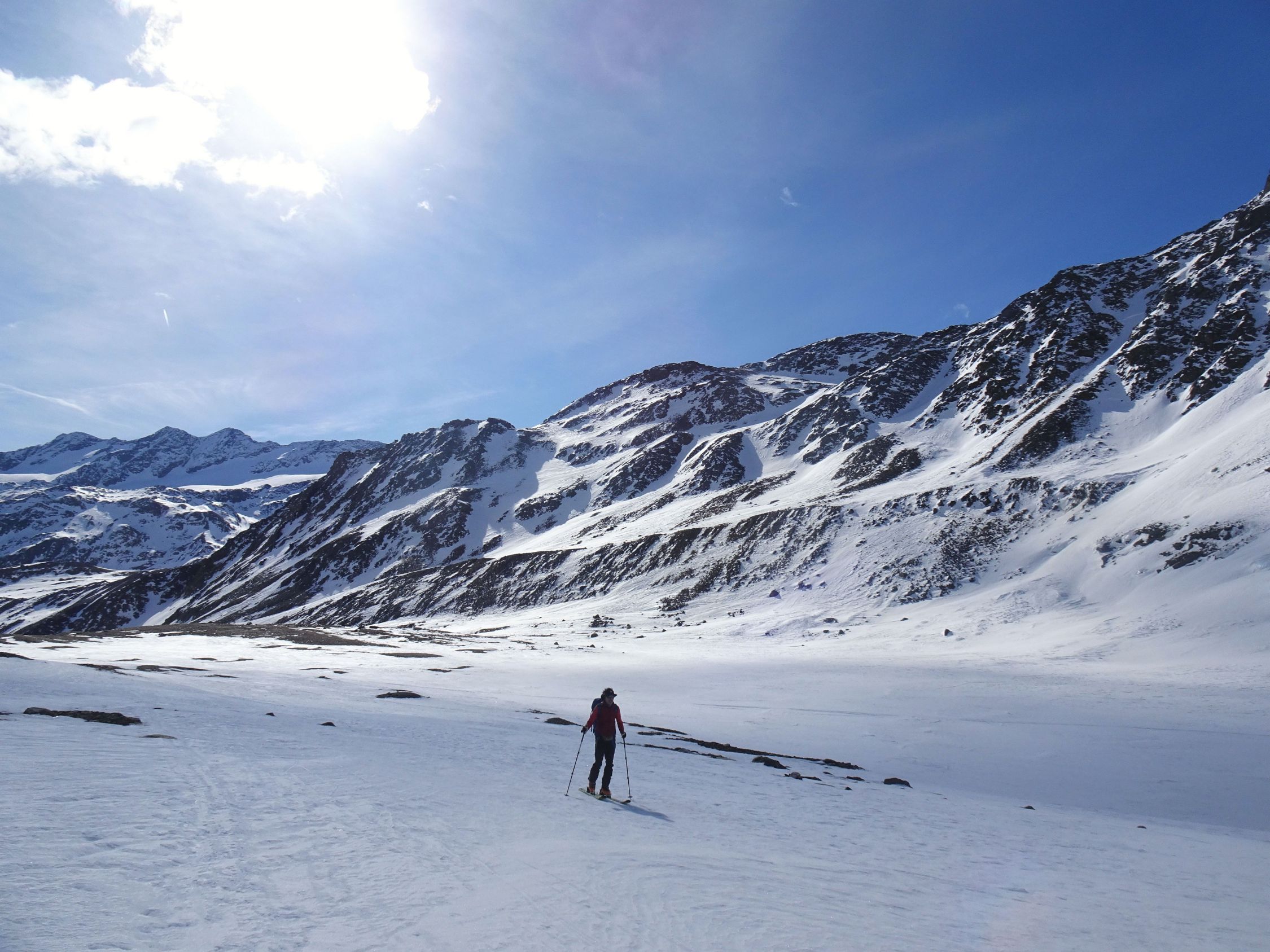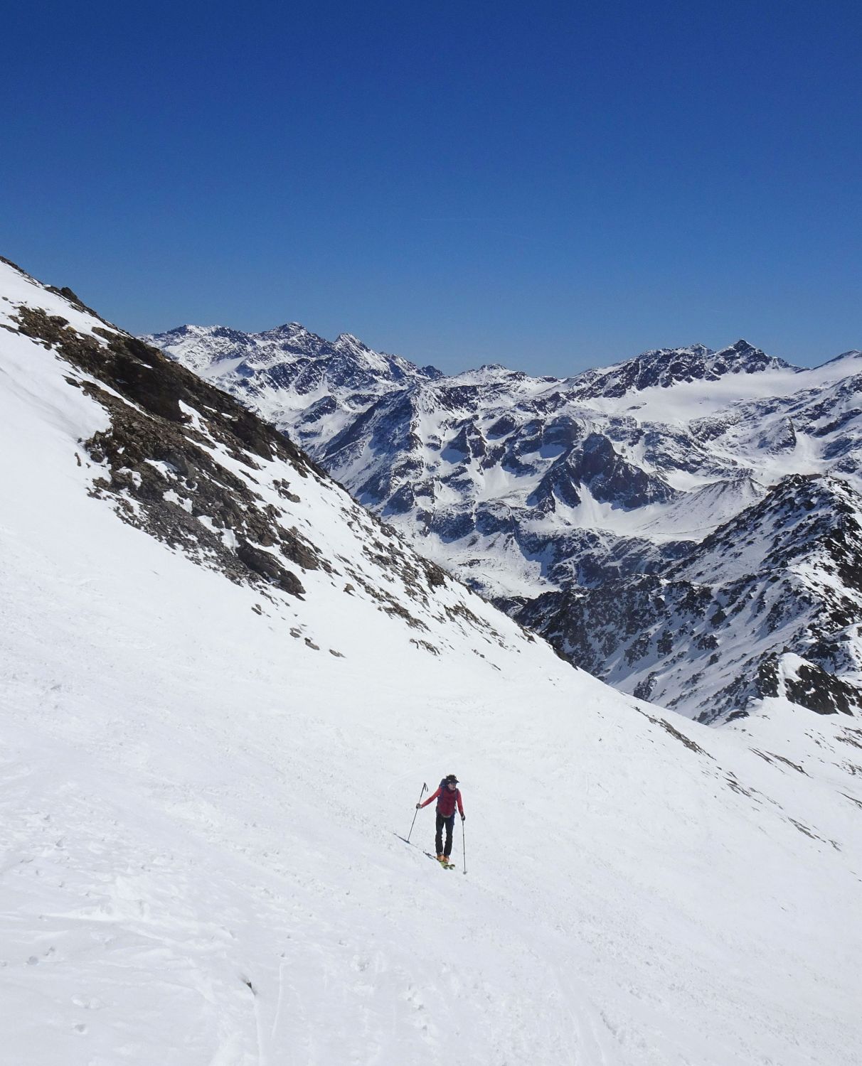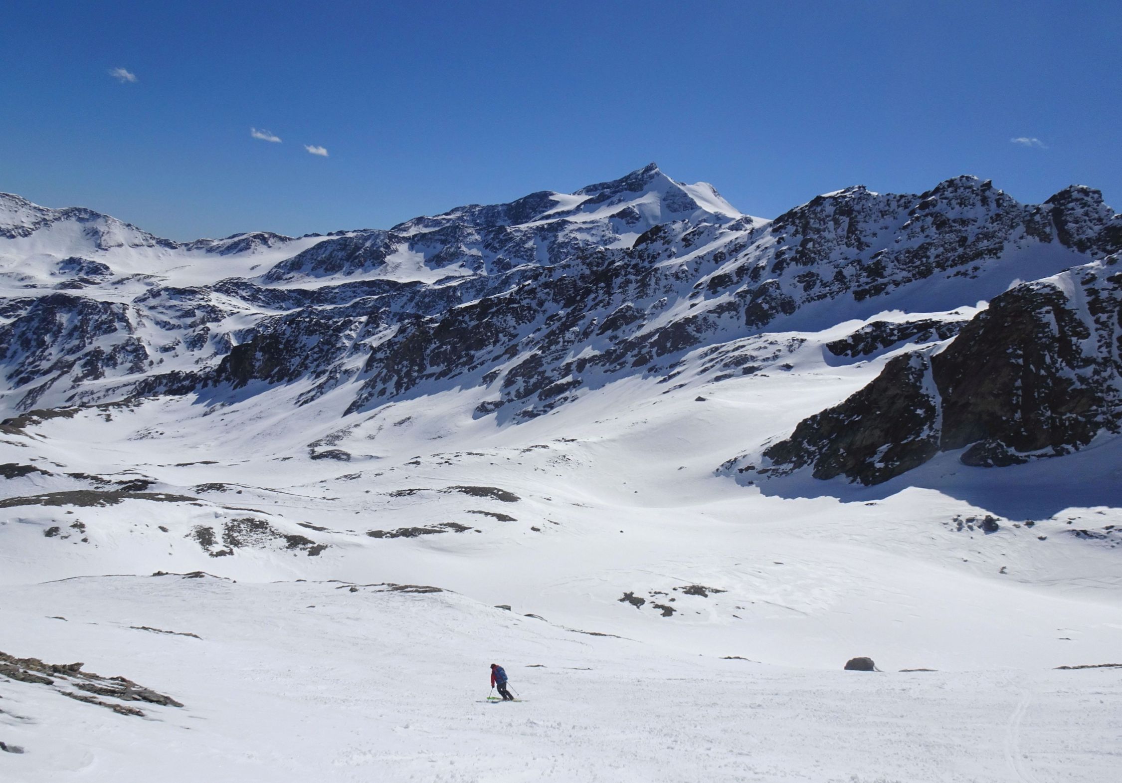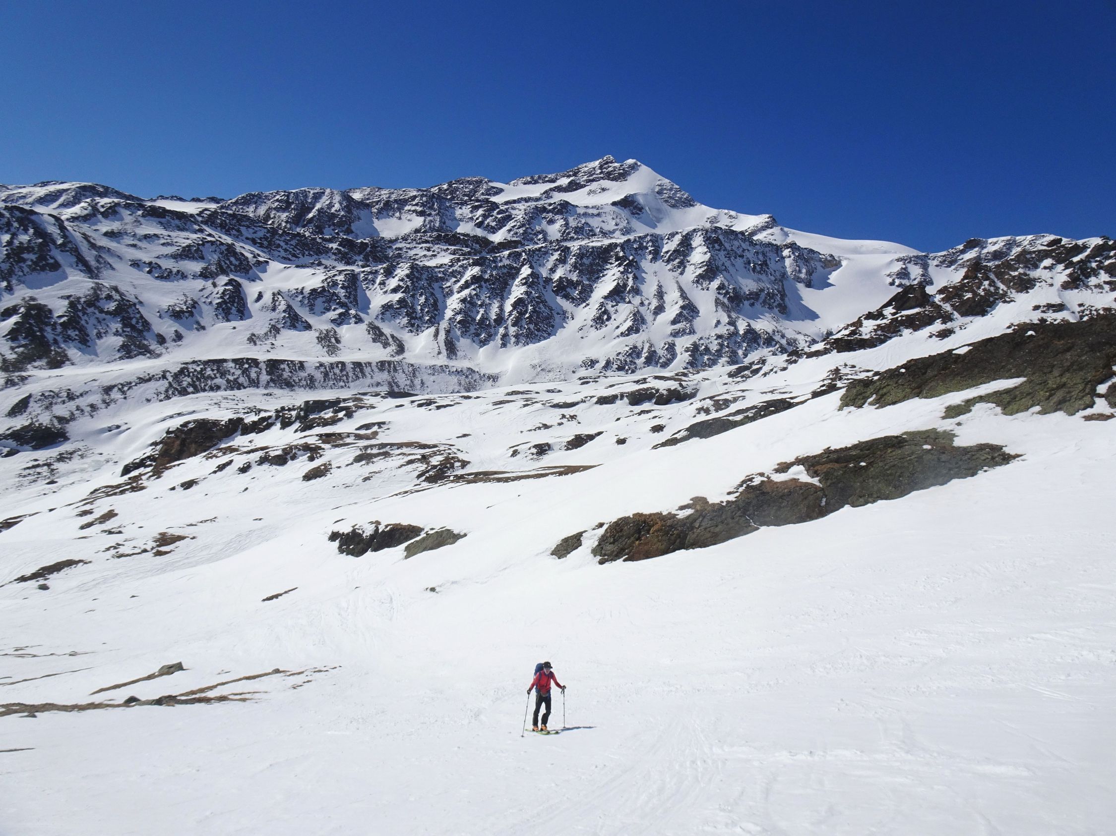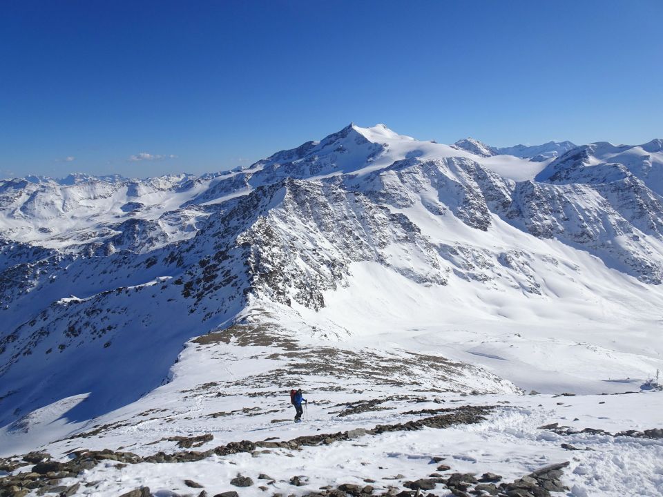 Sehr wenig Schnee im Gebiet. Südseiten bis weit hoch ausgeapert, Normalanstiege ab Hütte aber alle noch möglich. Der Hüttenzustieg wird allerdings zunehmend lückiger. Wetter bis auf Samstag jeden Tag schön. Sonnig und beste Fernsicht, aber oft kalter Wind. Am Samstag hat die Warmfront auch im Süden länger für Wolken, verhangene Gipfel und diffuse Sicht gesorgt. Wir haben für keine der Touren zusätzliche Ausrüstung gebraucht. Nicht mal Harscheisen, da der Zustieg im unteren Bereich jeweils sehr flach und weiter oben dann schon aufgefirnt war.