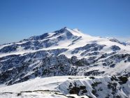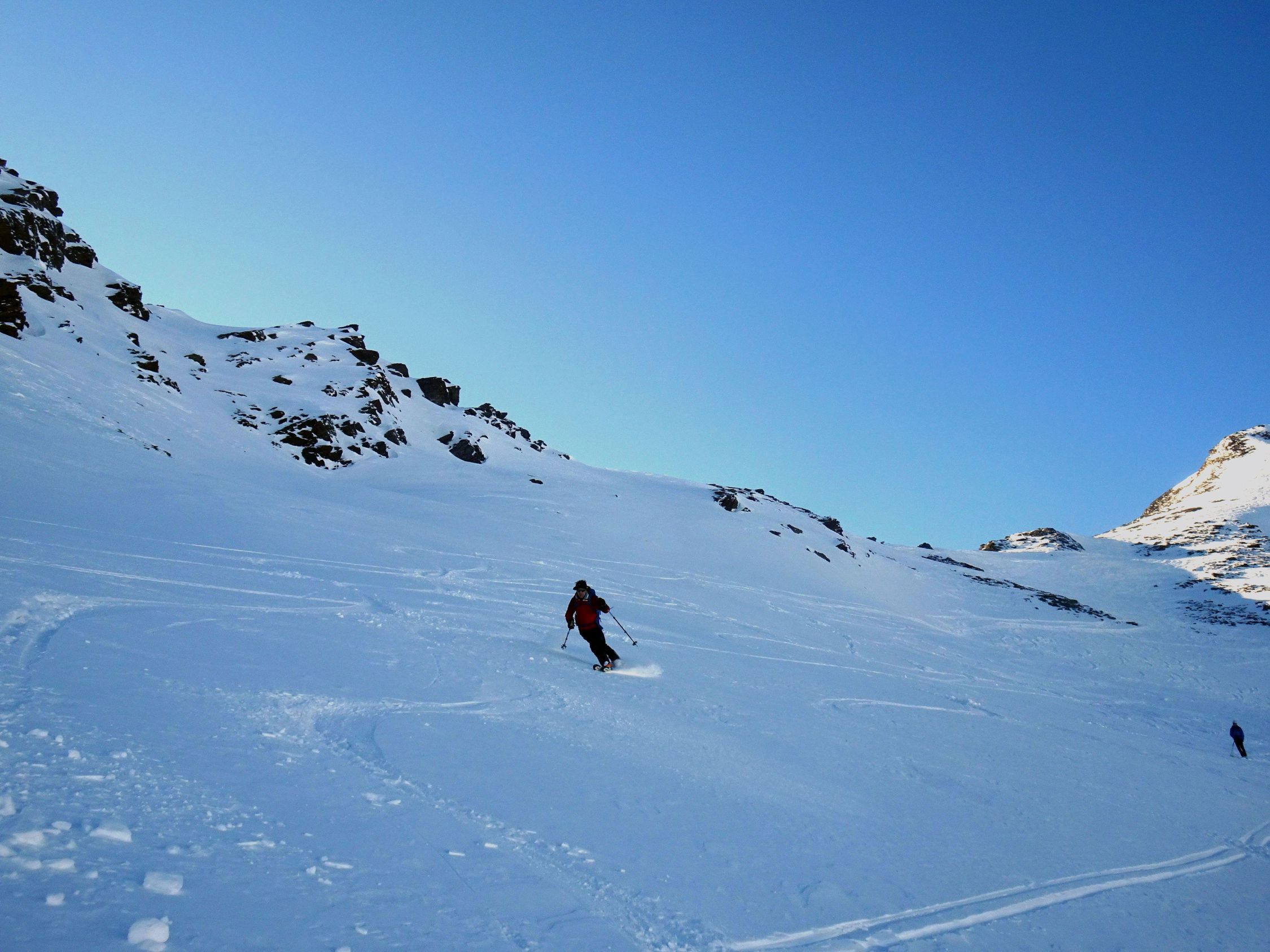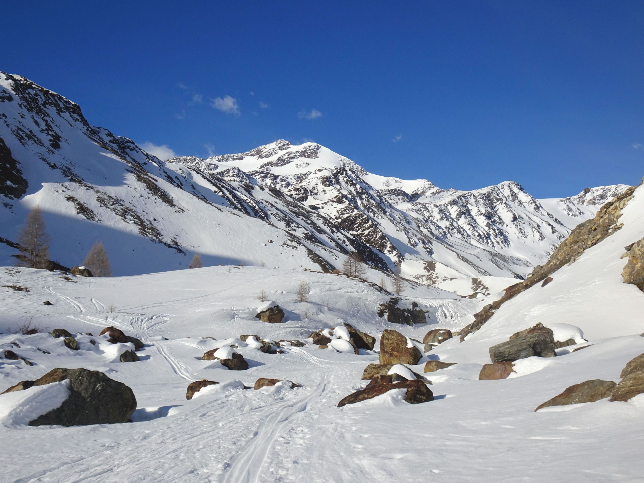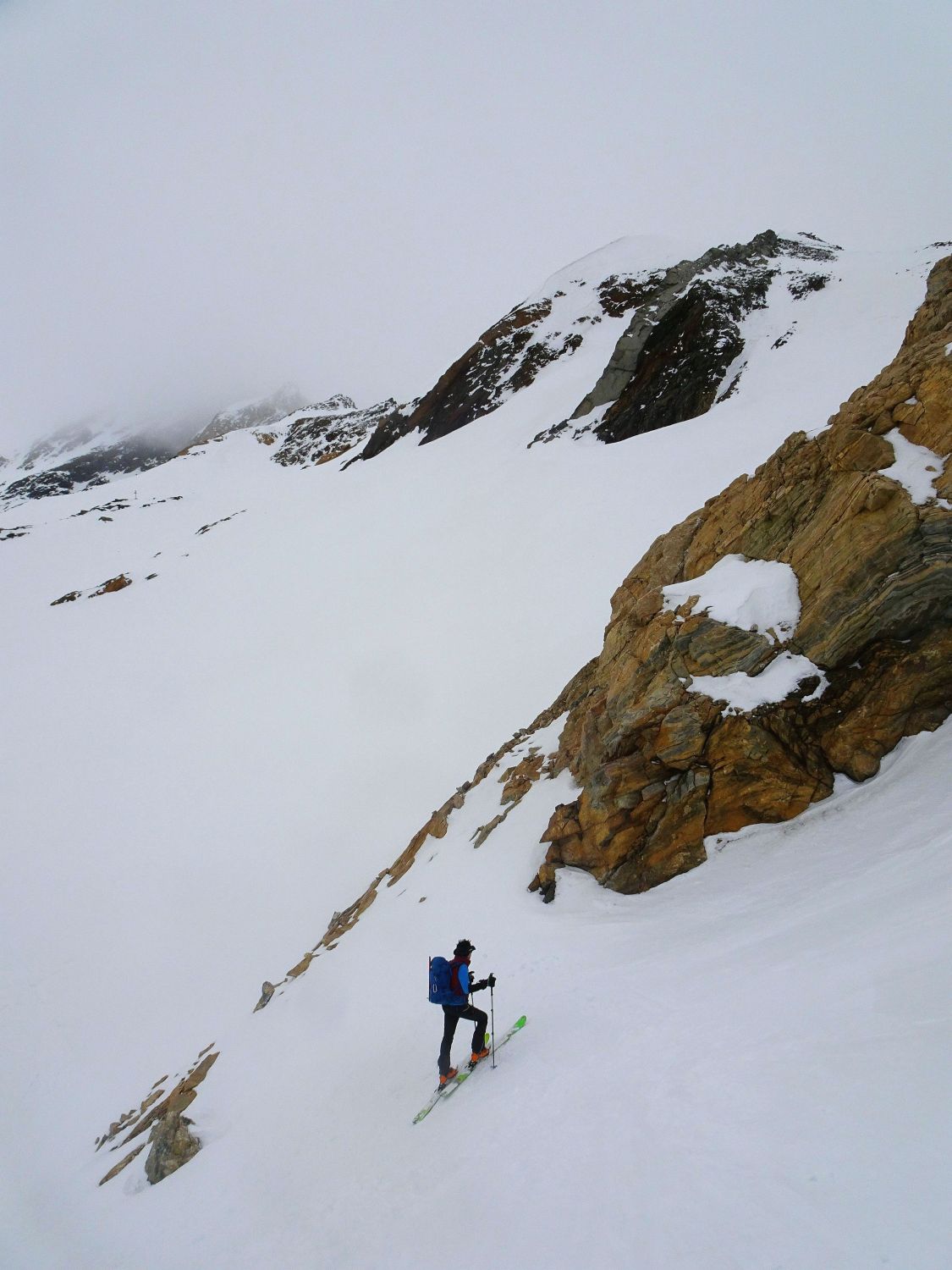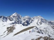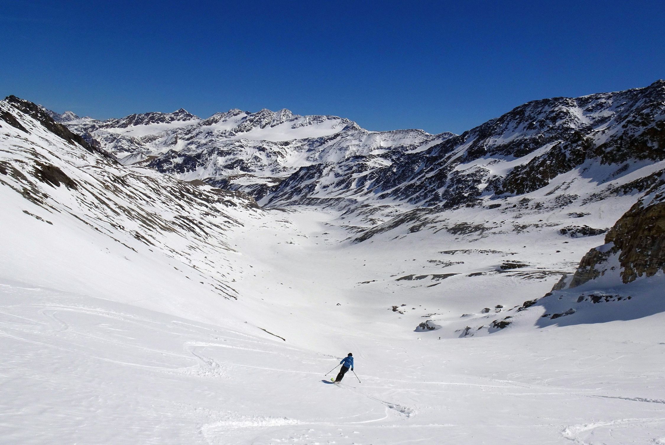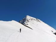Sehr wenig Schnee im Gebiet. Südseiten bis weit hoch ausgeapert, Normalanstiege ab Hütte aber alle noch möglich. Der Hüttenzustieg wird allerdings zunehmend lückiger. Wetter bis auf Samstag jeden Tag schön. Sonnig und beste Fernsicht, aber oft kalter Wind. Am Samstag hat die Warmfront auch im Süden länger für Wolken, verhangene Gipfel und diffuse Sicht gesorgt. Wir haben für keine der Touren zusätzliche Ausrüstung gebraucht. Nicht mal Harscheisen, da der Zustieg im unteren Bereich jeweils sehr flach und weiter oben dann schon aufgefirnt war.