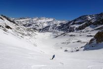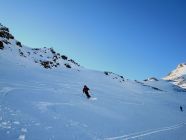 Hintere Schöntaufspitze (Fr.): Nachmittagstour nach Anreise, da die geplanten Eingehtouren (Kalfanwand, Auf den Vertainen) grün waren. Tolle Aussicht, aber am Gipfel eisiger Wind. Gipfelaufstieg etwa 100 hm zu Fuß, da steindurchsetzt, unschwierig. Abfahrt oben hart und bollig, dann nordseitig noch etwas Pulver, weiter unten deckelig, aber in eingefahrenen Bereichen ganz passabel und ganz unten gg. Abend schon wieder gefroren.