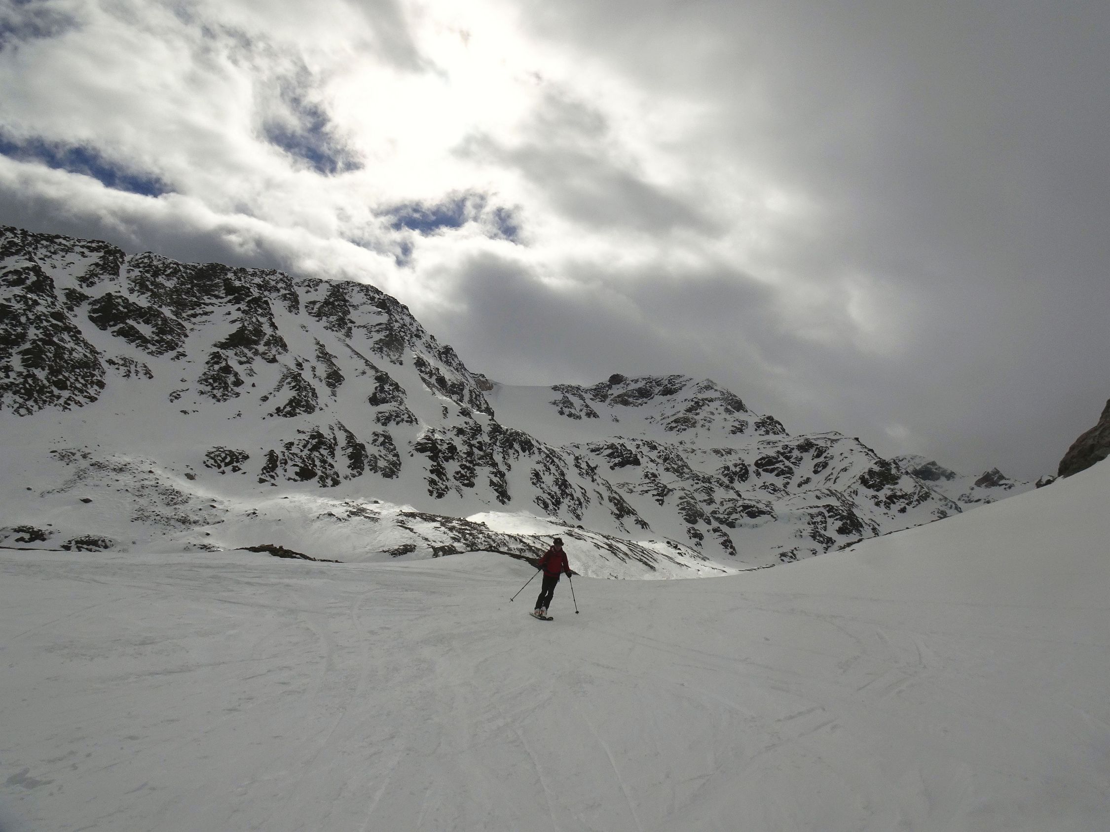 Eisseespitze (Sa.): Kühl und windig, höhere Gipfel teils in Wolken, erst nachmittags langsam besser. Sehr lange Tour, Gipfel bei Ankunft gerade nebelfrei. Abfahrt erst etwas diffus, dann zunehmend aufgelockert und schöner. Am Langferner griffig und pistenartig, nach unten hin trotz Wind und Wolken schon firnig.