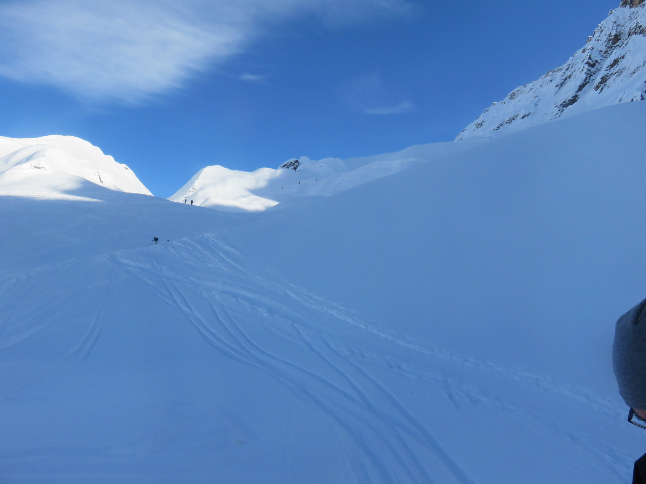 Sehr gute Verhältnisse, es liegt viel Pulver auf guten Untergrund. Der Abschnitt durch den lichten Lerchenwald ist leicht Anspruchsvoll. Aber mit Rutschen und mutigem Fahrenlassen geht es gut.