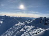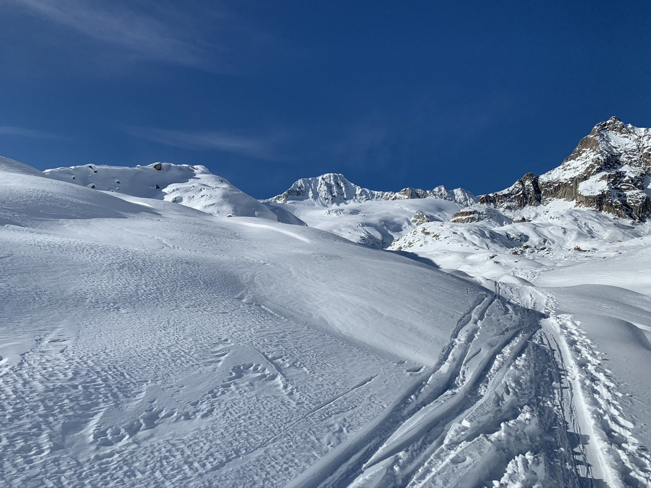 Erste glatte Stellen in der Spur, Schnee zumeist gedeckelt, in der Sonne leicht angefirnt, nur noch in Schattenhängen und vereinzelt powder.