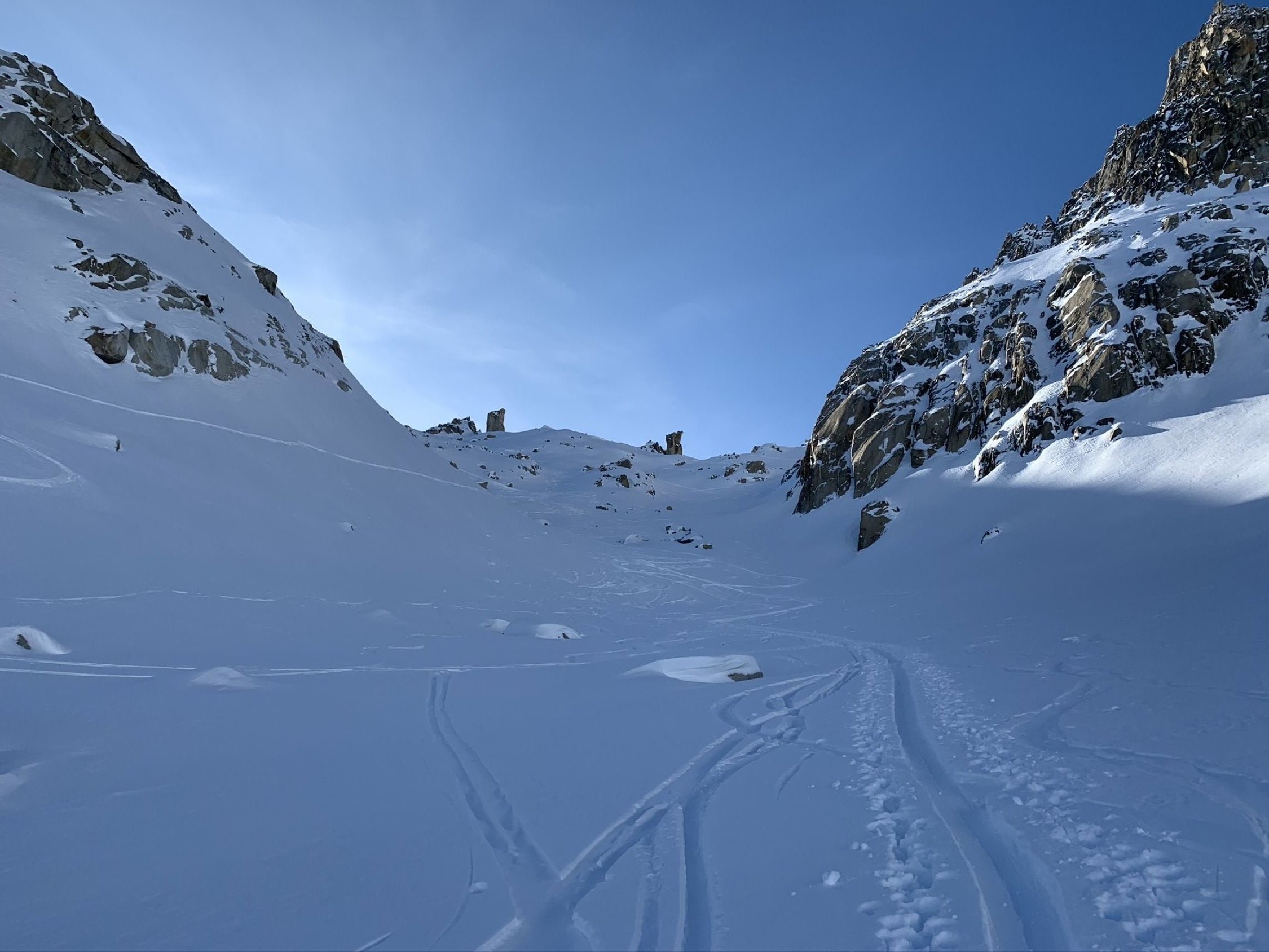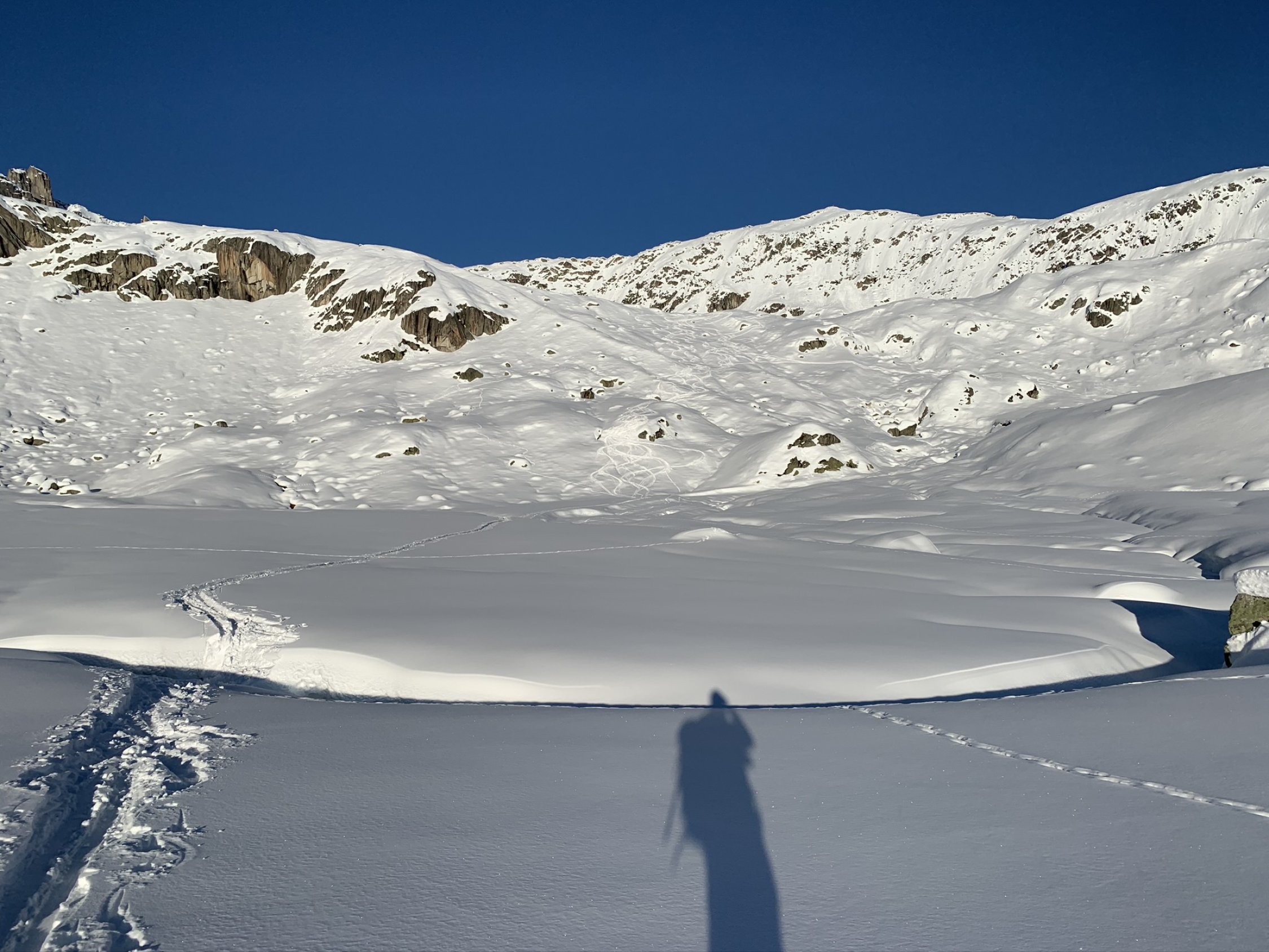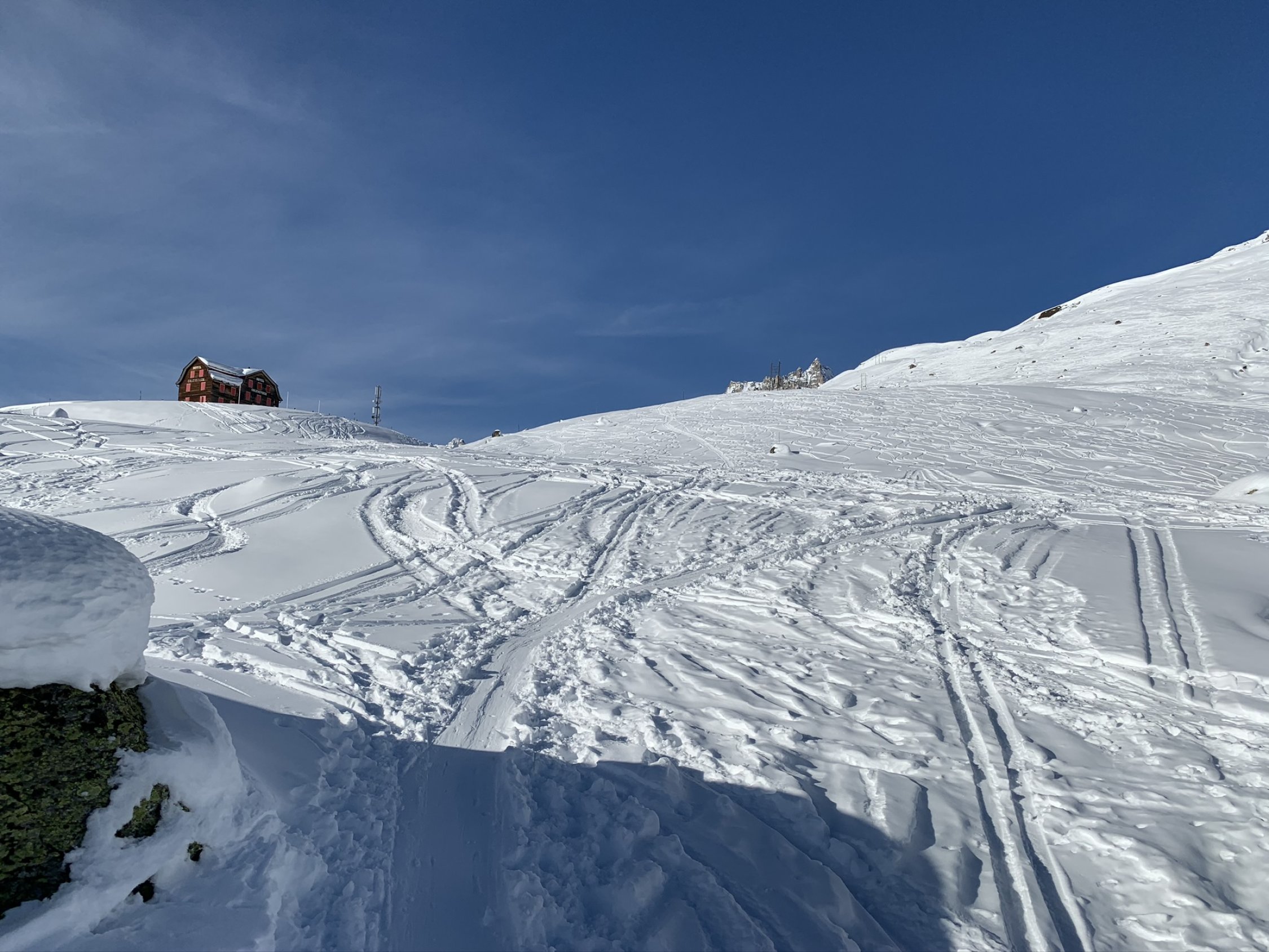 Der erste Teil der Abfahrt bis nordöstlich Chrajennest zumeist Pulver, dann inhomogen (weich - gedeckelt) und anstrengend das Älpetli hinab zur Passstraße. (Die Variante westlich des Chrajennest wurde auch von wenigen gefahren)