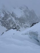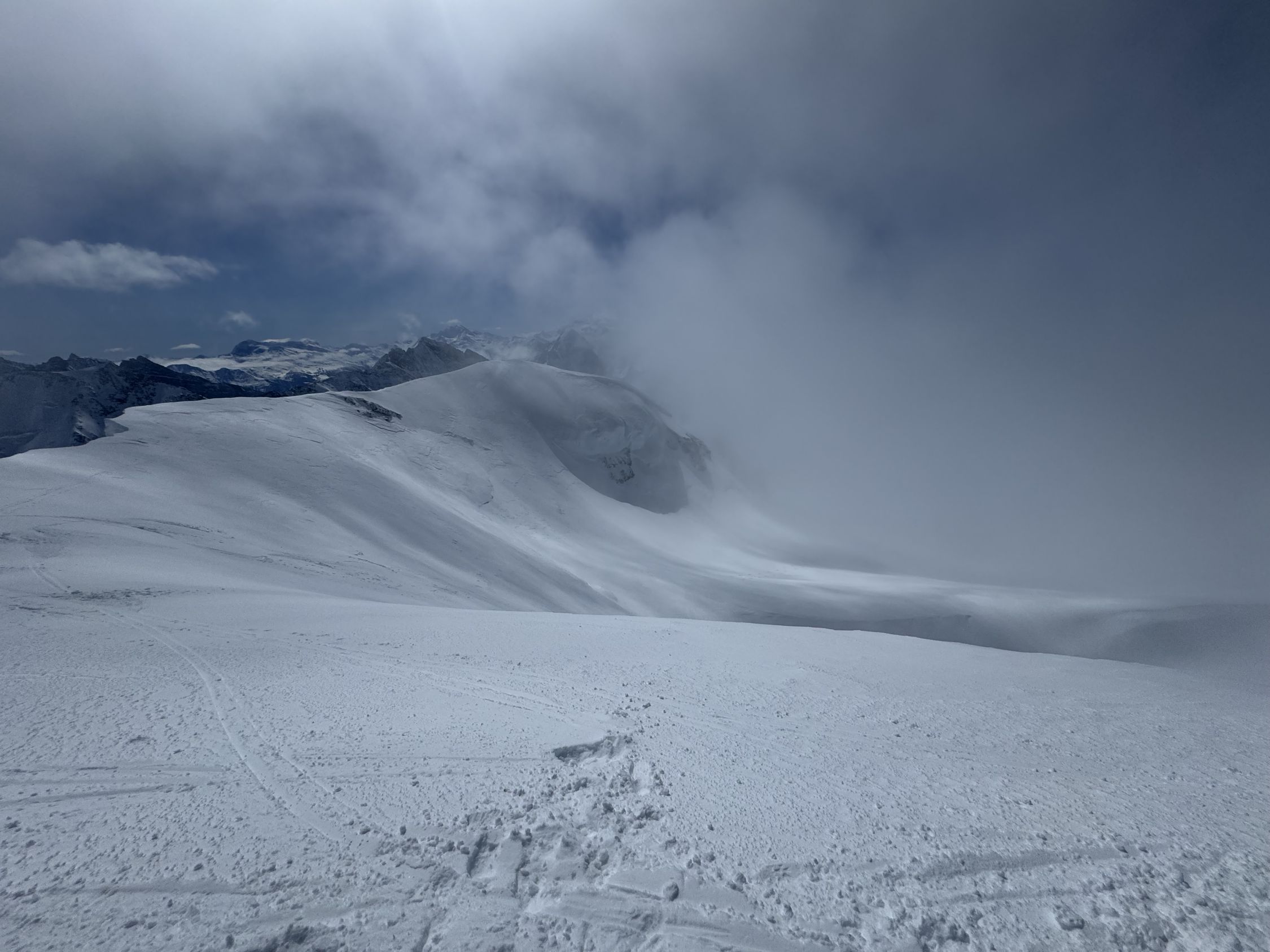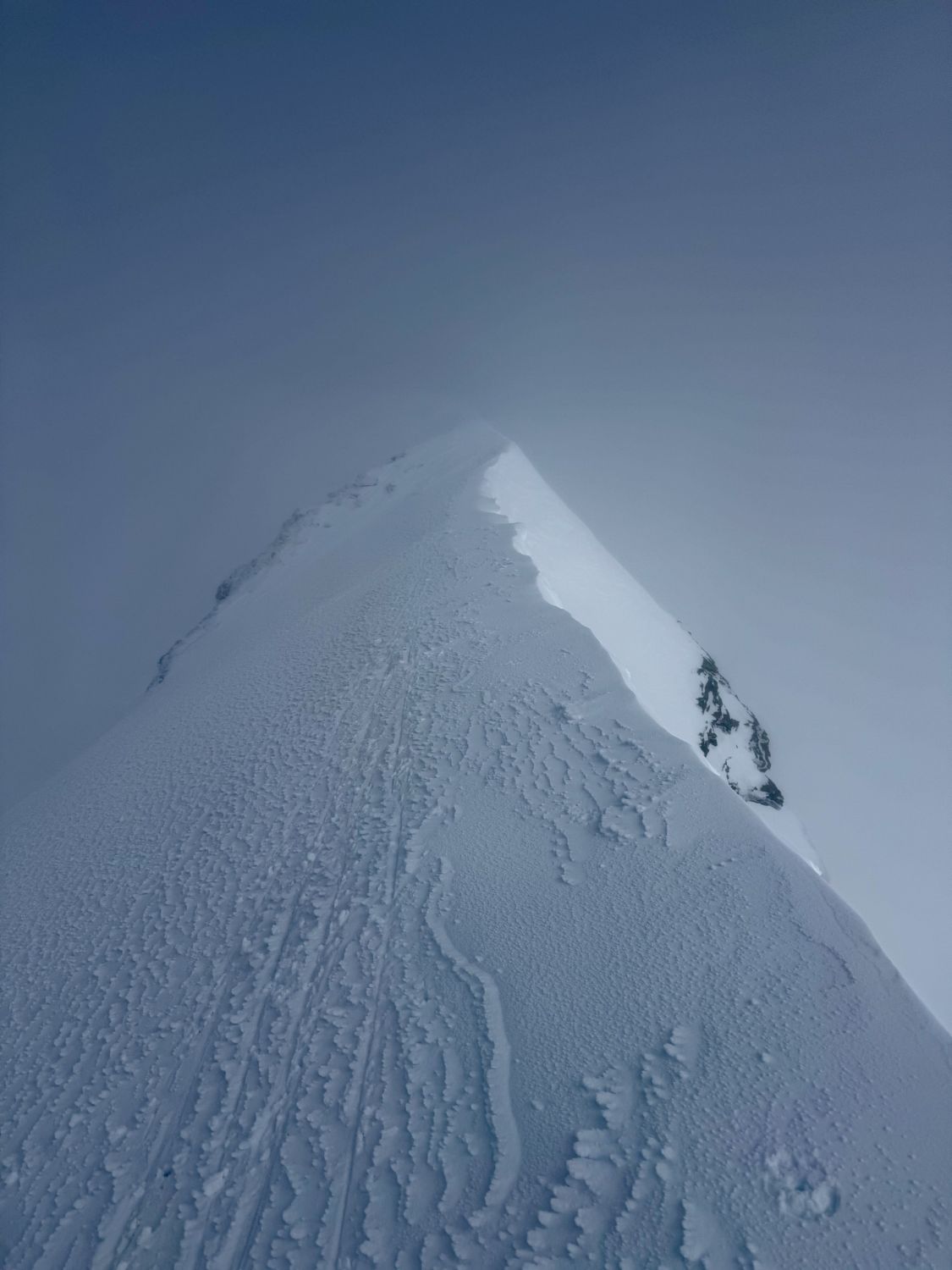 Wetter gemäss Prognose und daher bewusst später Start um ca. 08:15 Uhr ab Hollandiahütte. Sicht über den Äbeni Flue-Firn mit Bewölkung zwischenzeitlich auf ca. 150 - 200m eingeschränkt. Aufstieg zum Anujoch jedoch problemlos. Ab dort mit Steigeisen und aufgebunden Skis und weiter über den anfänglich schmalen Grat bzw. über den Südgrat via Vorgipfel zum Hauptgipfel. Kurz vor dem Vorgipfel wieder auf die Skis gewechselt (Harscheisen waren nicht nötig; vielen Dank den beiden Geb. Spez. für die Spurarbeit zu Fuss - you guys are charing!). Ausgedehnte Pause (ca. 1h) auf dem Gipfel bis es kurz nach 12:00 Uhr wie eben prognostiziert aufriss. Abfahrt über den Anungletscher oben in gutem Pulver und weiter unten bereits bei Firnverhältnissen in Richtung Anenhütte. Kurz danach rüber auf die Route von der Lötschenlücke. Ab dort Bremsschnee. Die Umgehung der Sperrzone bei Blatten war mühsam (gefühlte 50 mal Ski an und ab im zusätzlichen Anstieg bzw. in der Abfahrt nach Wiler; + 2h).