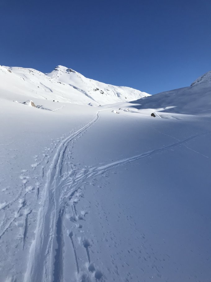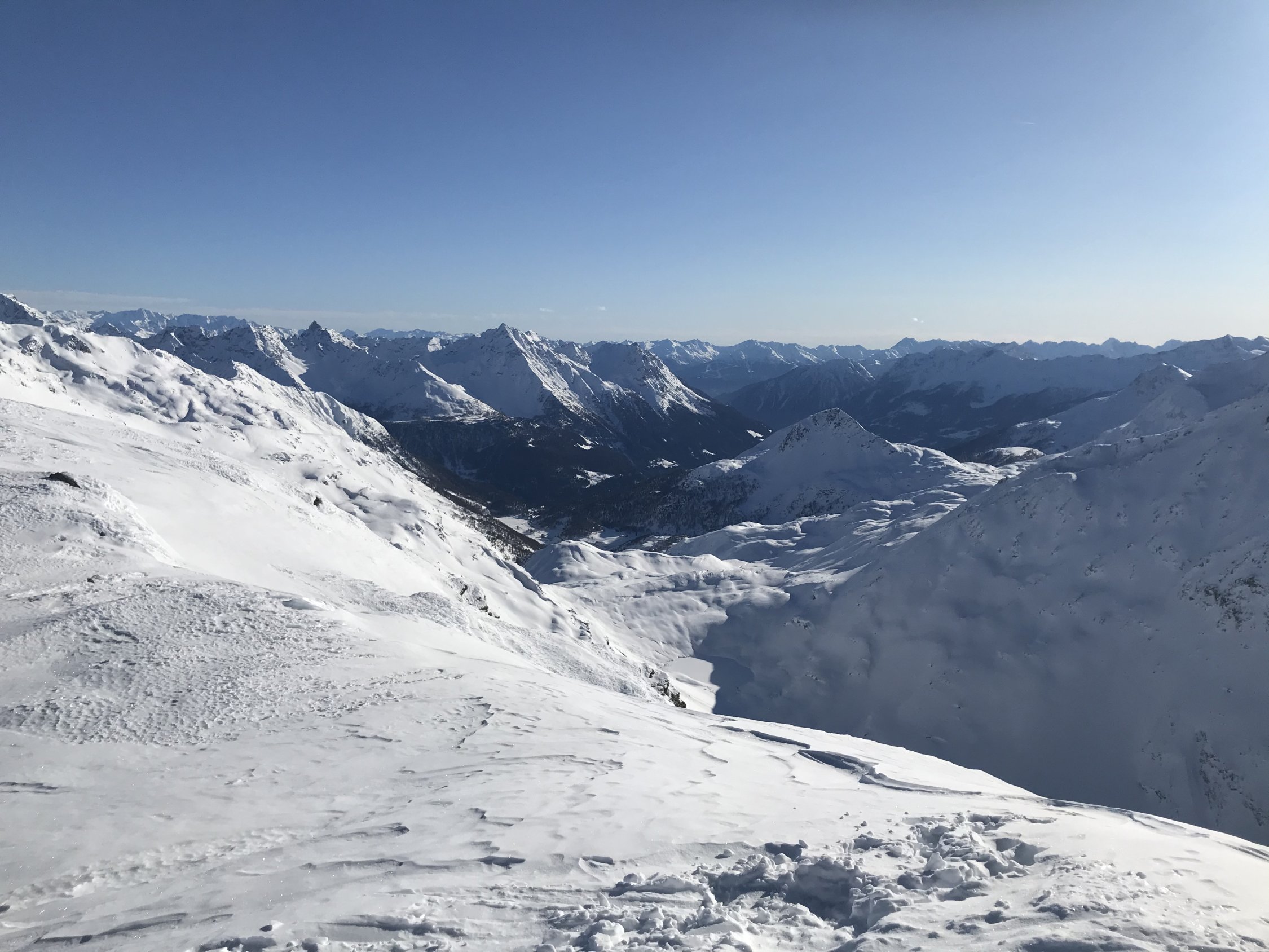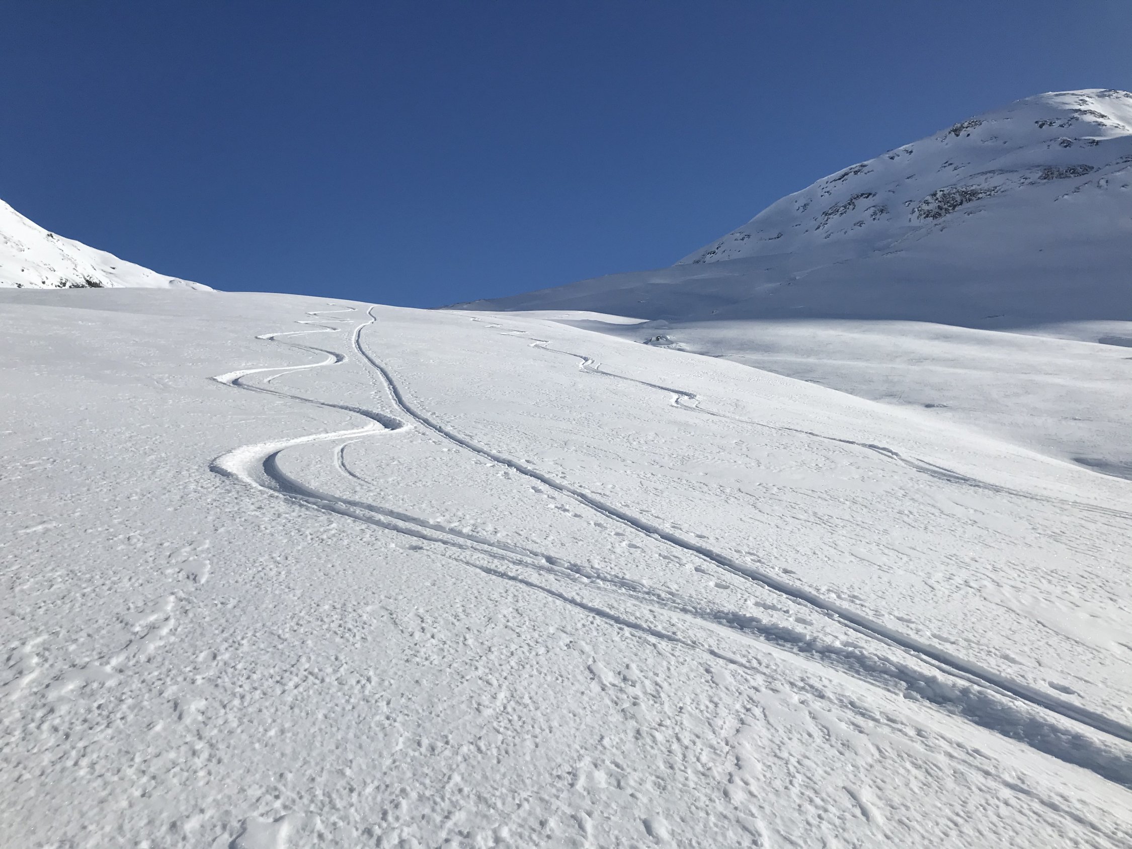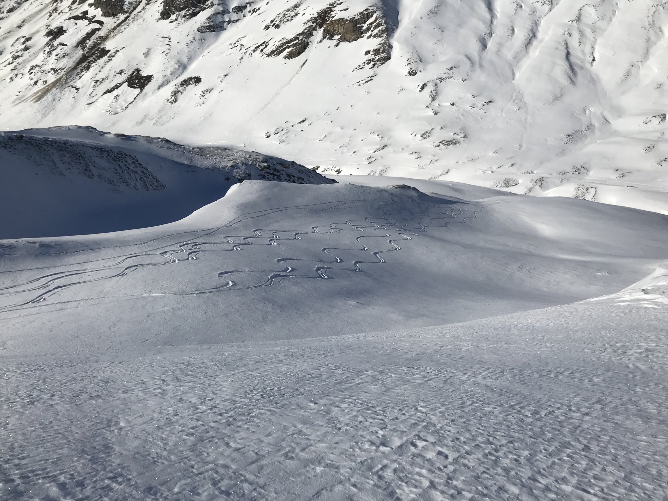 Gut verfestigte Basis, darauf in den Nordhängen 20 cm Pulver, selten etwas verblasen. Südhänge haben in den letzten Tagen sichtbar gelitten. Ab 40 Grad auf Grasnarbe weggerutscht.
