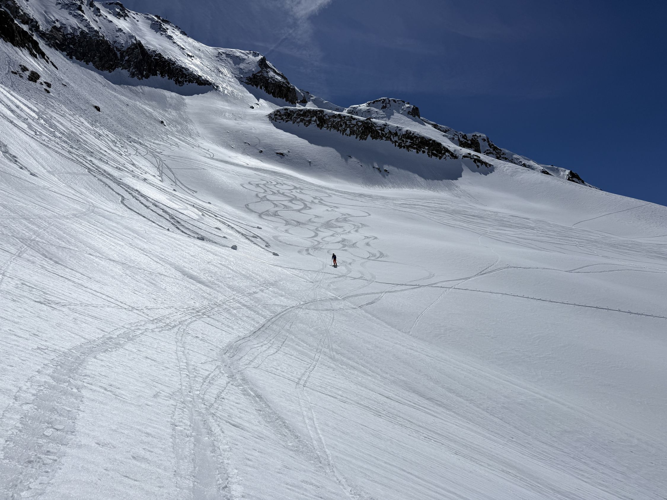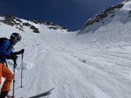 Abfahrt (ca. 12.30) bis Lücke zuerst Presspulver, dann schon recht tiefer Sulz. Die ersten 50 HM ab Lücke hart, garniert mit Lockerschneelawinen, danach bis 2150 schöner, gut drehender aufgesulzter Schnee. Durch das Tal hinaus langsamer Nasschnee.