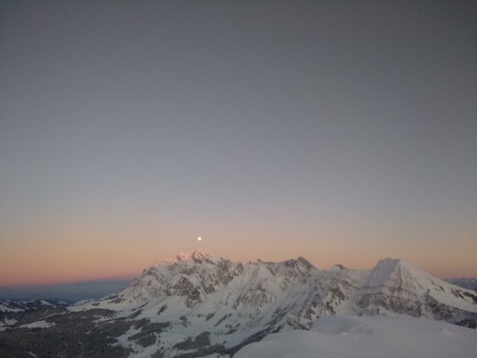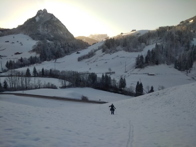Unten 10cm Schnee auf Gras, oben ca. 40cm. Dank sanftem Gelände gut machbar in Aufstieg und Abfahrt. Bodenkontakt logischerweise nicht ausgeschlossen, trotzdem lohnende Skiverhältnisse. Schnee grösstenteils schön pulvrig, nur an den steilen, sonnenexponierten Hängen bereits etwas schwer