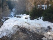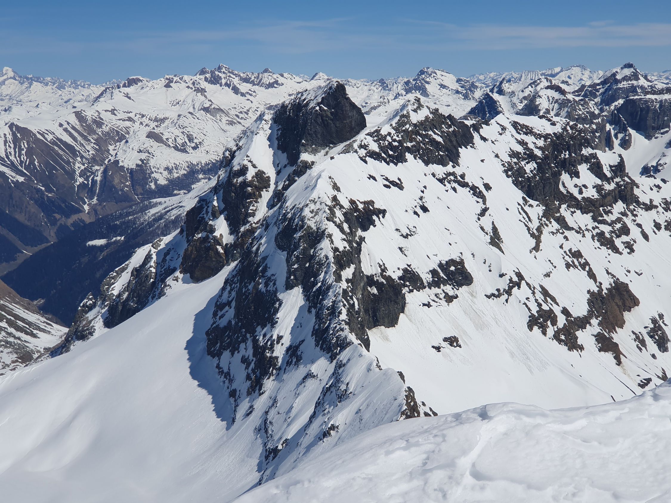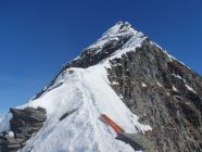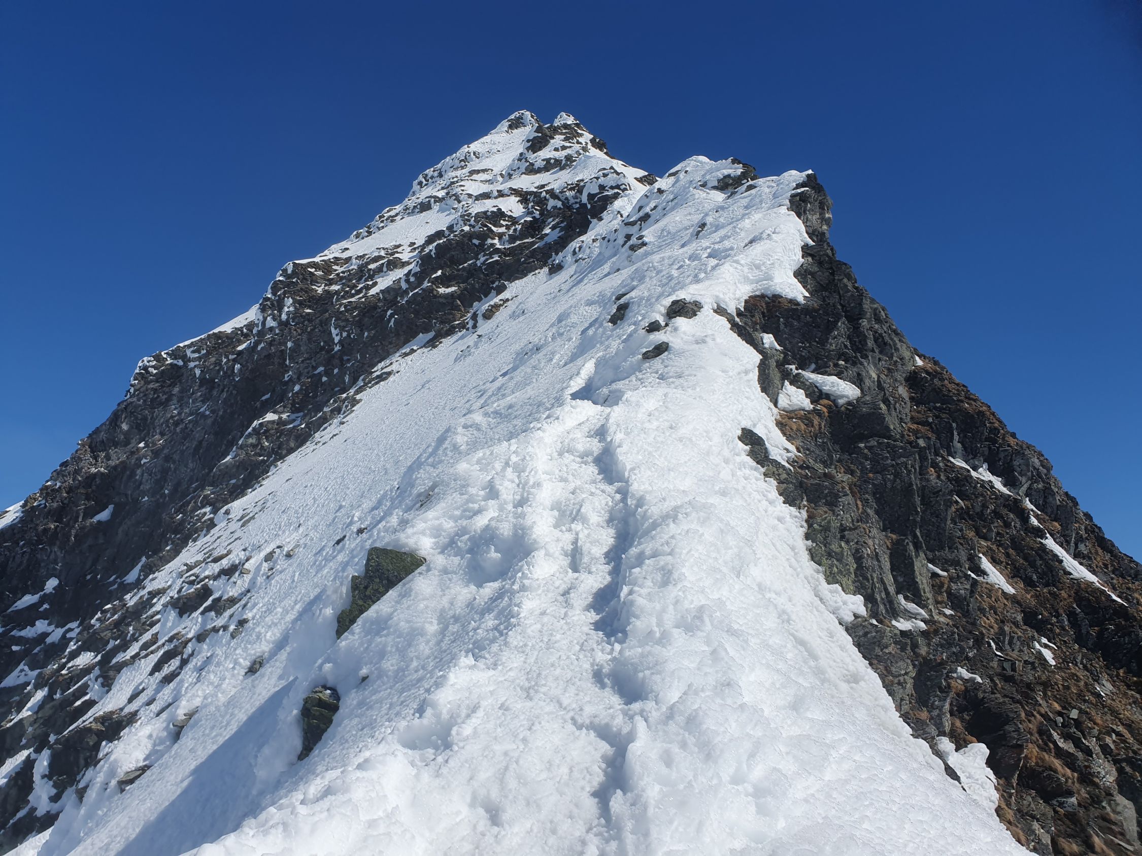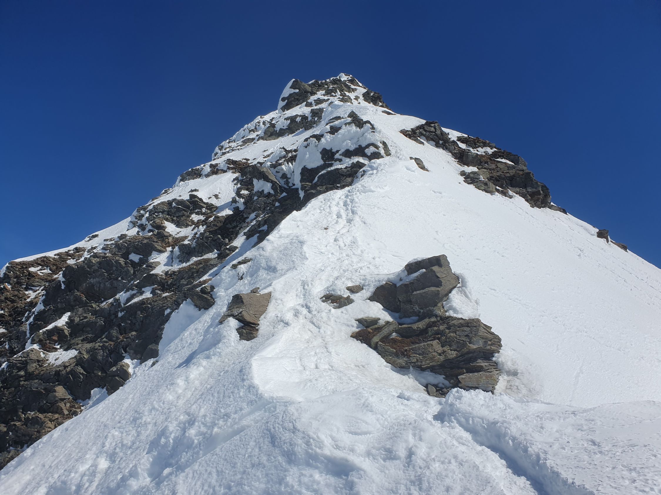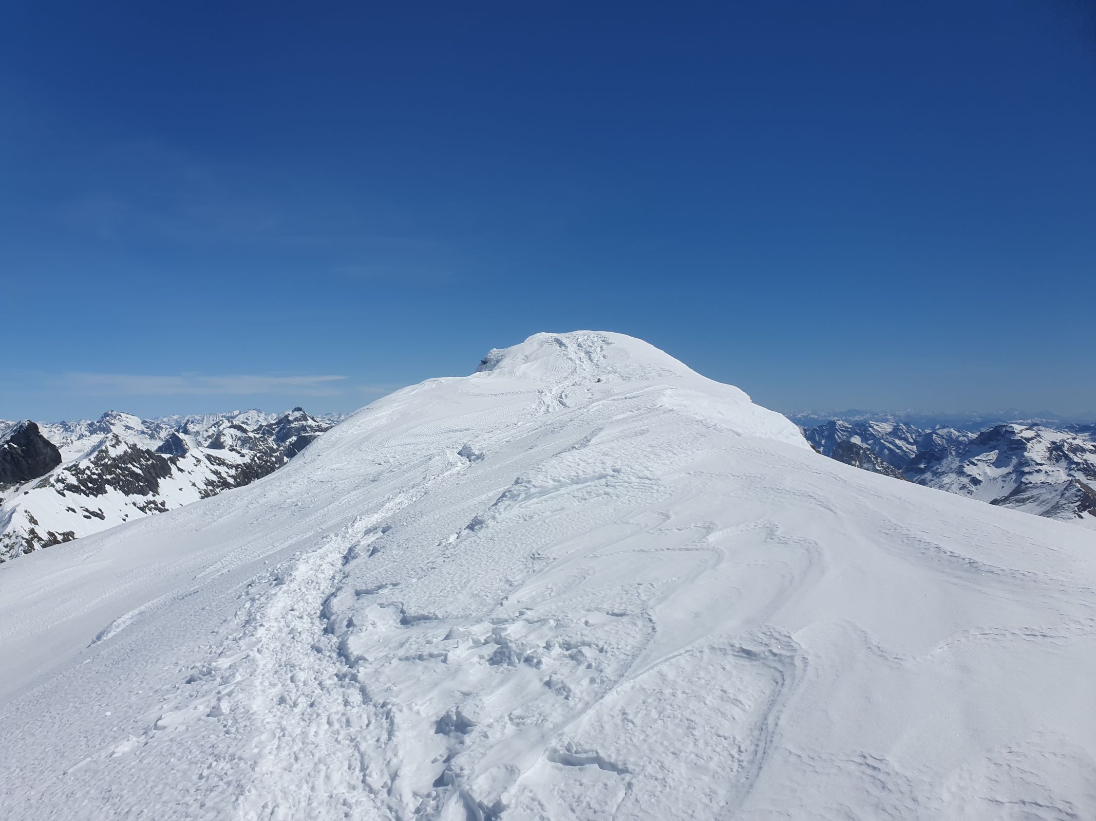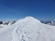 Mit Steigeisen und Pickel stieg ich auf dem SW-Grat auf guten Trittspuren in Richtung Gipfel. An einigen Stellen ist der Grat schmal, so, dass die Fusssetzung doch etwas Konzentration benötigte. Ziemlich am Anfang kommt eine kurze Kletterstelle (I+), dann im Gehgelände bis zum letzten Drittel des Grats, wo eine weitere Stelle von 5 Meter die Hände benötigt (II-) und kurz vor dem Gipfel eine abschüssige Passage von 10 Meter (II) mit einem Sicherungsring bestückt. Das erwähnte Fixseil hier ist nicht mehr vorhanden, ausser versteckt und sehr gut eingeschneit? Alle Kletterpassagen befinden sich südlich des Grats, was heute aufgrund der hohen Schneemengen und zu warmen Temperaturen sicher nicht ideal war.