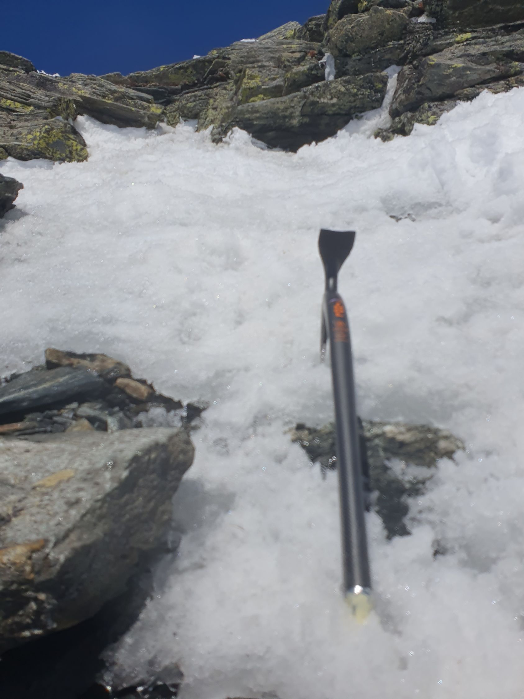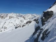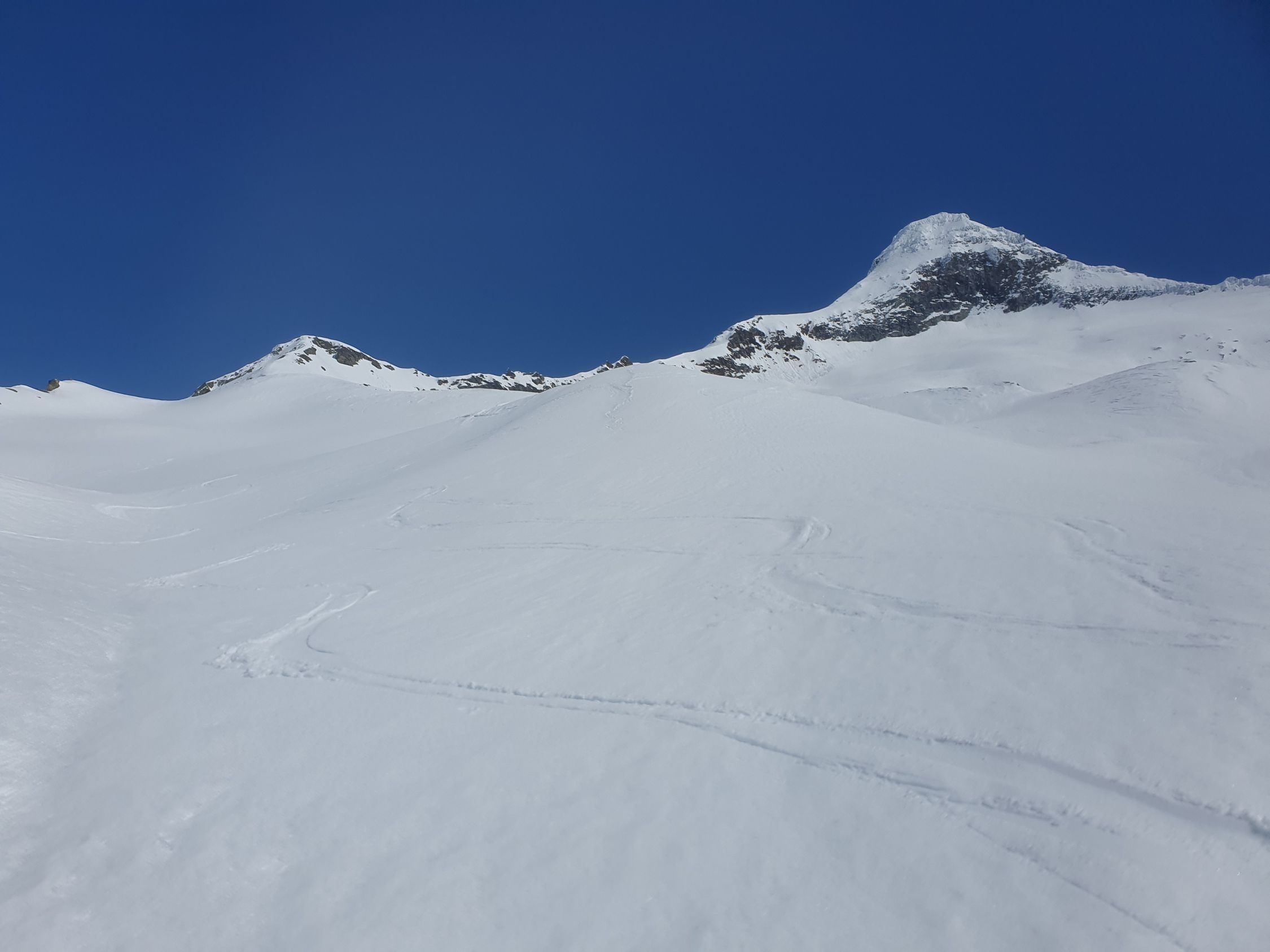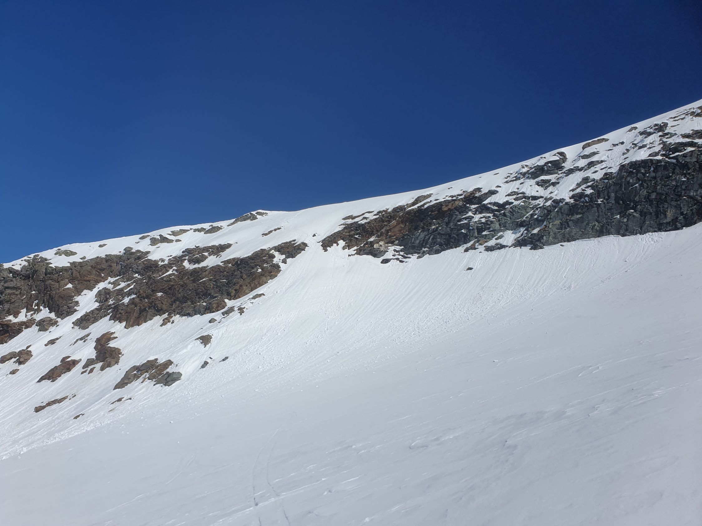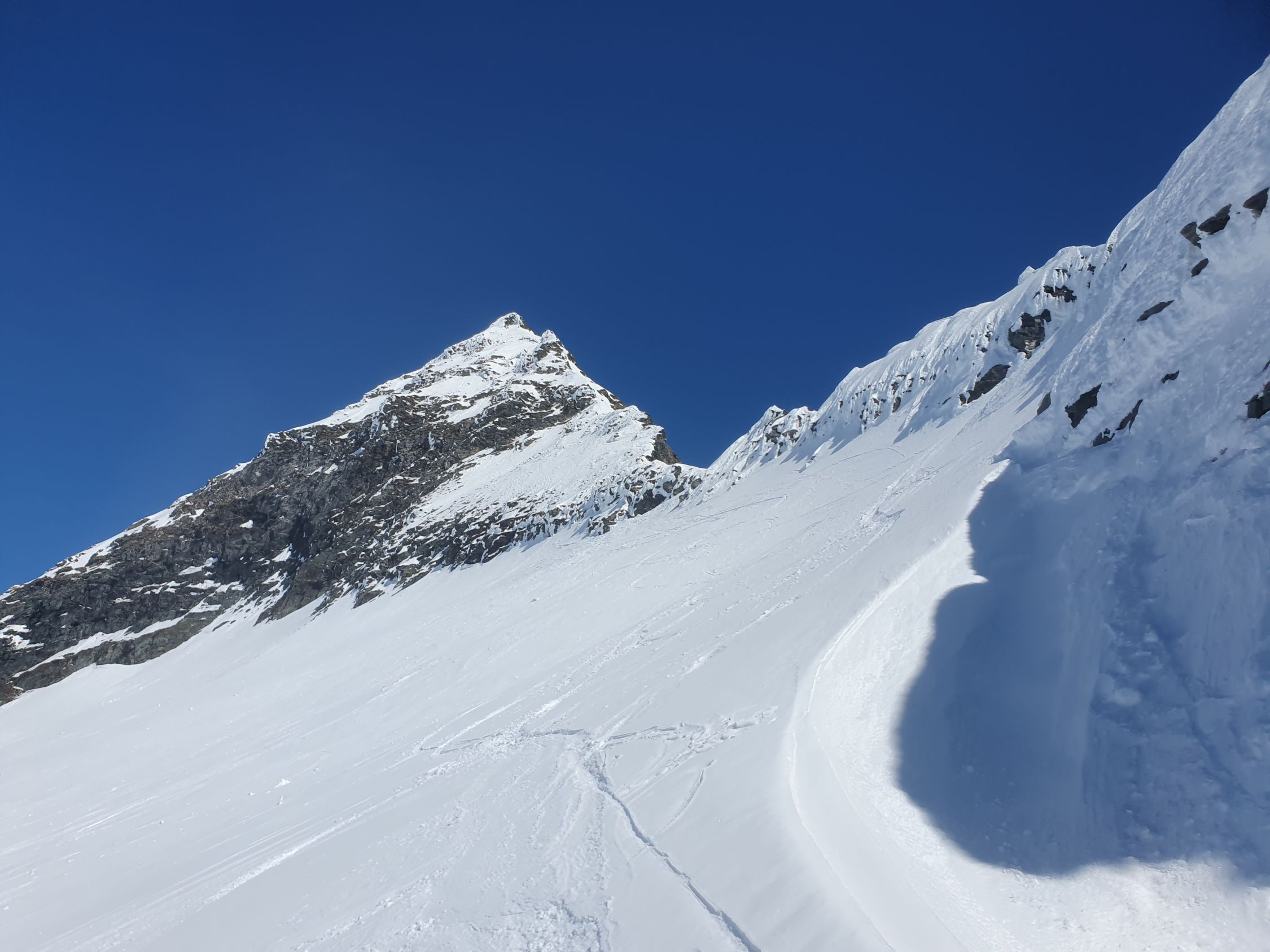 Danach angenehm auf tragendem Schnee nach E und zuletzt auf gepresstem Pulver zum S-Grat. Der Skidepot befindet sich 10 Meter unter dem SW-Grat (ca. 2945Hm). Ich stieg zuletzt noch sehr rutschig mit den Ski bis zum Grat, was, aufgrund von Platzmangel, völlig unnötig war.