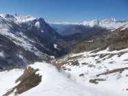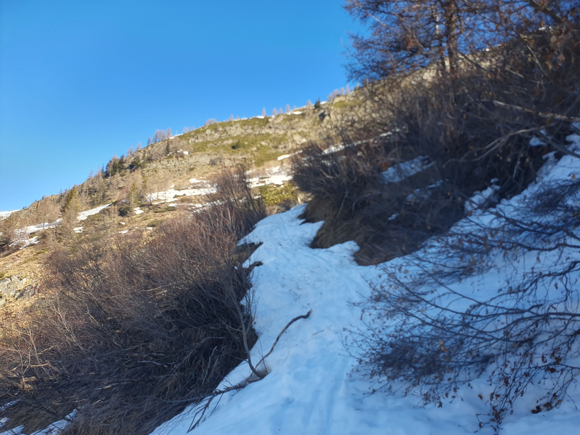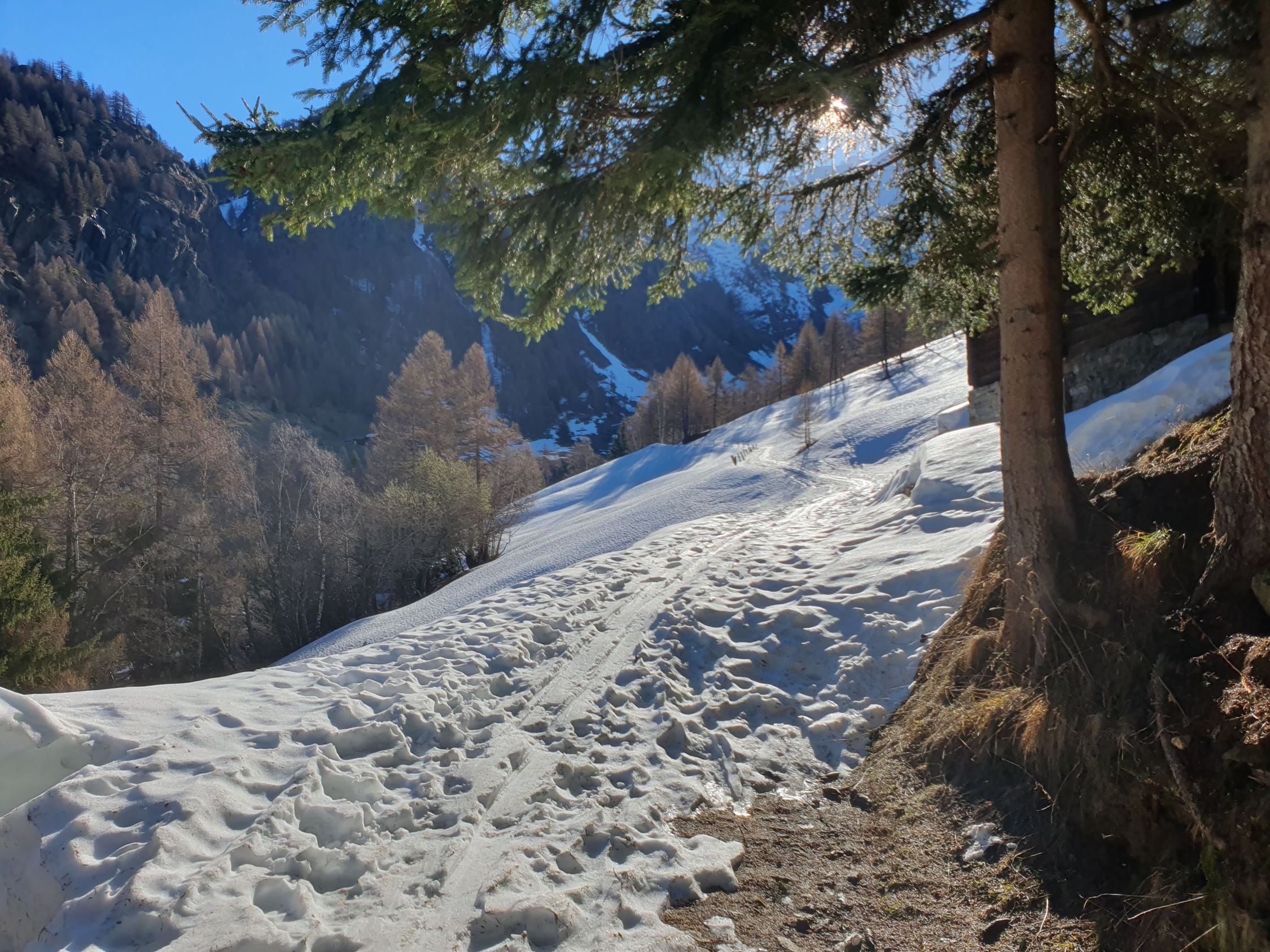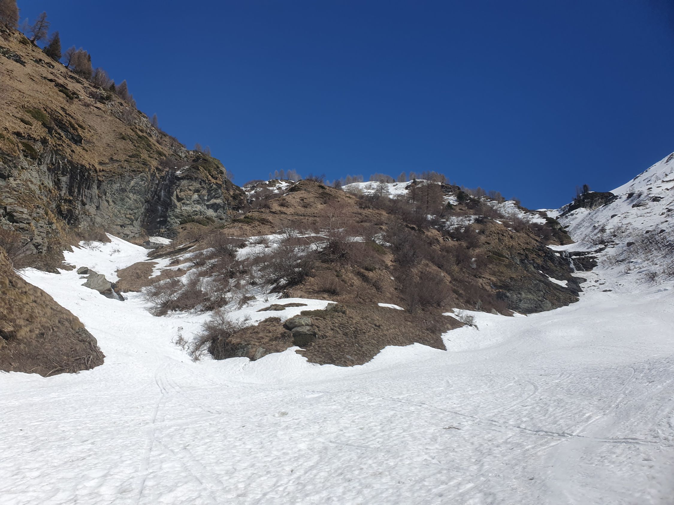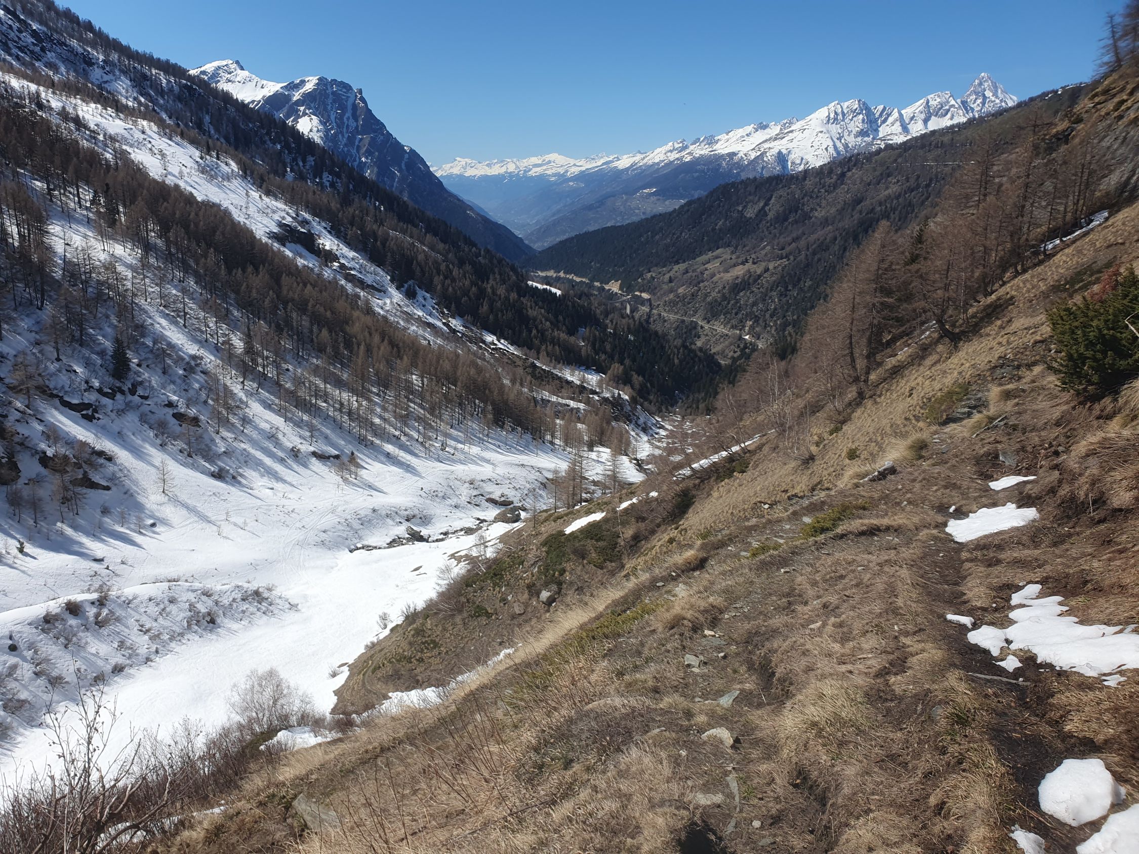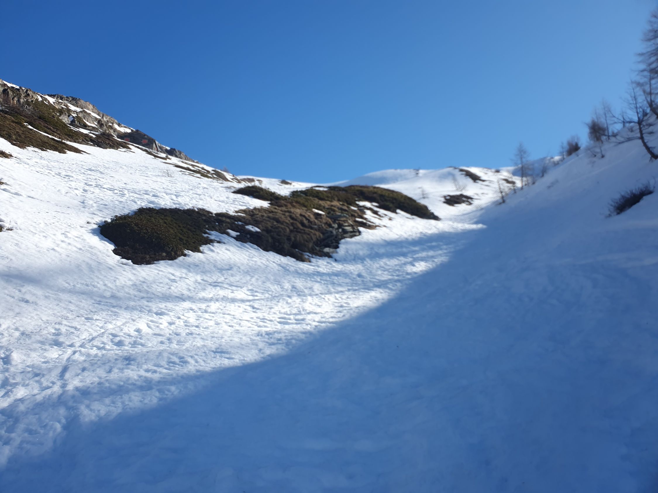 Start um 09:00 bei weit über 0 Grad warmen Temperaturen ab der ÖV-Bushaltestelle "Berisal Kehr", wo die Ski auf einer durchgehend geschlossenen Schneedecke bereits angeschnallt werden können. Interessant ist die Tatsache, dass nördlich im Sonnenhang alles grün- und südlich im Schatten noch immer viel Schnee liegt. Der Kontrast könne nicht klarer sein. Bei Färrich, wo die Bäche zusammen kommen, ist der Schnee doch schon geschmolzen. So musste ich auf dem Sommerweg zwischen 1750Hm und 1850Hm kurz die Ski tragen. Weiter stieg ich steil auf dem Wanderweg auf griffigem Hartschnee in Richtung Bortelhütte. Durch eine sich aufsteilende Mulde unterhalb der Bortelhütte vorbei auf bereits leicht aufgesulztem Schnee. Um keine Spitzkehren machen zu müssen, habe ich viel Armeinsatz leisten müssen, was südlich auf der Mulde, wie ich später feststellen musste, gar nicht nötig gewesen wäre.