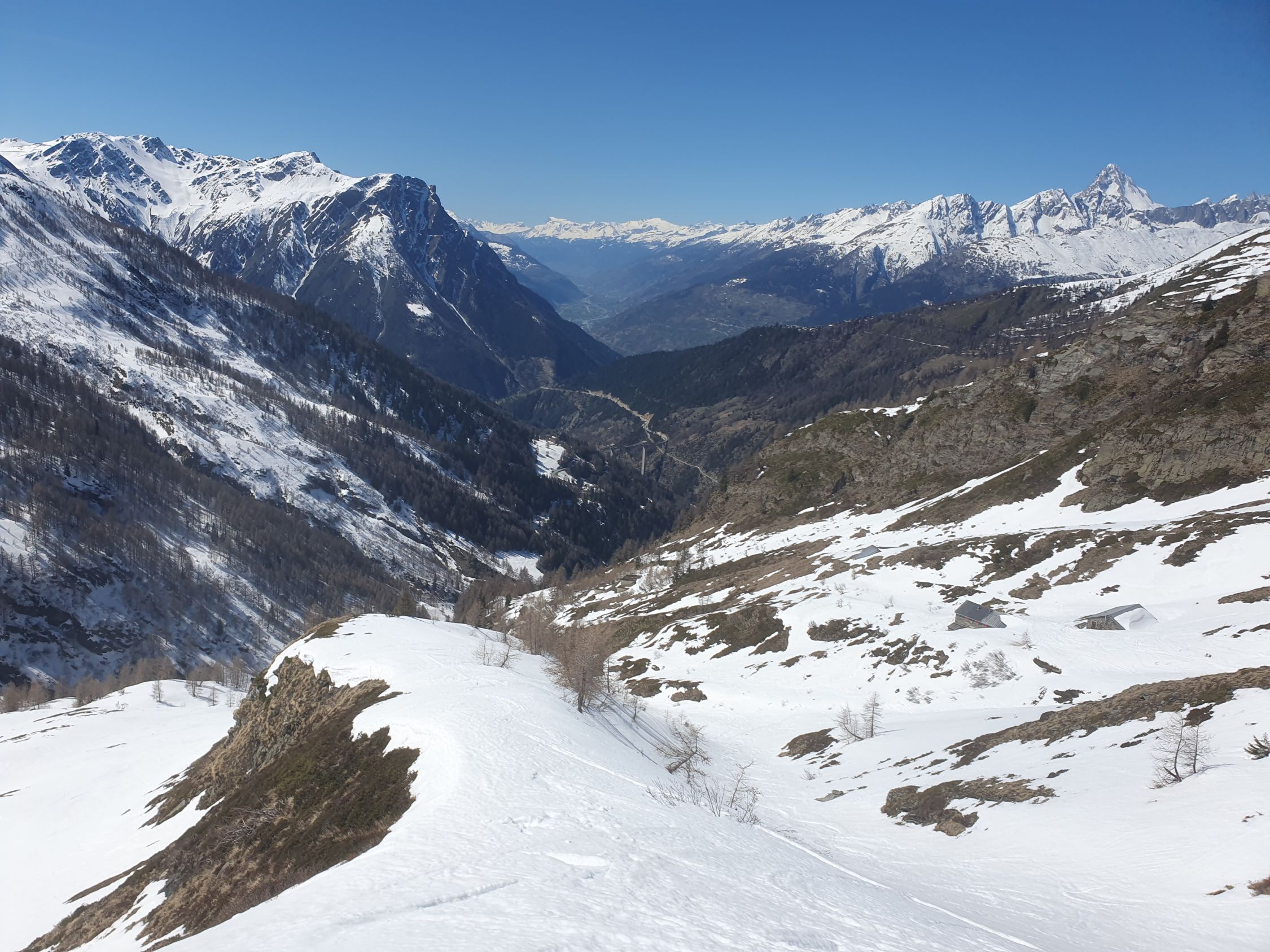 Die Abfahrt nahm ich um 14:00 vor. Ganz zuoberst mühsamer Hartschnee, doch schon bald konnte ich in den sonnengetankten Hänge mit T-Shirt und perfektem Sulz mit einem grossen Grinsen schwingen wie in einem Traum.