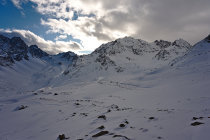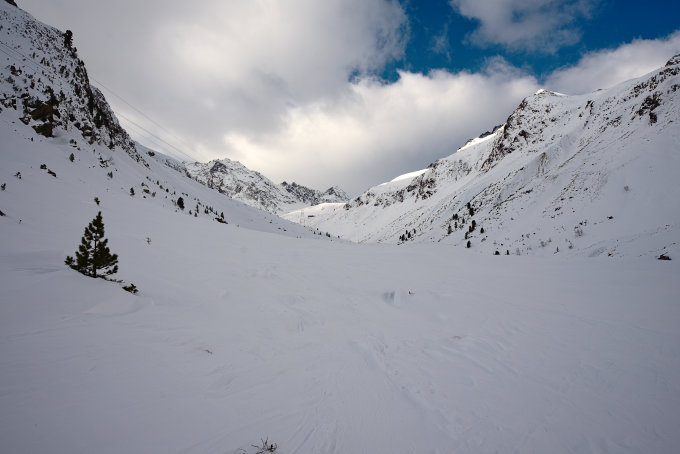 Von Lisens kommend die übliche Route auf der Loipe entlang bis zum Anstieg durch den Wald rechter Hand - bis hier her guter pulvriger Schnee auf noch recht dünner Unterlage, dann auf der südöstlichen Seite des Baches vollends das Längental nach hinten - hier schon stark vom Wind verfrachteter Schnee, entsprechend Stellen mit "Winddeckel" sowie eingewehte Stellen, dann in einigen Spitzkehren hoch zum Westfalenhaus.