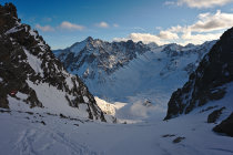 Von hier dann weiter in zwischen Pulver, windgepresstem und Harsch wechselndem Schnee an der Münsterhöhe vorbei und in vielen Spitzkehren mit teils heiklem (ohne Harscheisen) Stand hoch bis in die Zischgenscharte. Durch die Scharte ging es vorbei an einem schon älteren Lawinenkegel. Der Schnee in der Scharte war von Sonne und Wind schon recht stark verfestigt - ohne Harscheisen recht anstrengend. Der Gipfelanstieg ist rutschig aber machbar, da der Schnee fast gar nicht am Gestein haftet. Wir sind im Grat umgekehrt, die anderen drei die auf der gleichen Route unterwegs waren, haben den Gipfel erreicht.