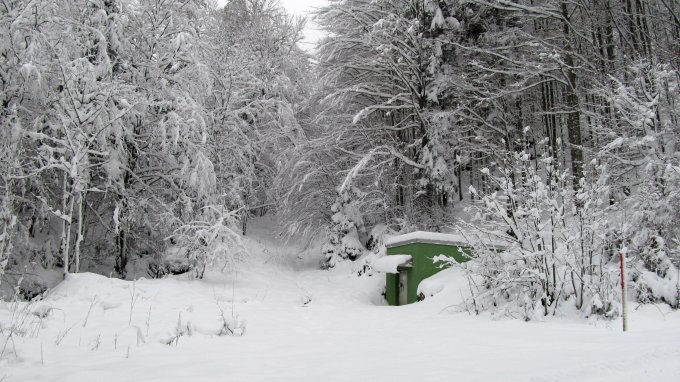 Aufgrund der für den Nachmittag günstigeren Wetterprognosen bin ich erst kurz vor Mittag bei noch leichtem Schneefall und -2 Grad gestartet. Am Ausgangspunkt lagen ca. 30 cm Neuschnee ohne Unterlage. Die erste Abkürzung des Rodelweges wird an einigen Stellen noch von wasserführenden Rinnsalen gequert. Aufstieg mit Ski wäre kein Problem, aber Abfahrt derzeit besser über den Rodelweg. Die zweite, etwas steilere Abkürzung (ebenfalls noch ungespurt) ließ ich heute rechts liegen und folgte dem Rodelweg bis zur Todtnauer Hütte. Dort liegt gut 40 cm Neuschnee.