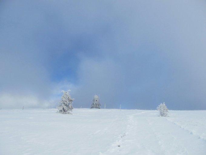 Bei schlechter Sicht und teilweise Nebel folgte ich den Schneestangen zum Feldberggipfel, musste aber aufpassen die gewalzte Spur nicht zu verlieren. Erst in Gipfelnähe war der Schnee windbearbeitet, aber nicht eisig.
