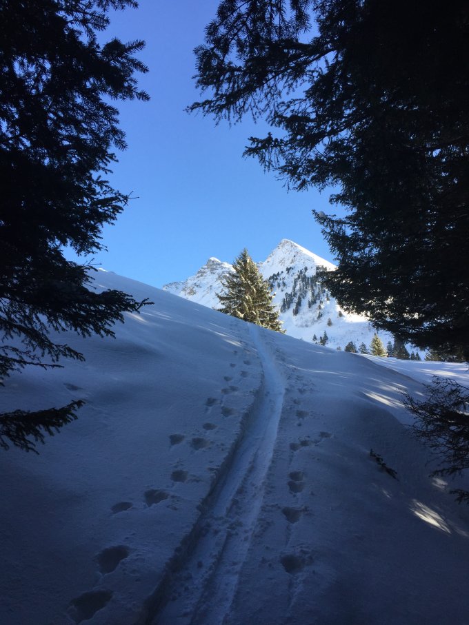 Super Pulverschnee. Im unteren Bereich noch wenig Grundlage, aber dann wird es immer besser. Im Scherenzug war bereits eine kleinere Lawine abgegangen.