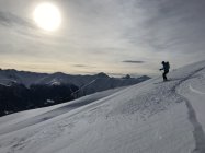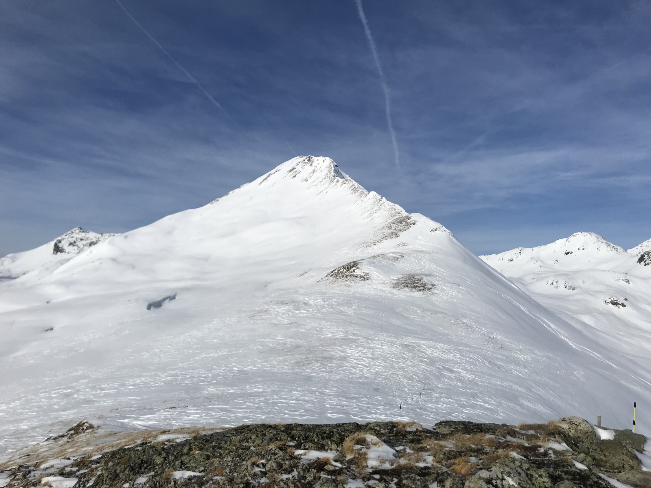 Gute Verhältnisse im Aufstieg. Danke an die beiden Vorausgehenden für das Spuren. Bis ca. 2300 hm Pulverschnee, vom gestrigen Wind bearbeitet aber weich. Darüber dann auch heute Wind, weniger und gepresster Schnee und apere Stellen. Gipfelaufbau/Kamm stark abgeblasen, weshalb wir die Tour bei 2400 hm auf den „Chummer Berg“ frühzeitig beendeten. Abfahrt im mittleren Teil schön. Ganz viel Platz und unverspurte Hänge. Dass so wenig Leute auf dieser Route unterwegs waren hat uns sehr gefallen..