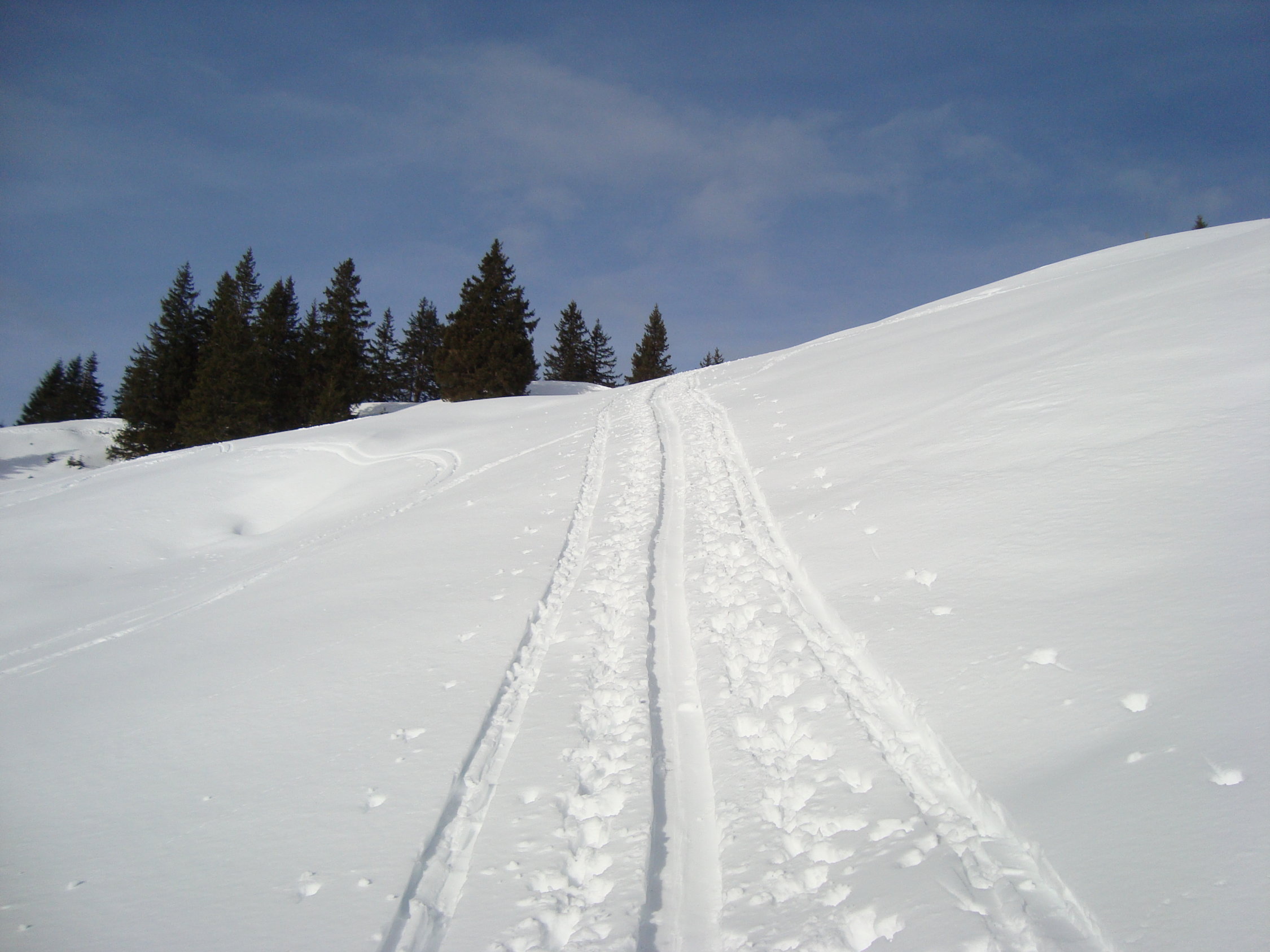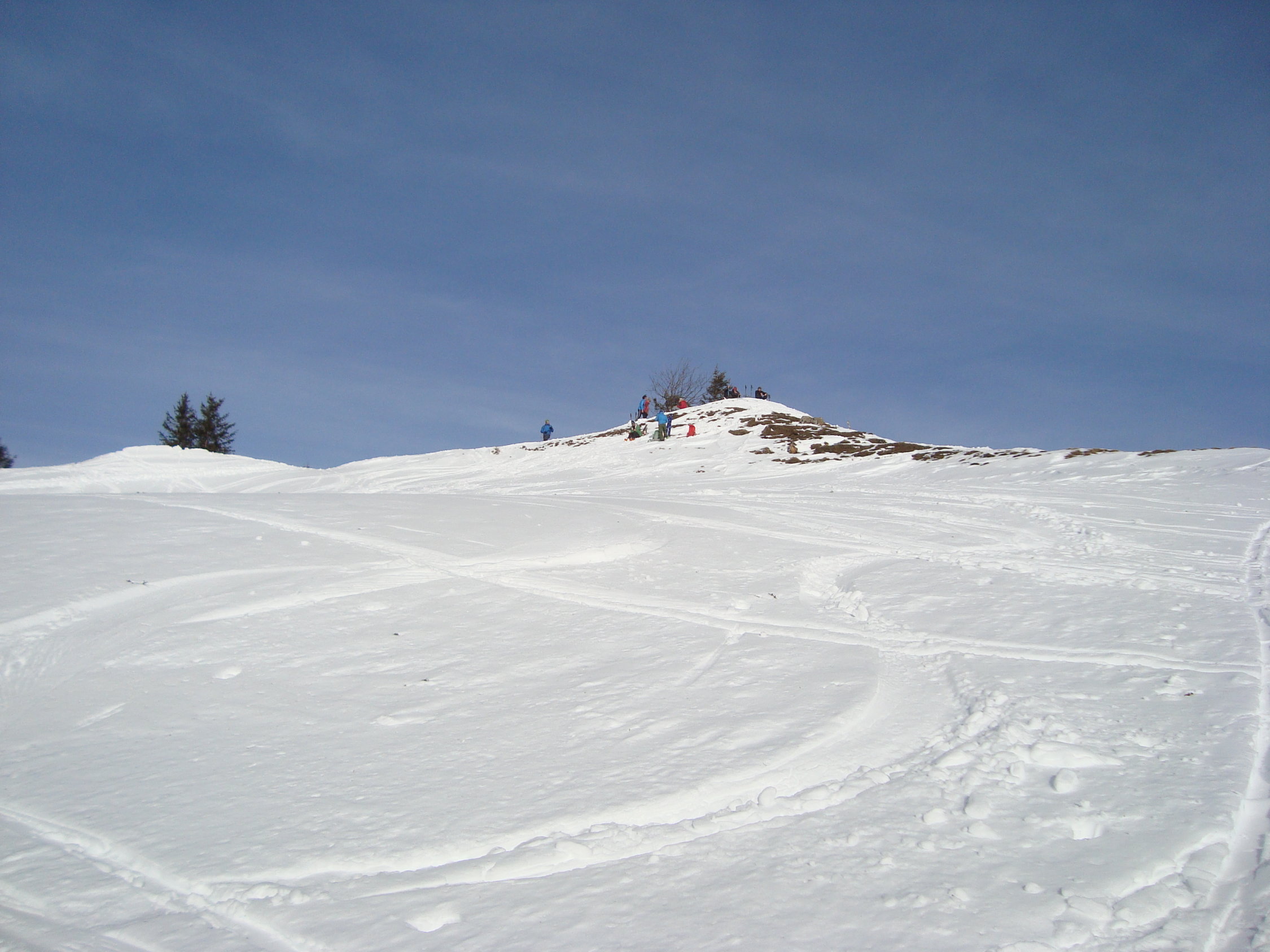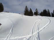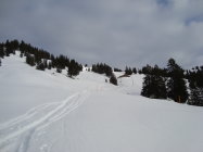 Aufstieg die ersten zwei Drittel auf Bruchharsch, dann gut gesetzter recht feuchter Schnee.