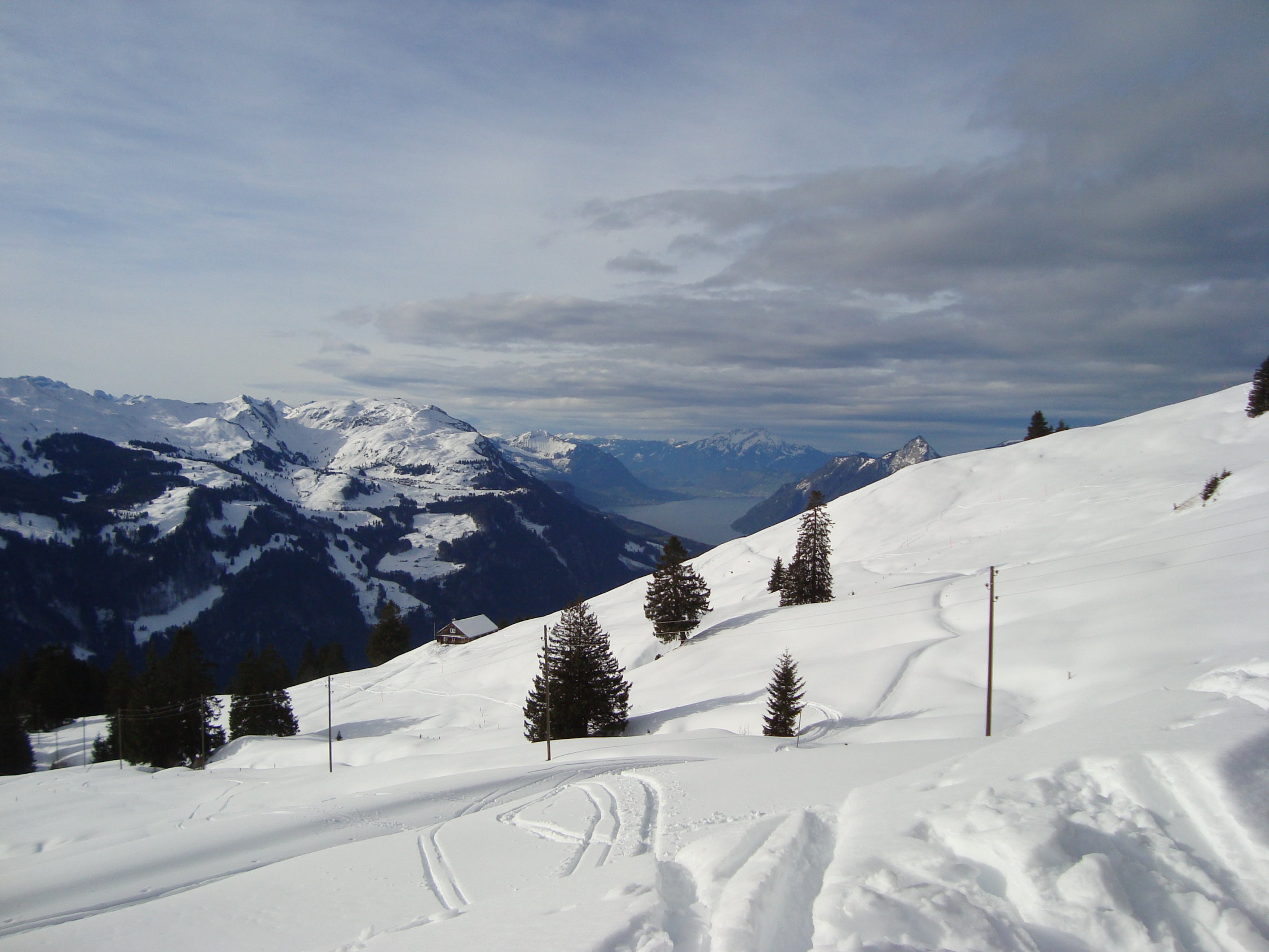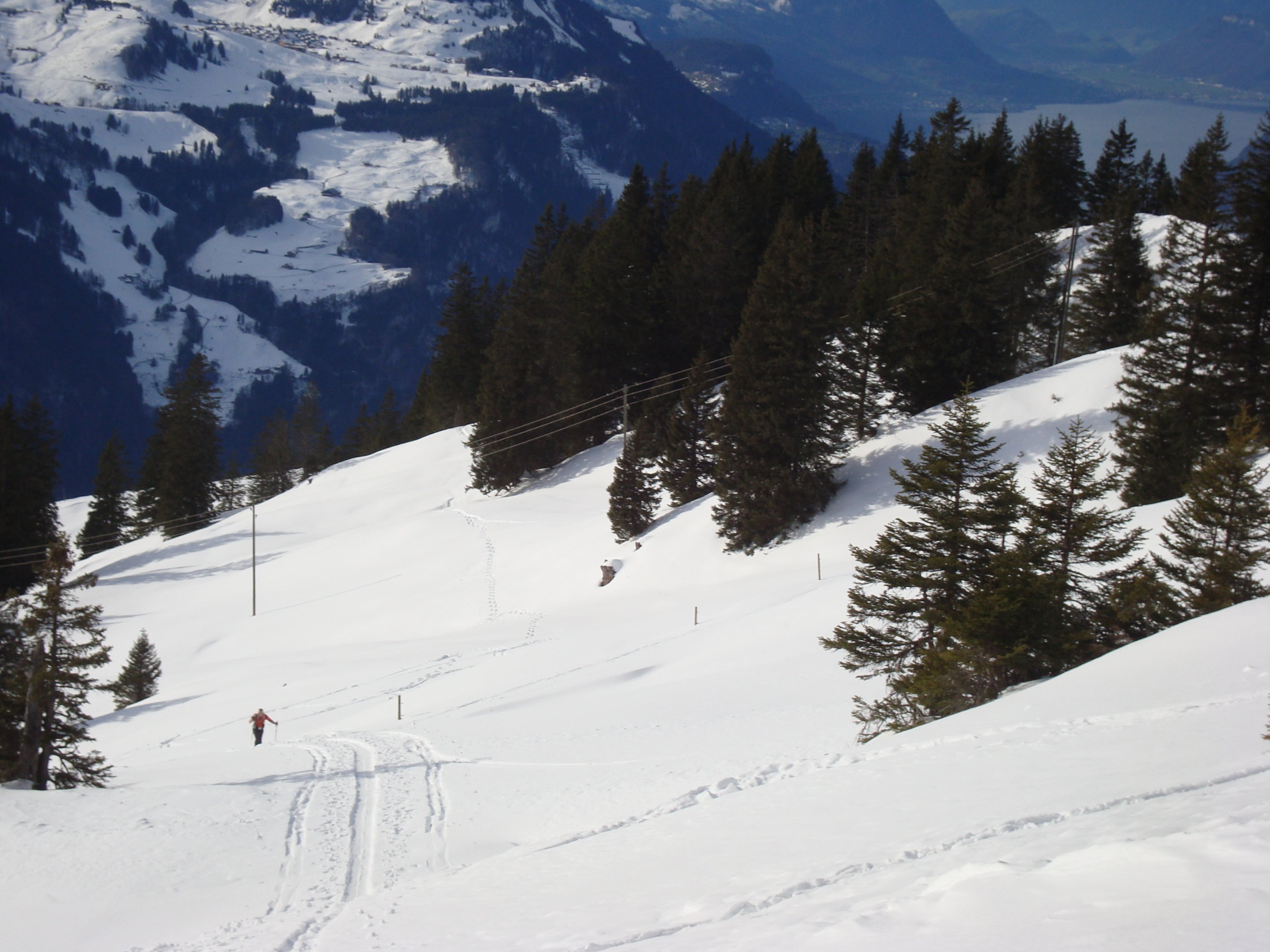 Bei unserer Abfahrt, nach längerem Gipfelaufenthalt gegen 14.00Uhr bis zur Chrüthütte sehr gut zu fahren. Danach durch die tageszeitliche Erwärmung etwas schwergängiger, jedoch mit etwas Druck auf die Bindung noch recht gut machbar. In den Schattensektoren war es noch leicht krustig.