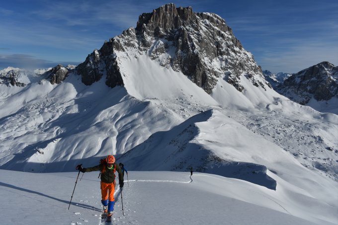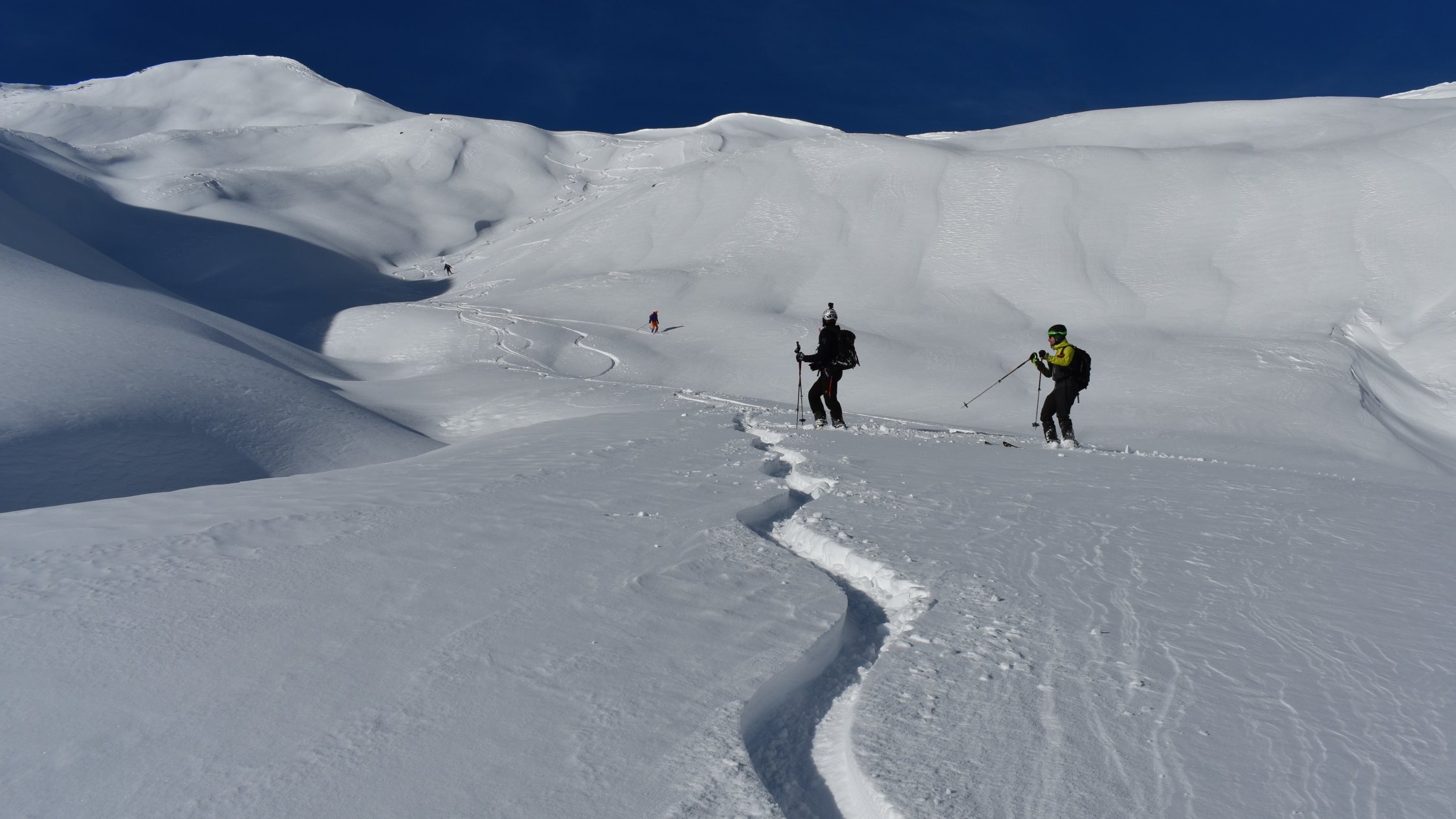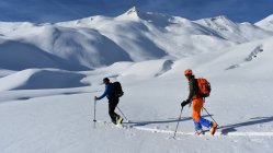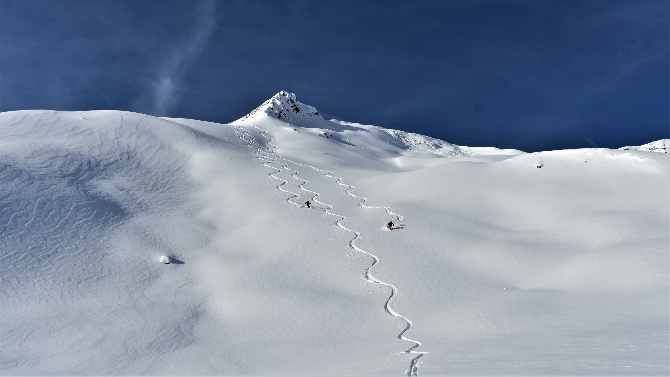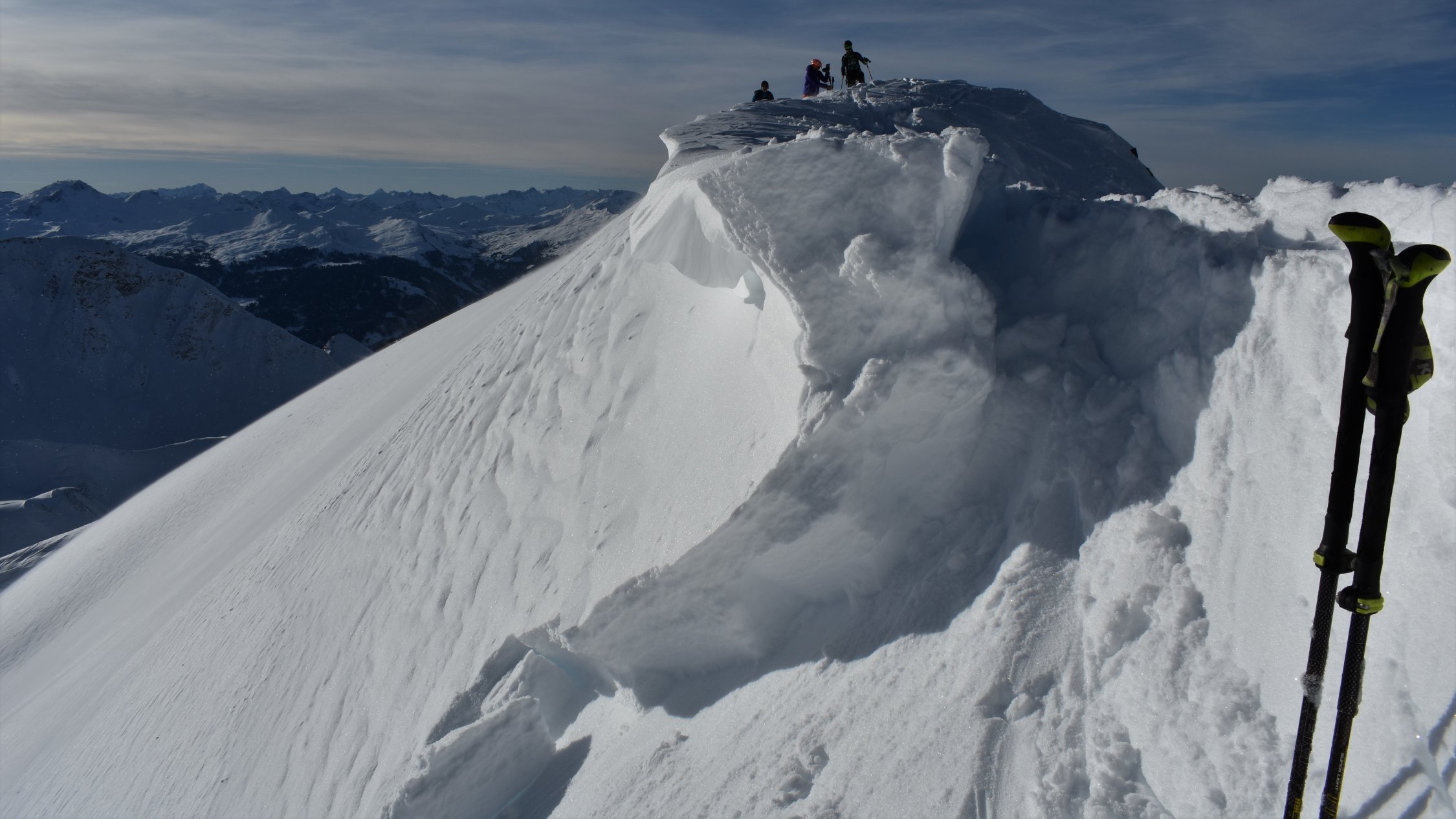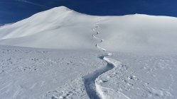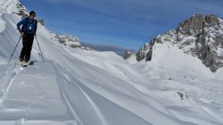Pulverschnee auf der ganzen Tour. In Gipfelnähe und an Gräten teils Windbearbeitet