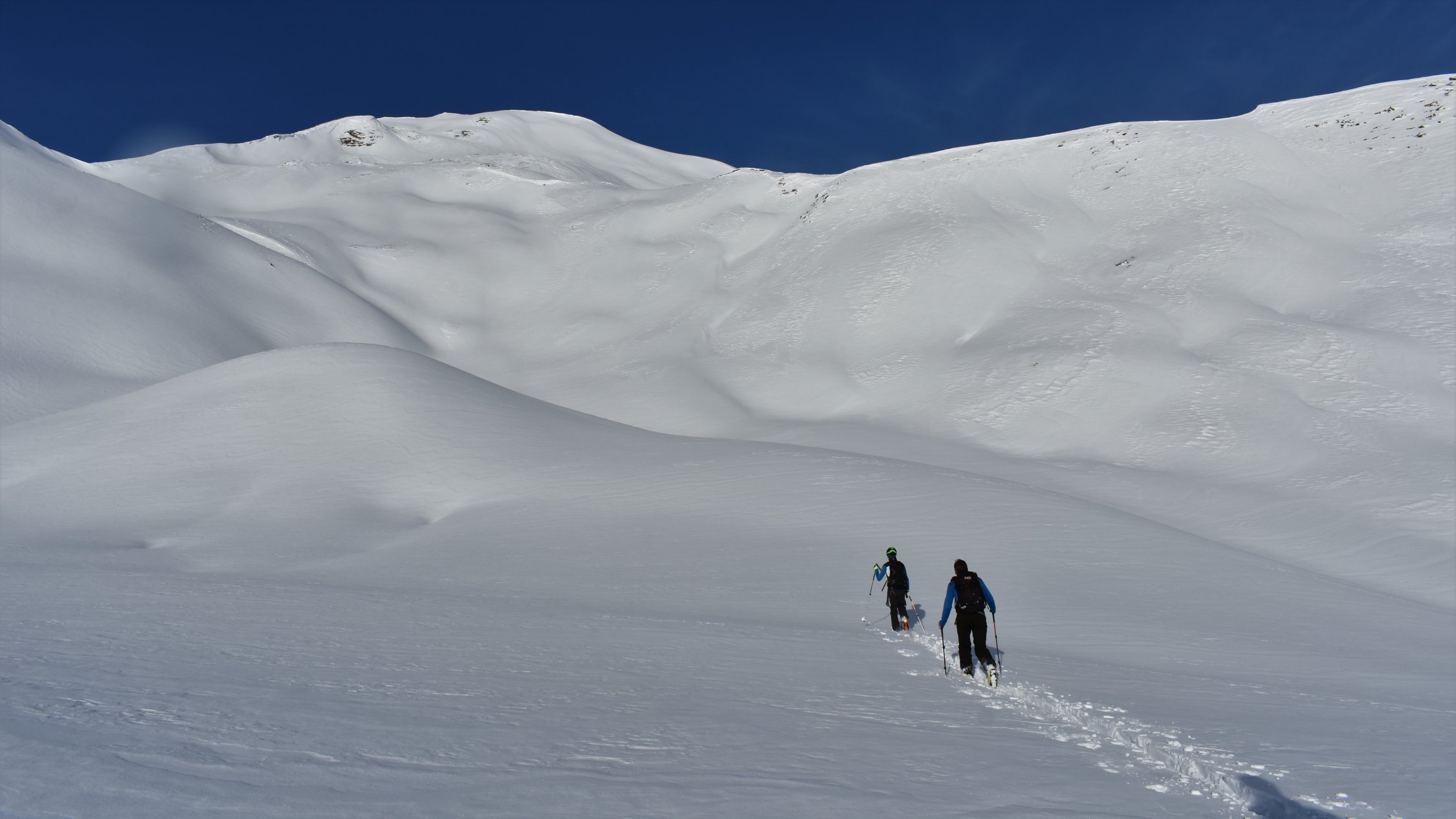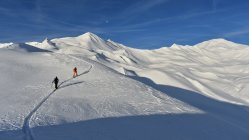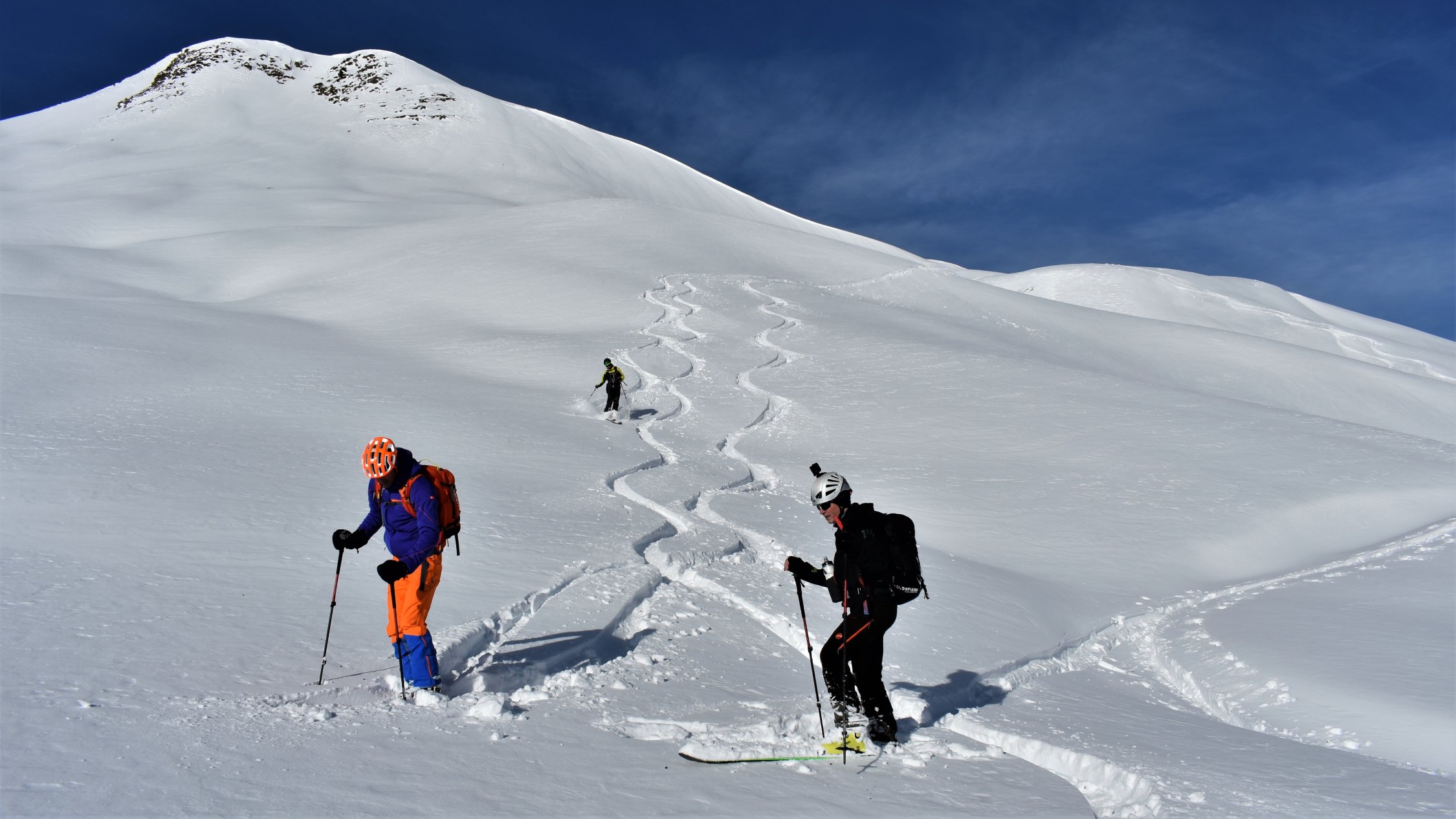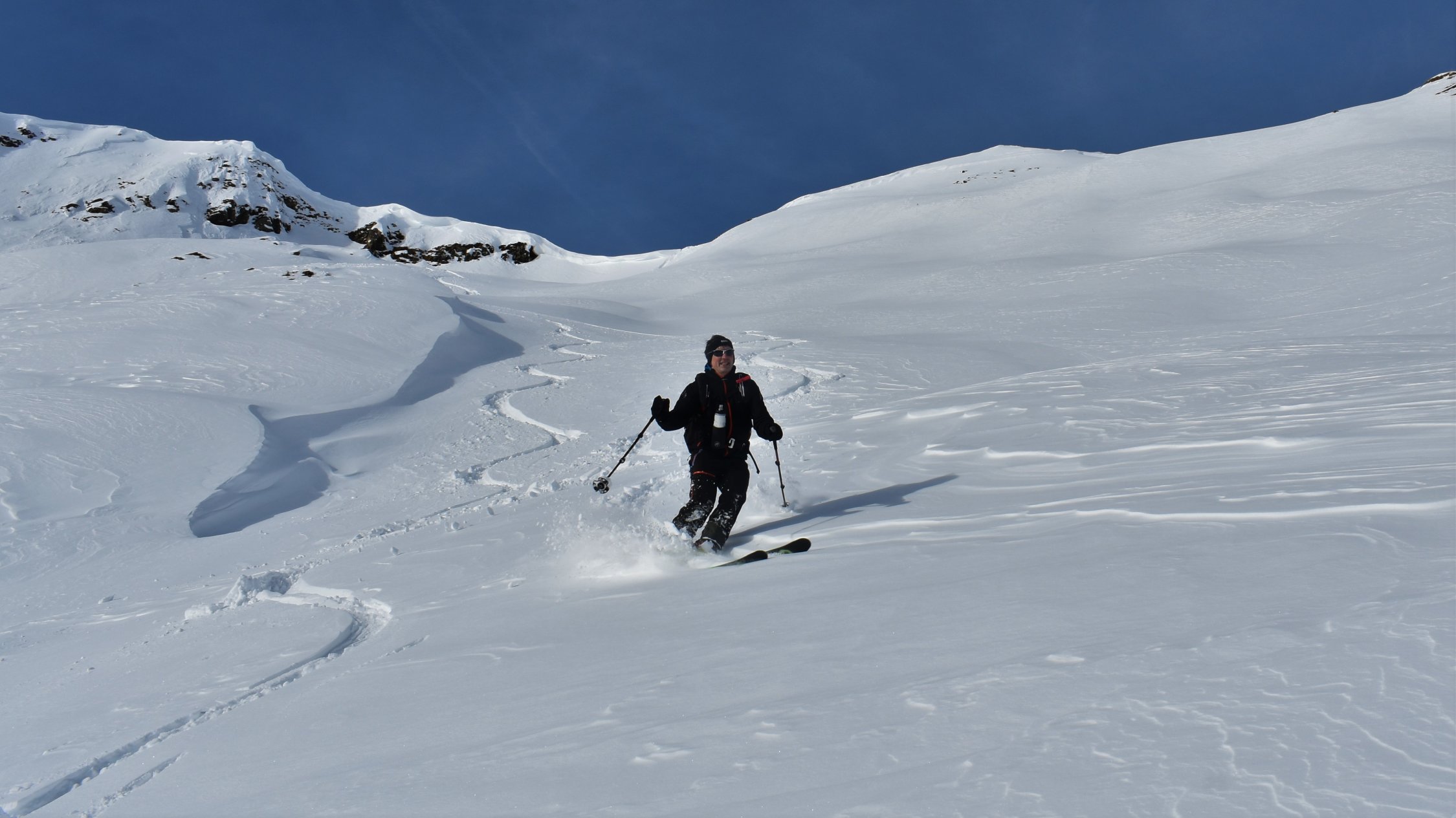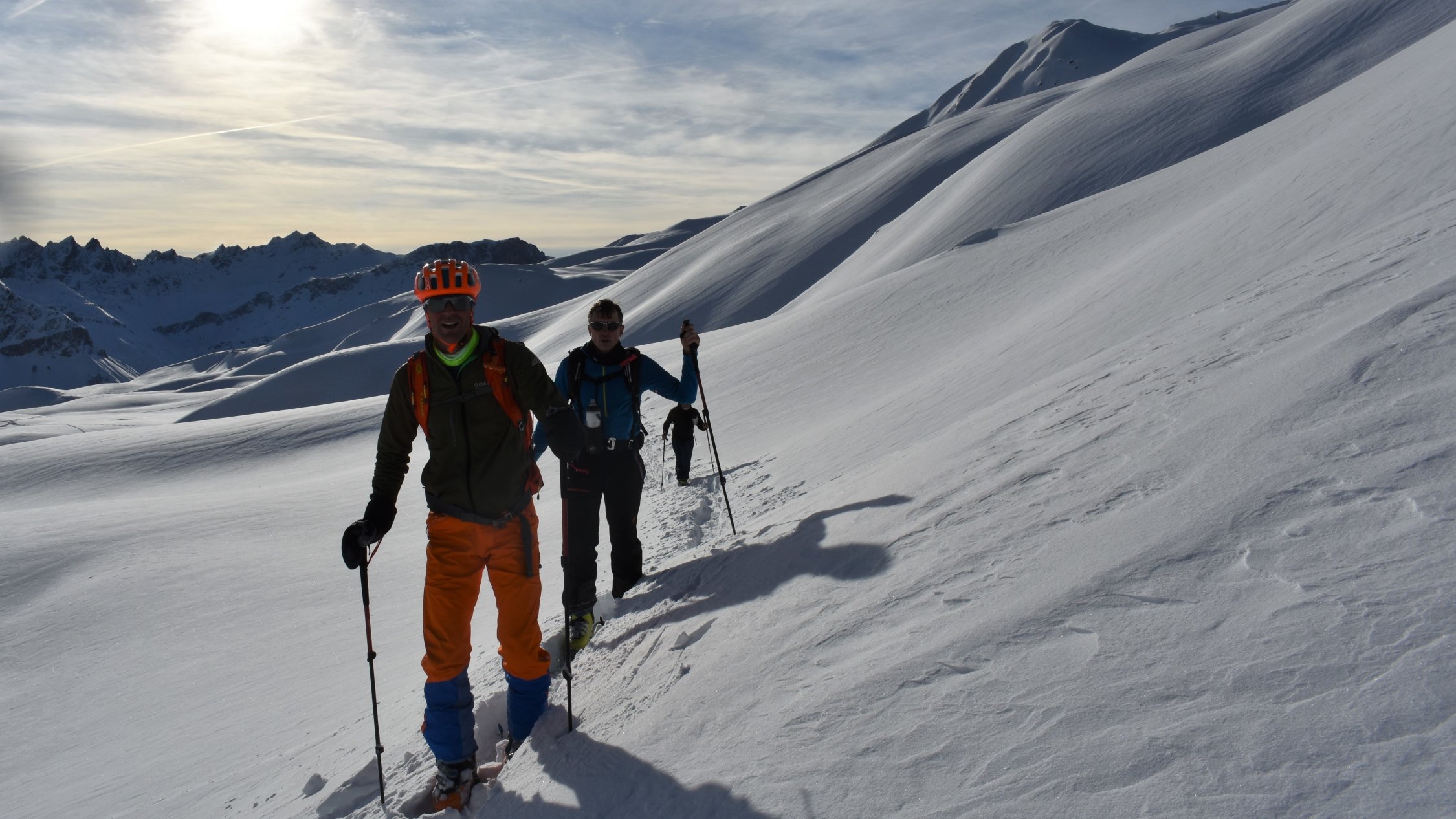 Pulverschnee auf der ganzen Tour. In Gipfelnähe und an Gräten teils Windbearbeitet
