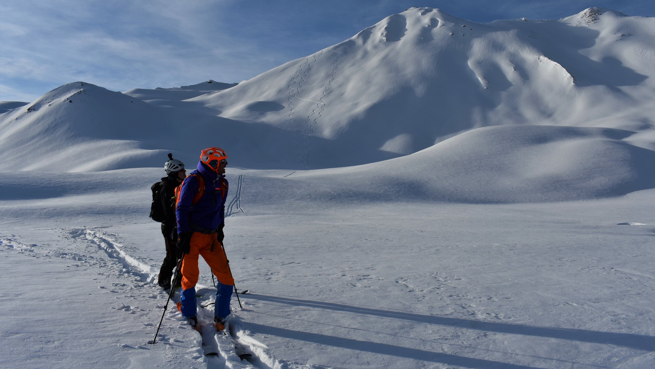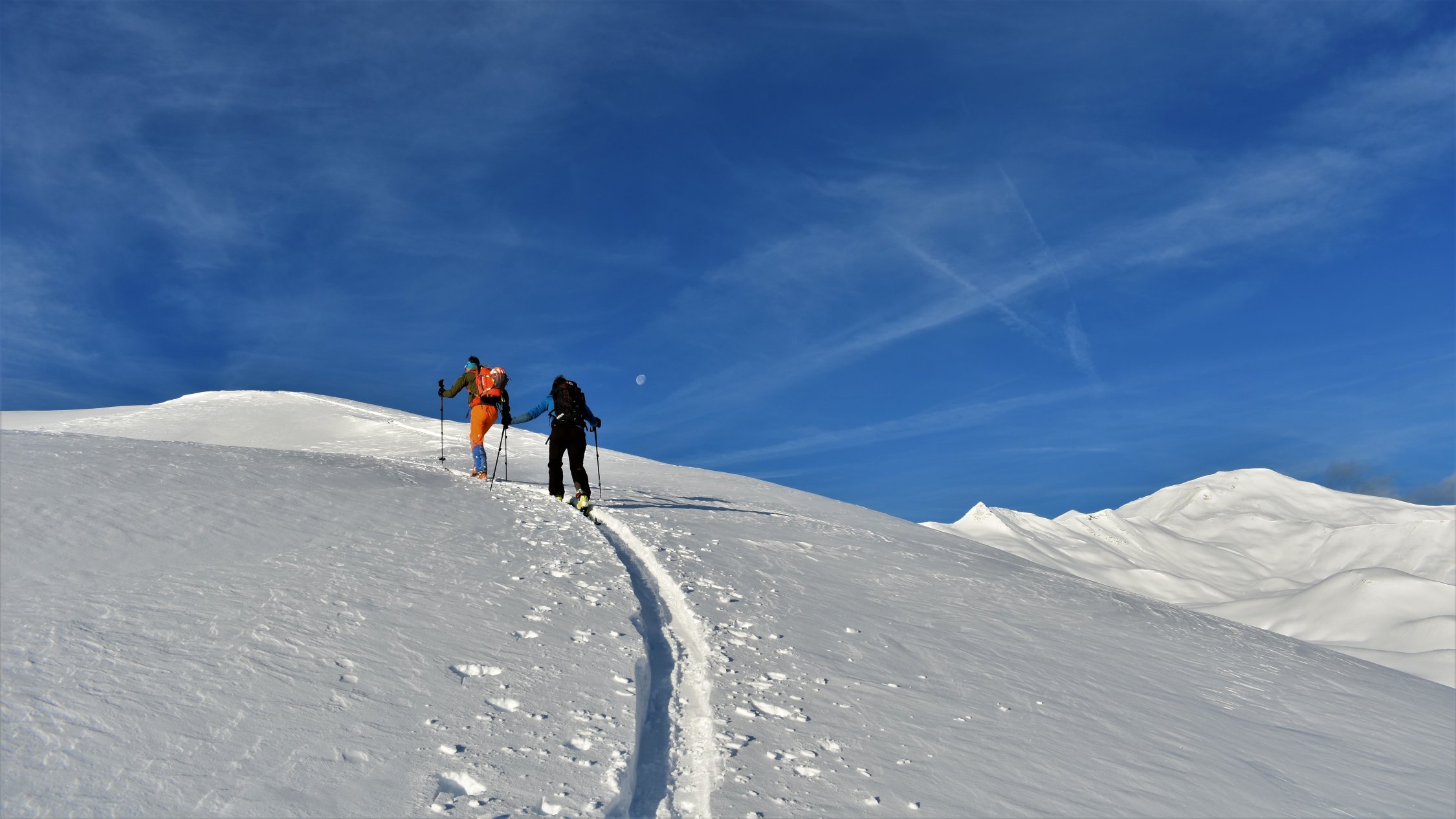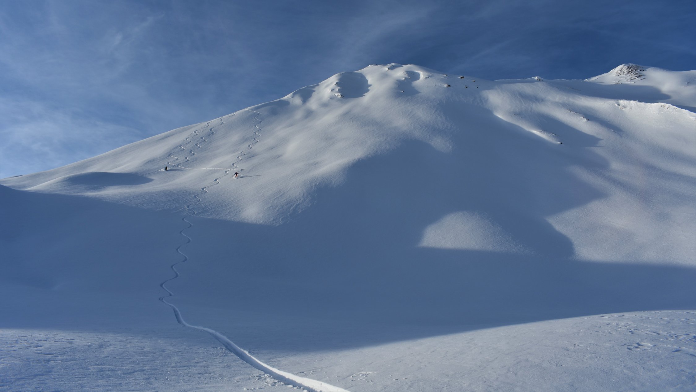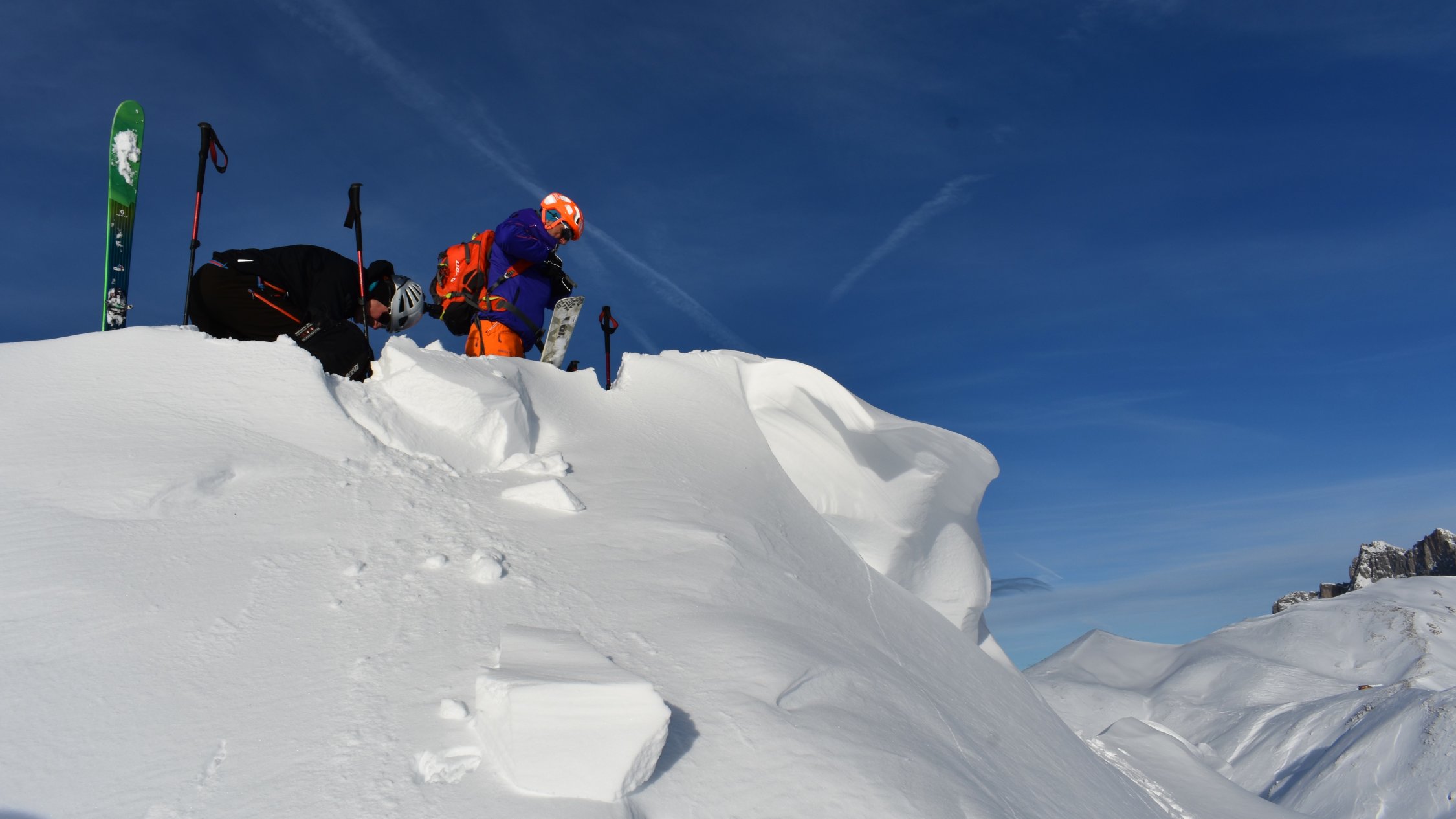 Pulverschnee auf der ganzen Tour. In Gipfelnähe und an Gräten teils Windbearbeitet