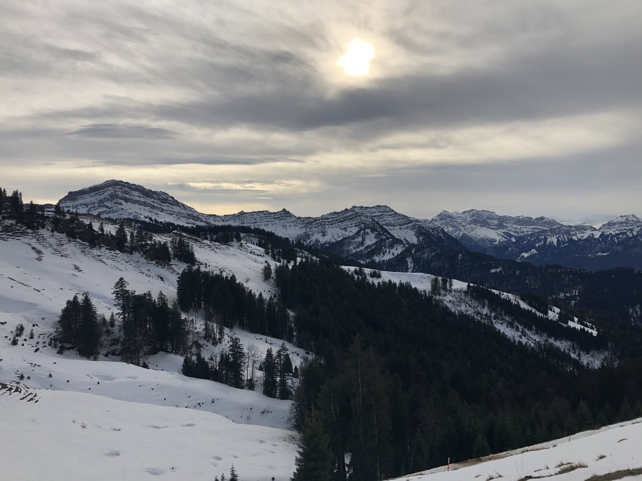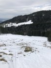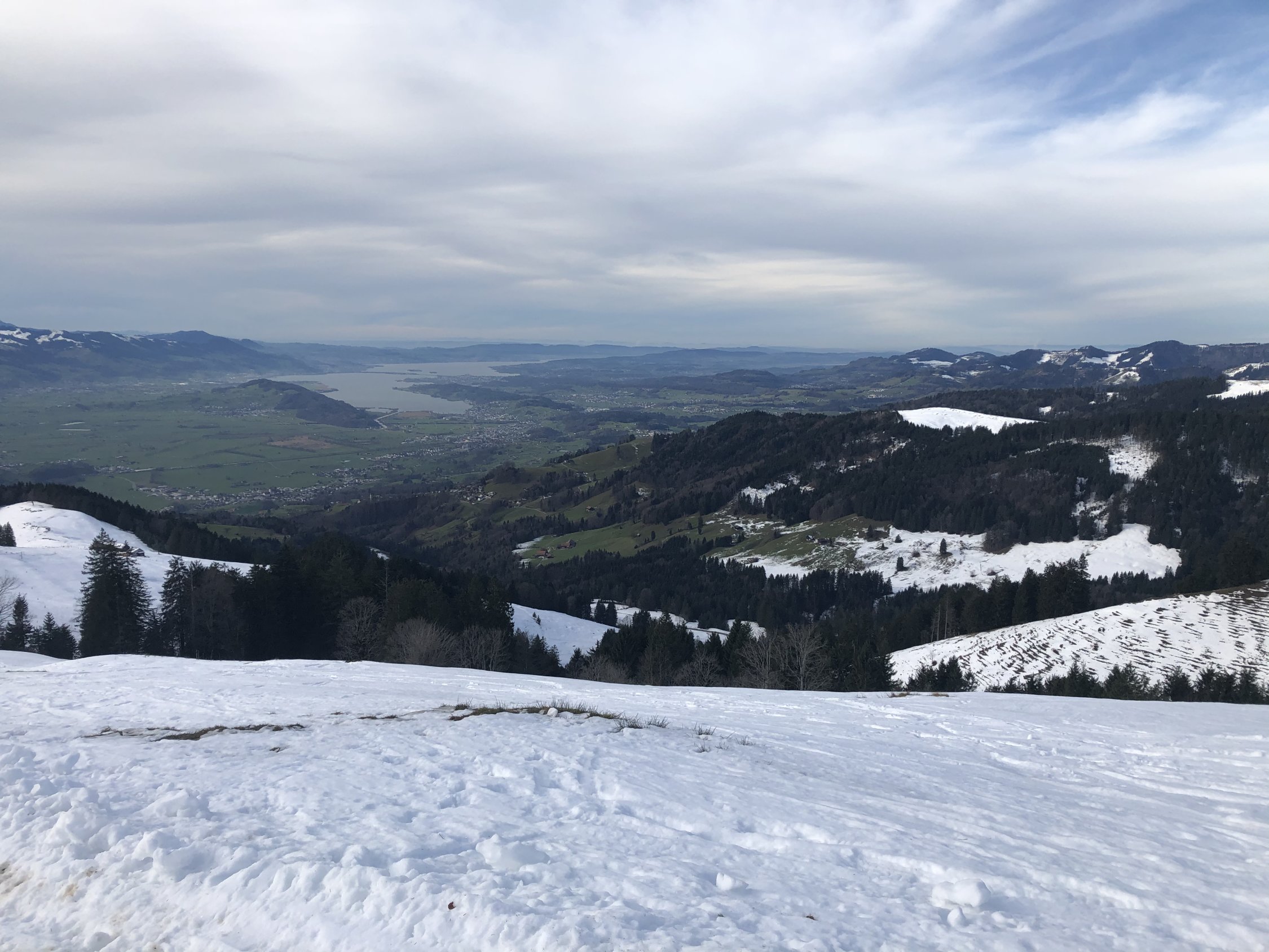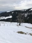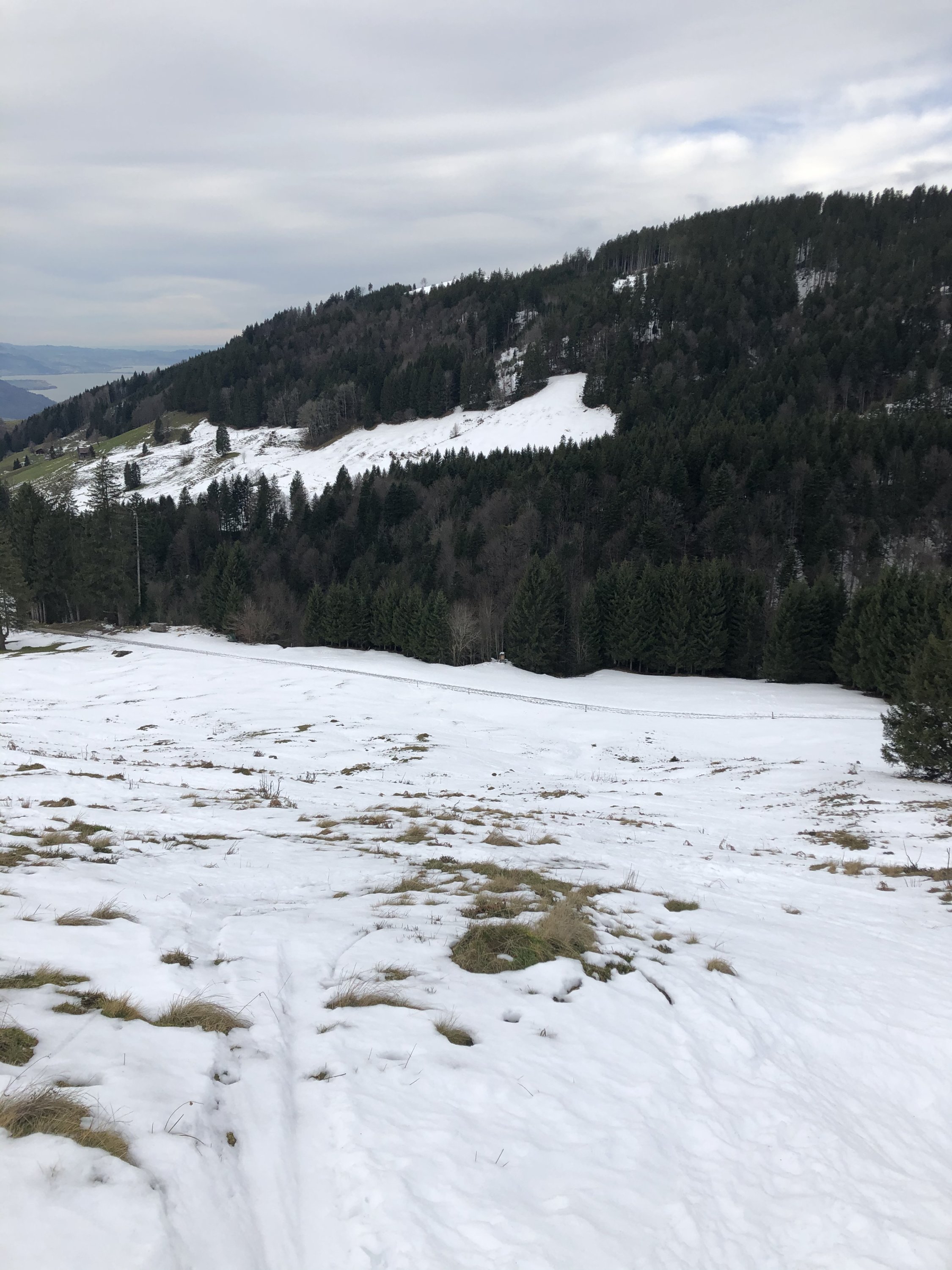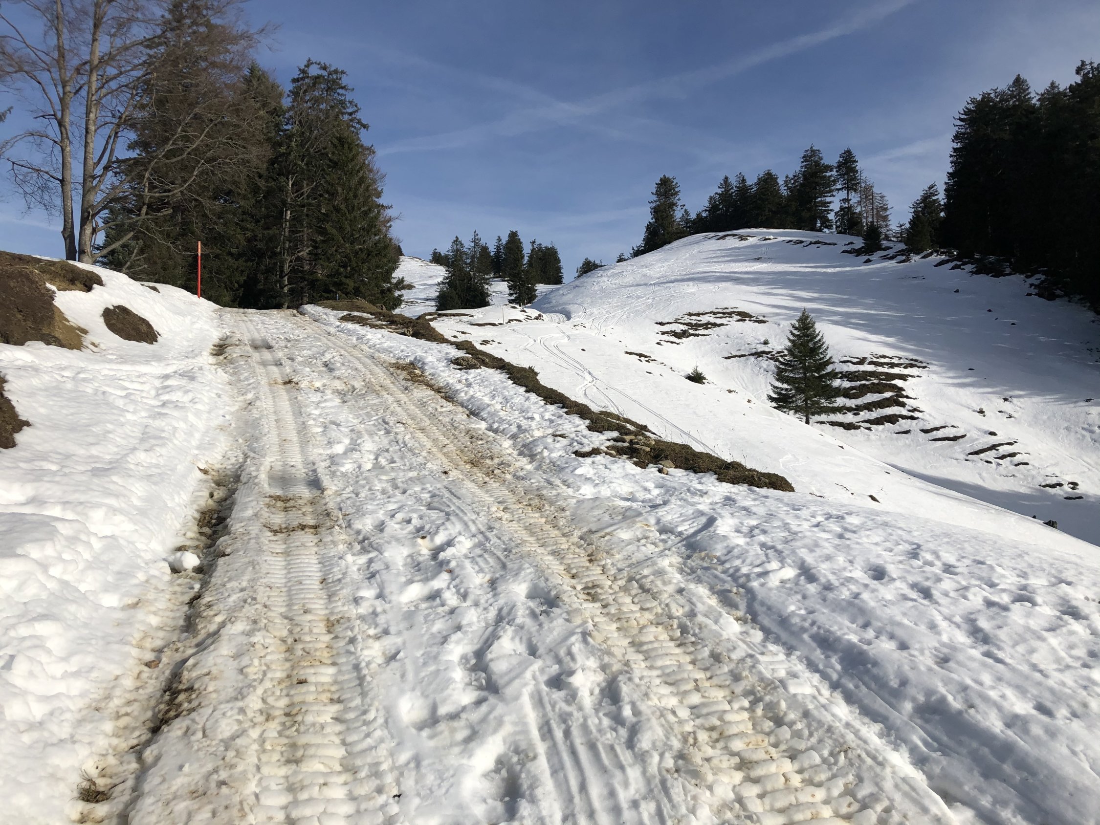 Start um 12:00 bei 10 Grad. Aufstieg Standard über Stockhütte bis Chüebodenegg. Beim Parkplatz oberflächlich gefrorener Kartoffelacker, nicht sehr einladend. Ab Stockhütte weniger verfahren. Keine Piste.