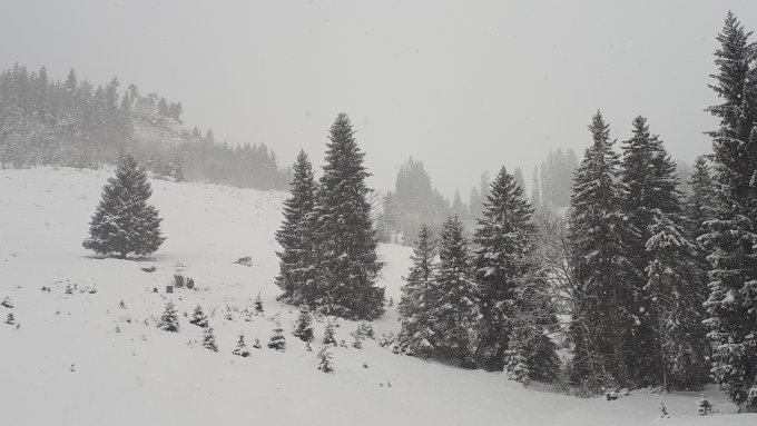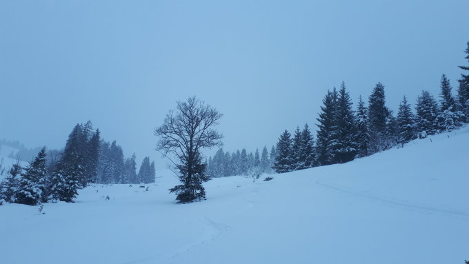 Conditions bien meilleures que hier (voir Bericht de Caribou et Shünti) environ 20 cm de poudreuse lourde dès l parking qui permettent de couper (descendu par la petite route par contre) à partir de 1400, environ 40 cm un peu compactée par le vent.. au dessus des chalets 1600m, alternance soufflée et poudre compacte. petit mur qui suit en bonne poudre un peu compacte et cool à skier..au dessus du dernier chalet soufflé