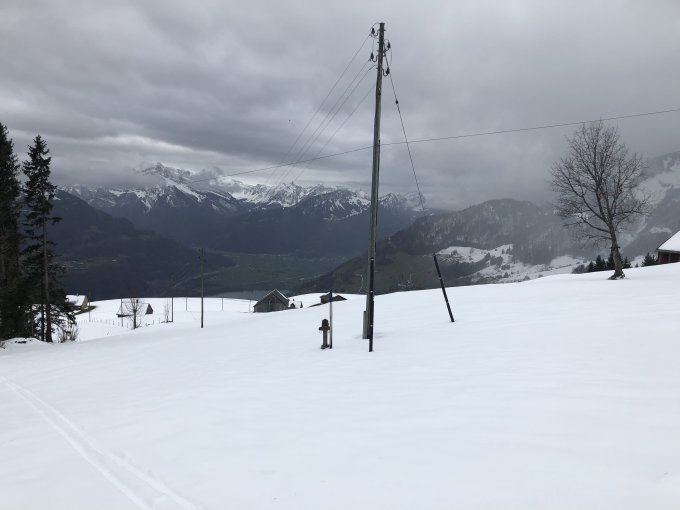 Start heute beim Parkplatz Tscherwald, um 0 Grad. Alleine am Berg. Wetter trüb, ab Hüttlisboden garstig.