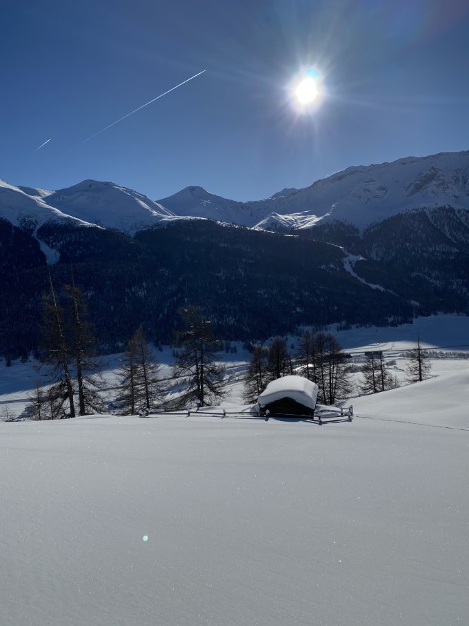 Von S-chanf über Acla Larets und Alp Griatschouls auf den Rücken hoch zum Ostgipfel (Pt 2799). Abfahrt durch die kleine Senke oberhalb Val Gianduns (nicht ins Tal reinfahren) und bei Pt 2563 über den südlichen Rücken, dann weiter übers Hüttchen und Munt Prosbierg zurück nach S-chanf. Bilderbuchtag, alles Pulver, beste Verhältnisse.