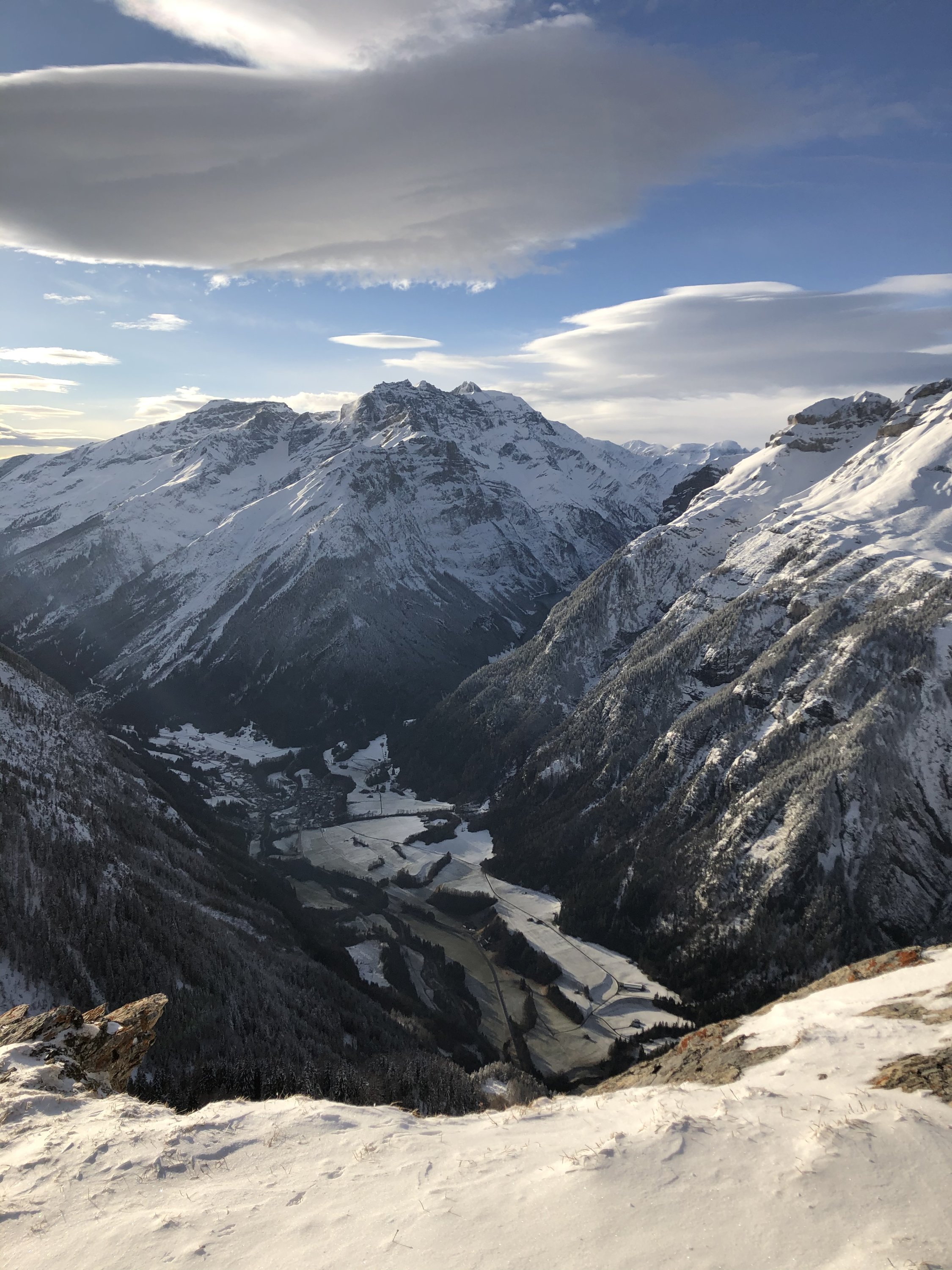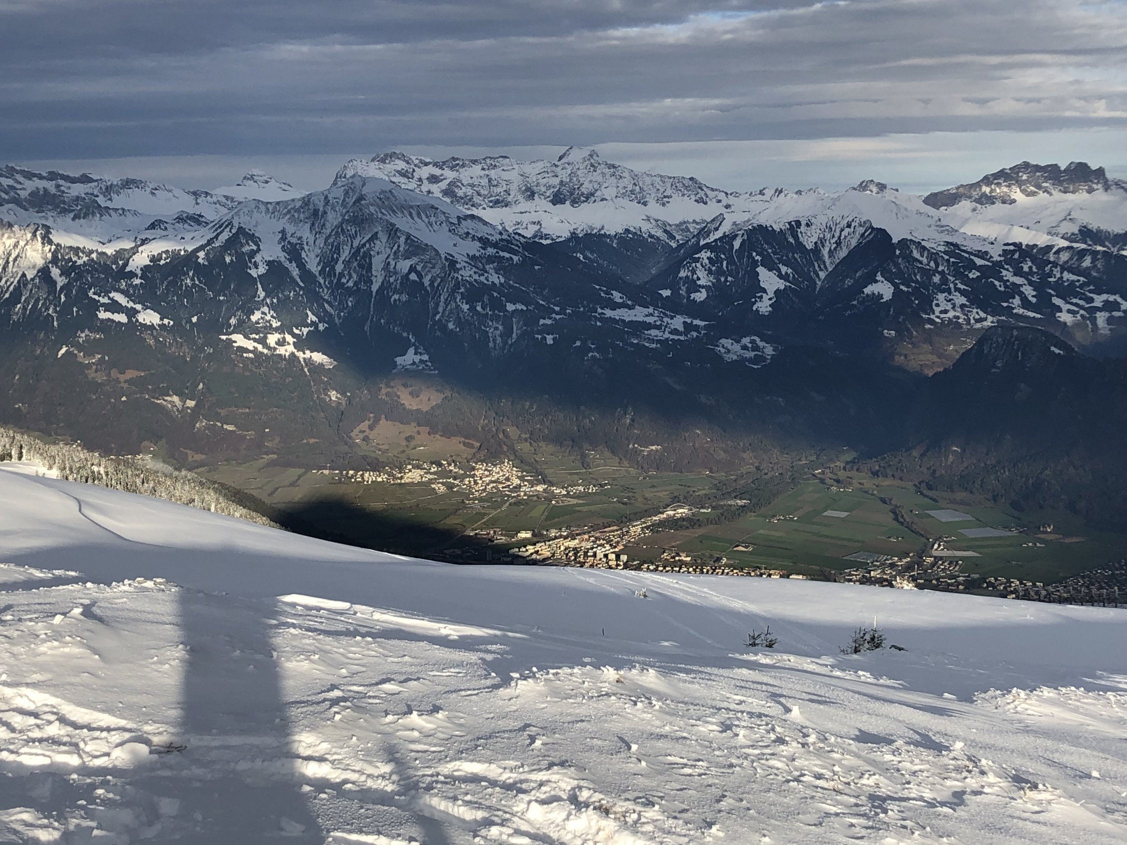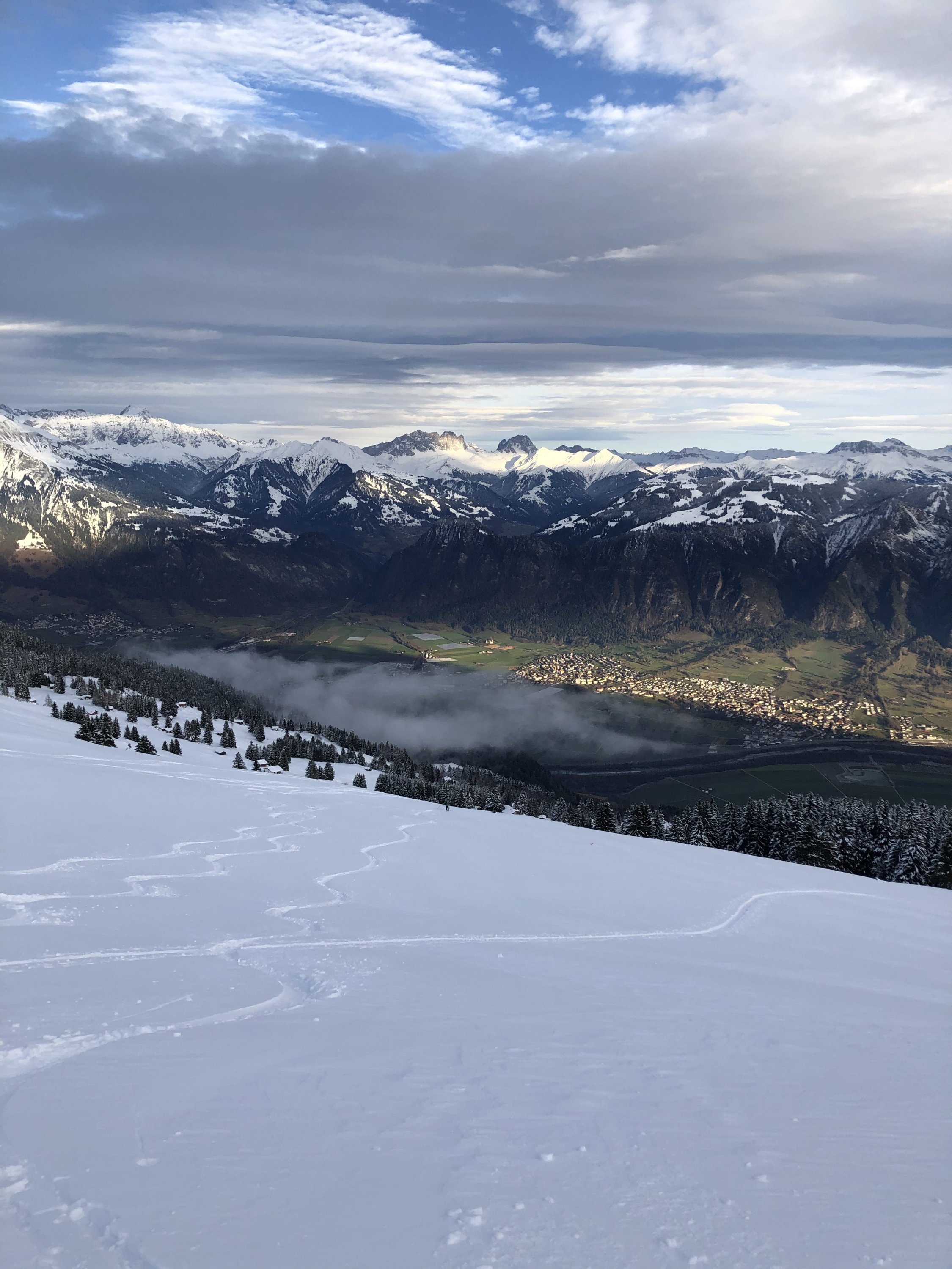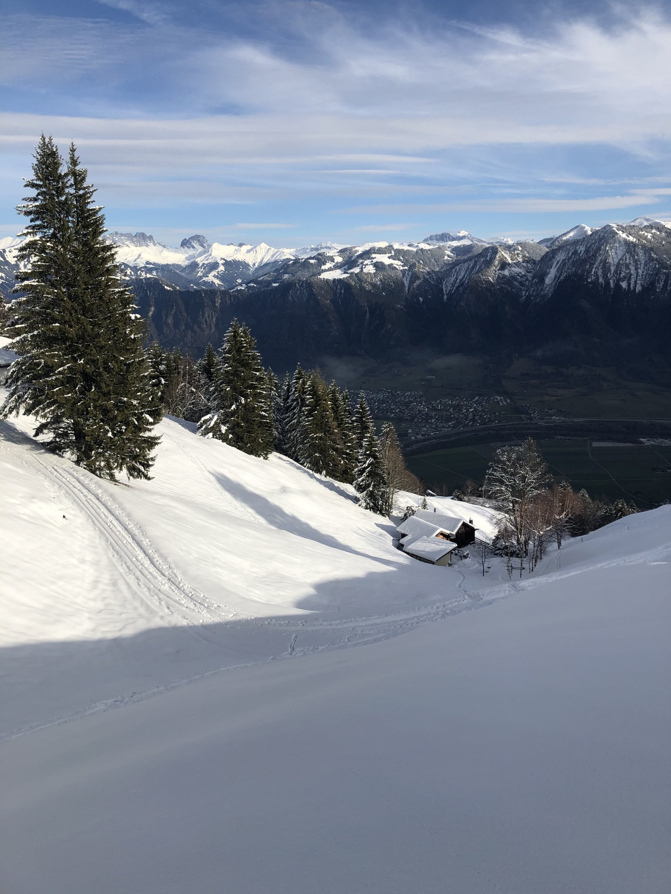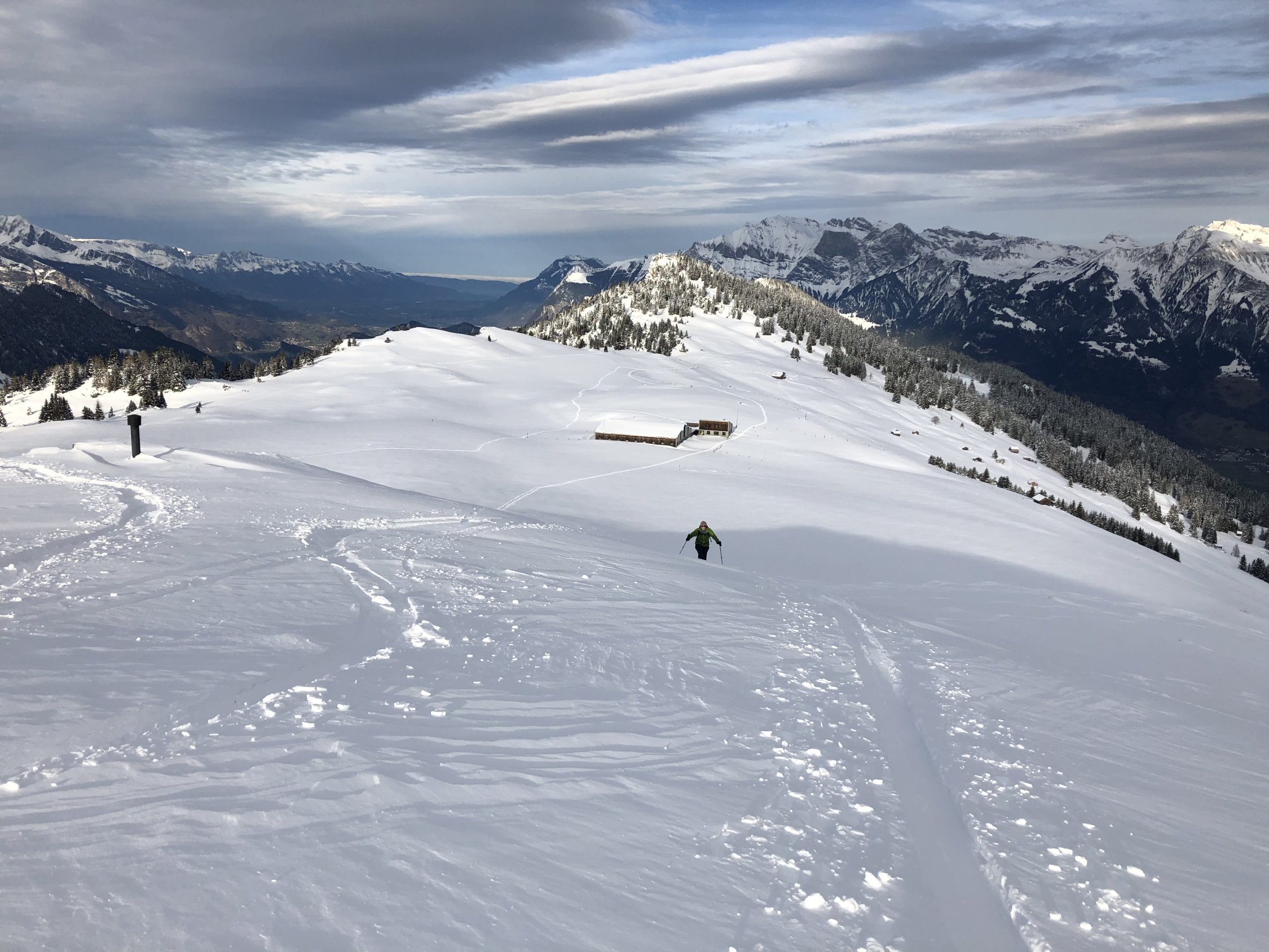Stelli fiel heute in die Schnittmenge „oberhalb grün“, „unterhalb erheblich“ und „nicht zu weit“ wegen weihnächtlichem Ausschlafen. Mit 4x4 bis wenige 100m vor Hächla gewühlt. Ab hier Pulver. Am Grat etwas Windeinfluss, aber gut zu fahren. Die Tour war heute jeden Rappen der Fahrbewilligung wert.