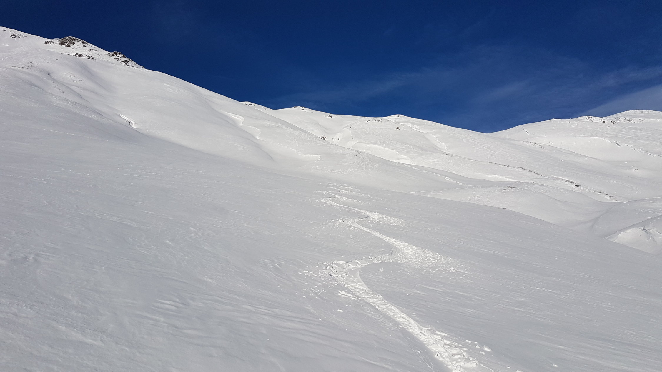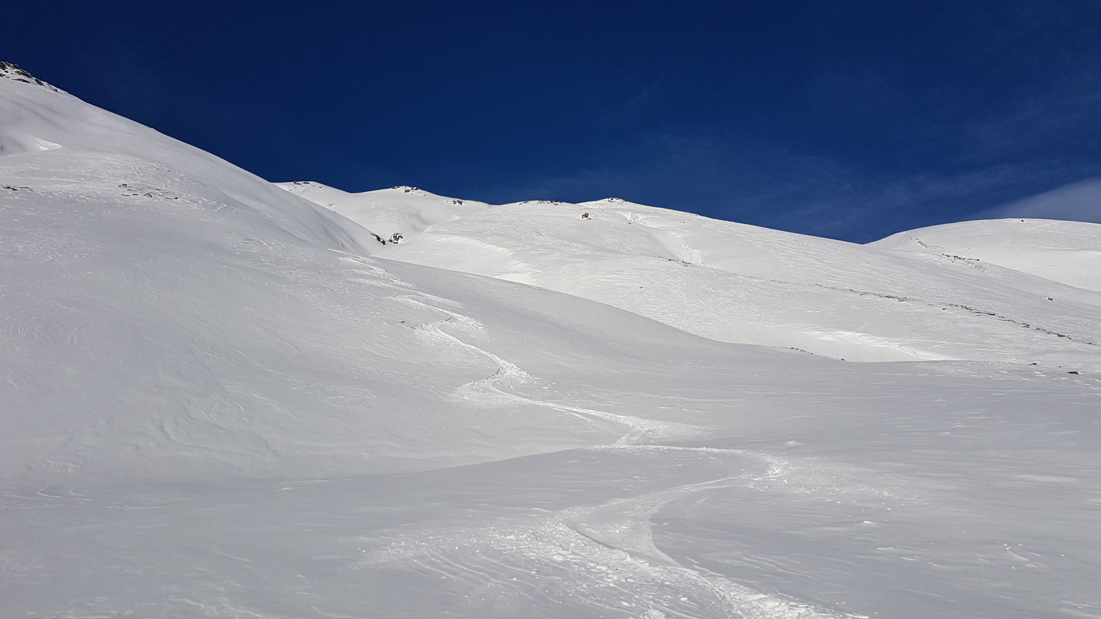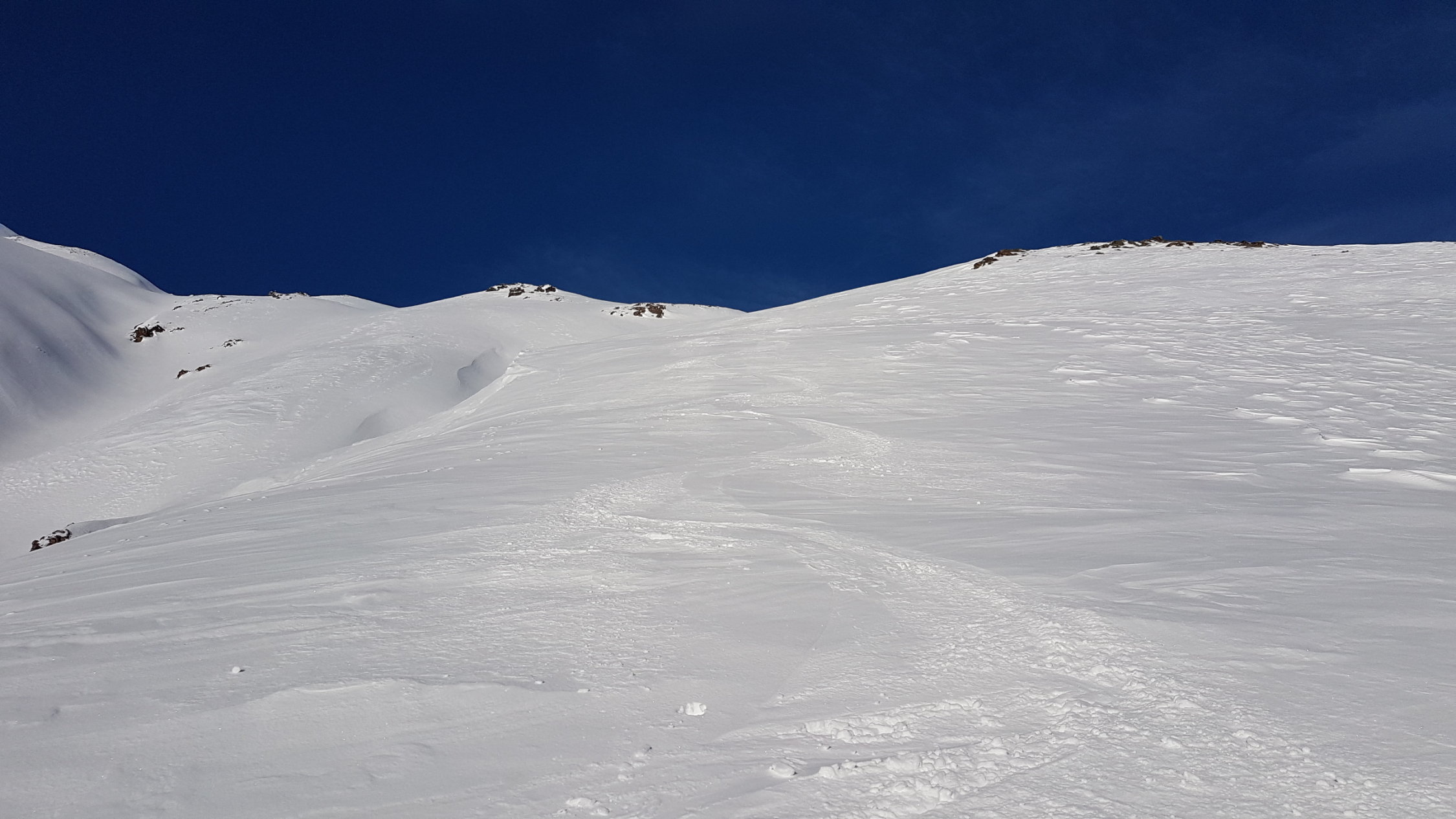 Abfahrt: Im obersten Teil stark verblasen und brettig. Ab ca. 2740m bin ich dann weiter westlich von der Aufstiegsspur runter gefahren auf einer etwas abgeblasenen Rippe, war aber ganz gut zu fahren. Noch etwas weiter westlich wäre der Schnee vermutlich noch besser gewesen, in diese Hänge habe ich mich nicht getraut. Im untersten Teil war es dann doch noch pulvrig, aber schon bald musste ich abbiegen, um wieder das Tal raus zu fahren.