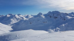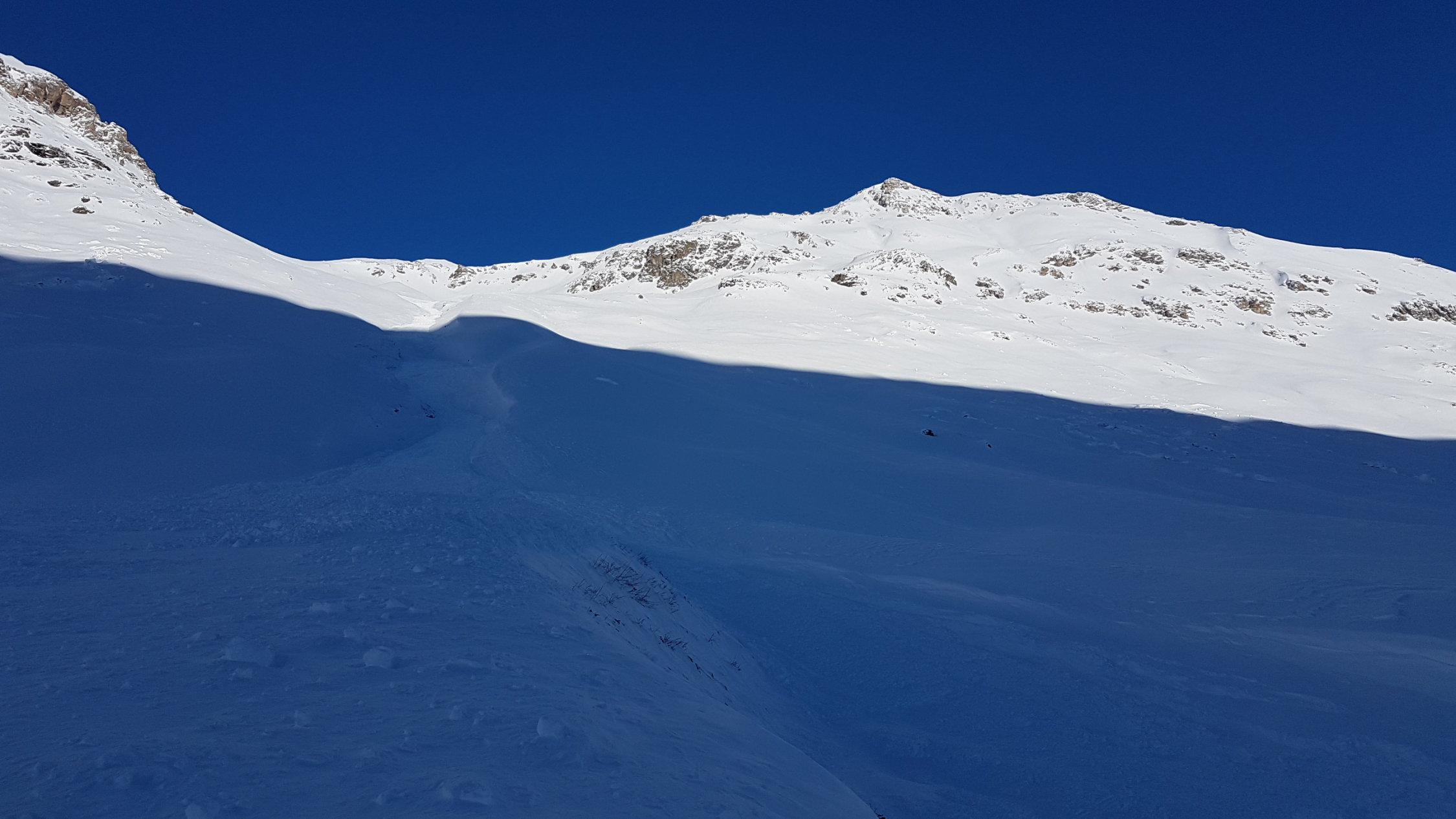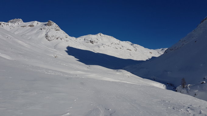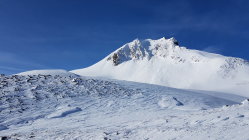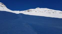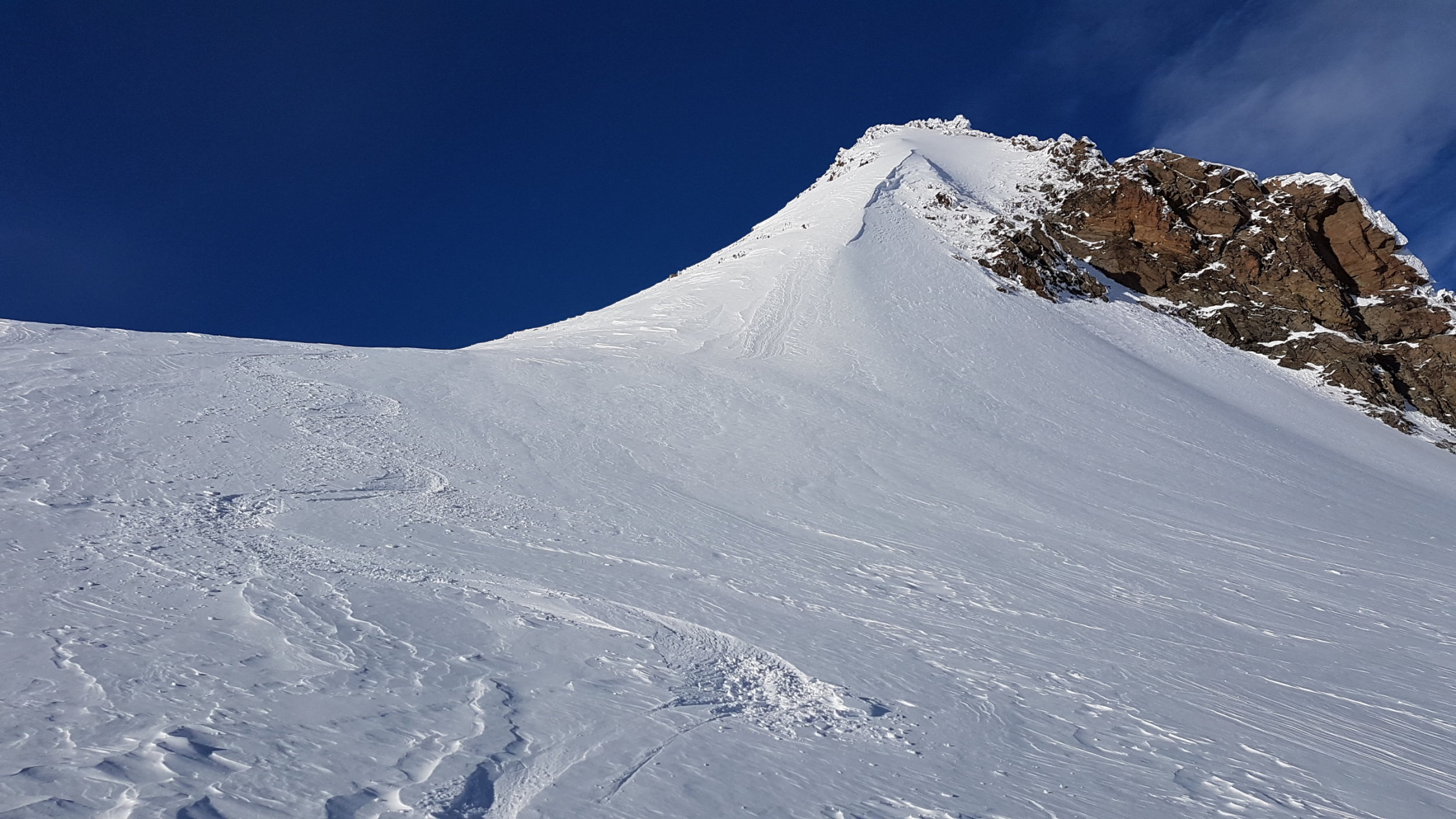 Abfahrt: Im obersten Teil stark verblasen und brettig. Ab ca. 2740m bin ich dann weiter westlich von der Aufstiegsspur runter gefahren auf einer etwas abgeblasenen Rippe, war aber ganz gut zu fahren. Noch etwas weiter westlich wäre der Schnee vermutlich noch besser gewesen, in diese Hänge habe ich mich nicht getraut. Im untersten Teil war es dann doch noch pulvrig, aber schon bald musste ich abbiegen, um wieder das Tal raus zu fahren.