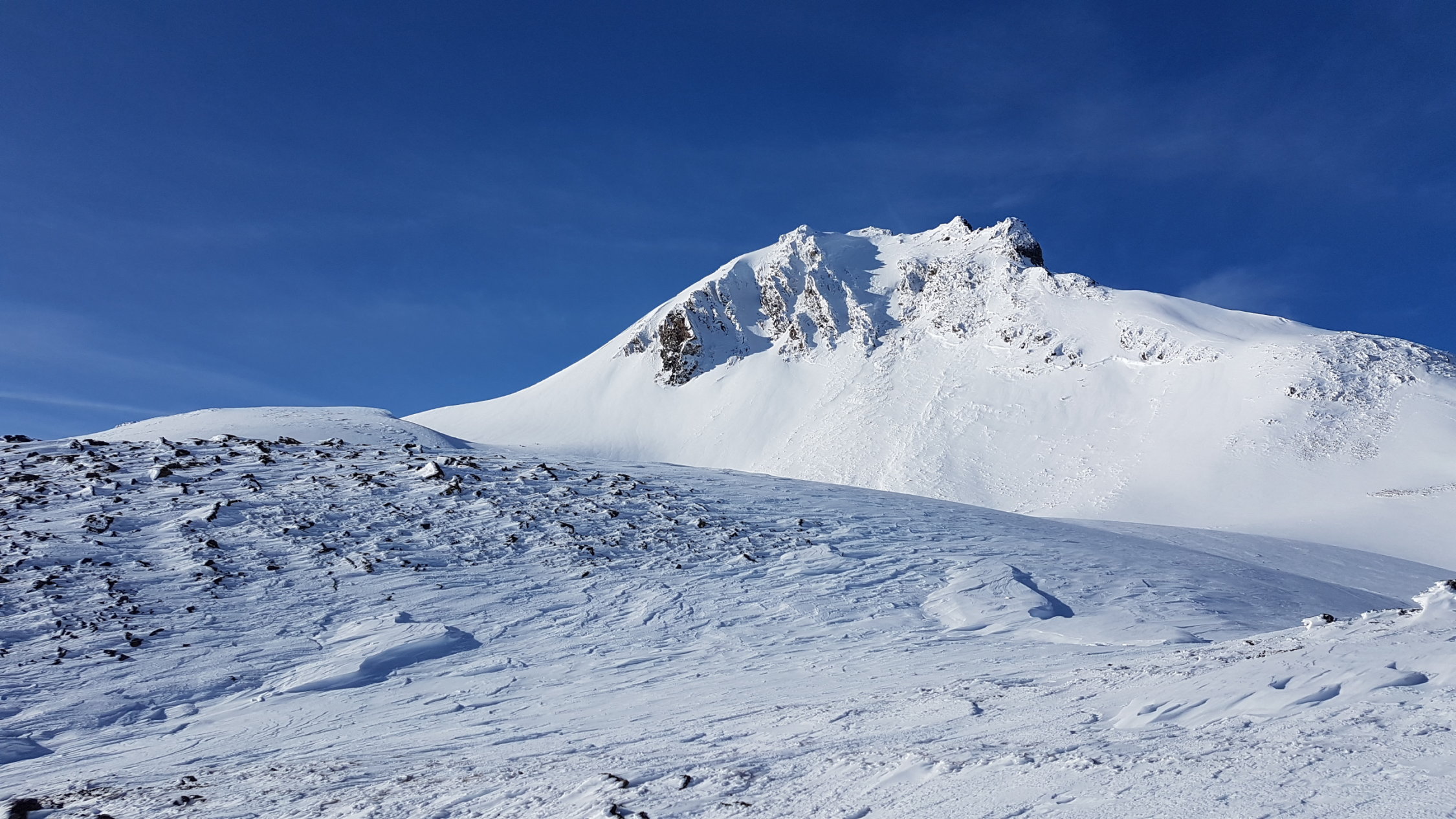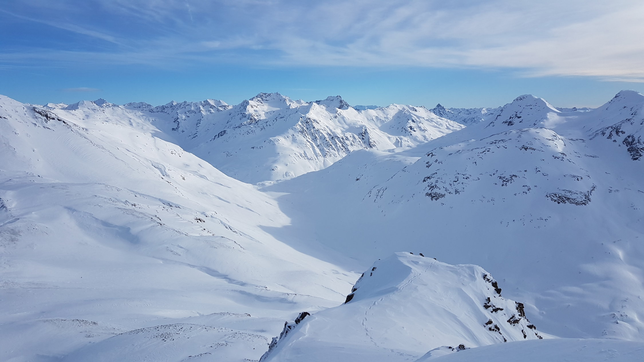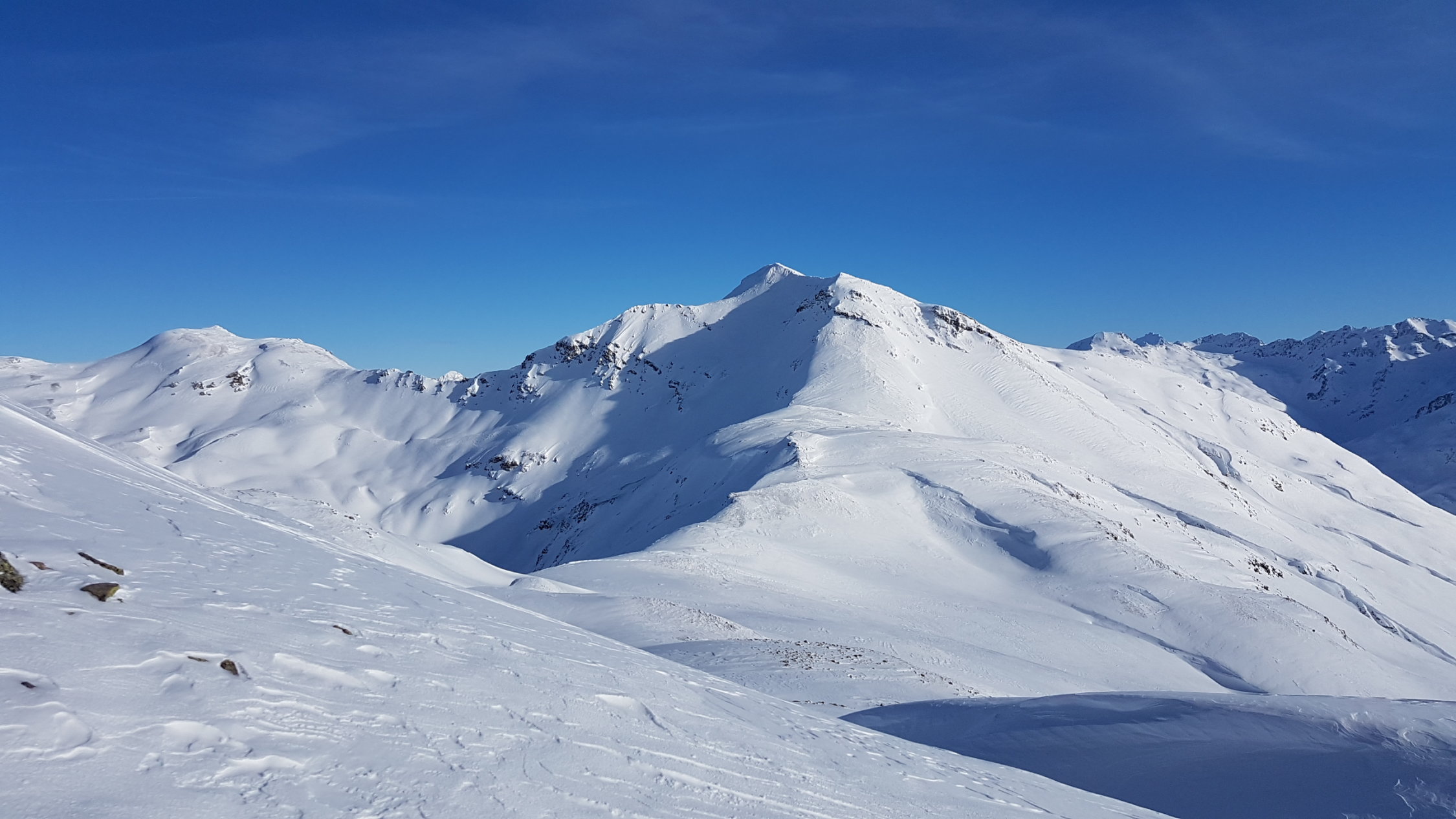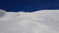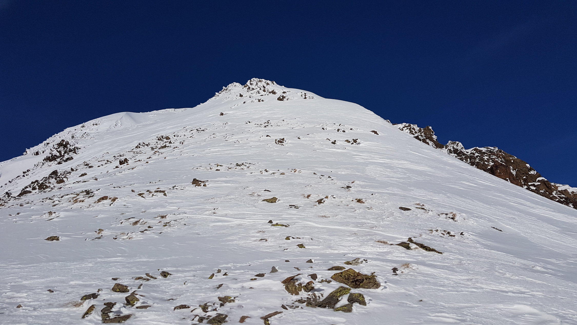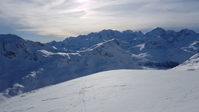 Erst um 10:15 beim Parkplatz Diavolezza gestartet, Temperatur war immer noch -10°. Ins Val dal Fain war eine Spur vorhanden bis Alp la Stretta. Es mussten zwei Lawinenkegel überquert werden, ging ohne grosse Probleme. Wollte eigentlich schon vor der Alp hoch ziehen, aber es war alles recht verblasen, so dass ich zuerst mal zur Alp ging. Dort bin ich dann eine recht abgeblasene Rippe hoch gegangen, die Unterlage war zum Teil recht hart. ab ca 2640 wurde es flacher, dort habe ich leicht nach NW abgebogen. Etwa 100m Hm weiter oben bin ich noch mehr nach Westen Richtung Südgrat des Piz Chatscheders. Einige Stellen waren komplett abgeblasen. Skidepot auf 2895m, dann zu Fuss zum Gipfel. In untersten Teil noch guter Trittschnee, weiter oben dann zum Teil tiefer Schnee.