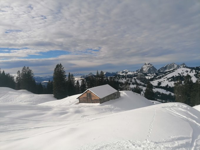 Oberiberg zu wenig Schnee, daher Start ab Unterwandli. Startzeit 12.34 Uhr. Gute Spur bis zum Gipfel. Bei der Abfahrt Hartschnee mit feinem Pulver.