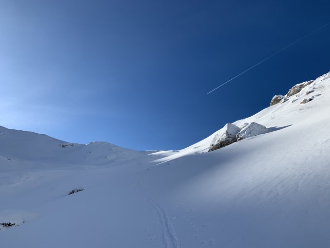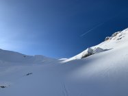 Harter, verwehter Schnee; die oberen 200m mit einer kleinen Pulverschicht. Abfahrt zum Parkplatz ging noch nicht.