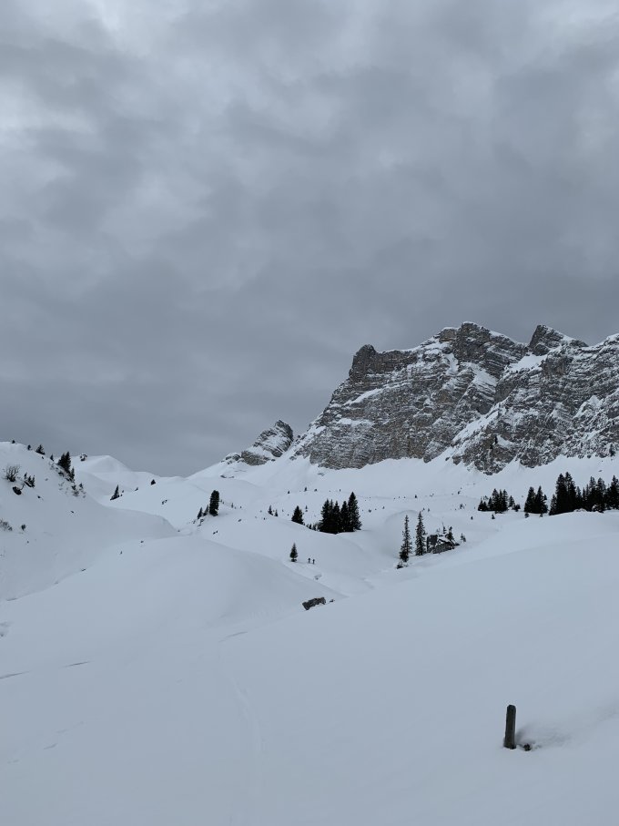 Wening Schnee ab Parkplatz Grimmialp und sogar ein zwei Tragestellen in der Fläche direkt danach wegen fliessenden Gewässern.