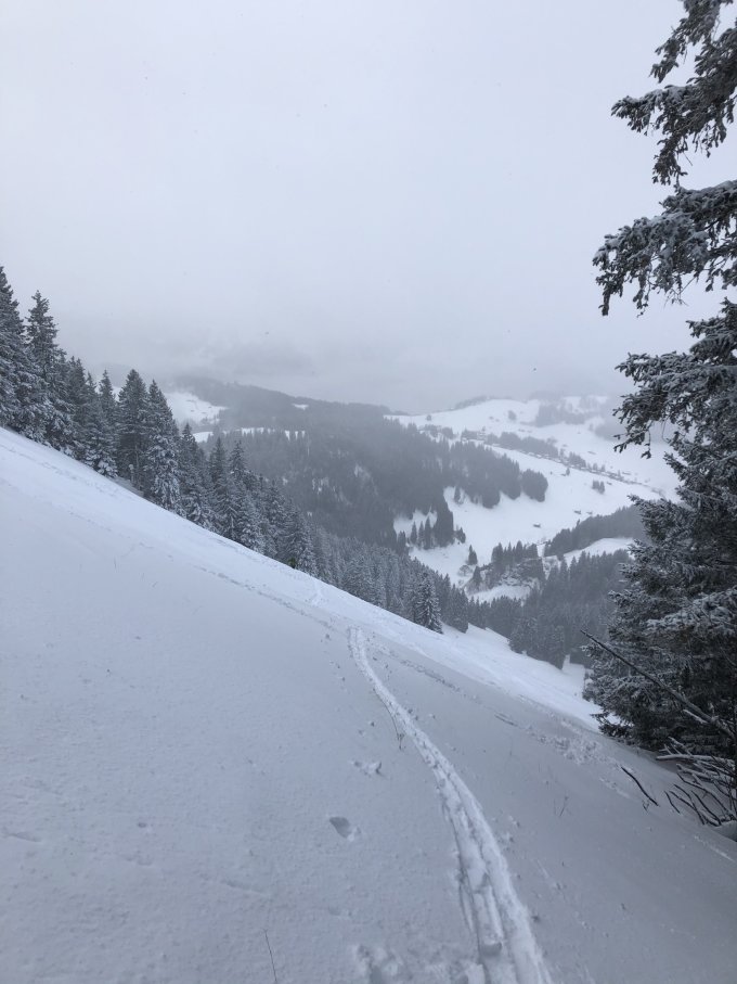 Gulme, schon wieder. Beim Parkplatz Tscherwald um 0 Grad und Schnee/Regen. Ca. 20-40cm Neuschnee auf guter Unterlage, die untersten 100 Höhenmeter nass und klebrig in der Abfahrt, darüber gut. Neuschnee verbindet sich nicht mit dem Eisharst der letzten Regenfälle. Gipfelsteilhang unproblematisch, links und rechts davon wär‘ ich vorsichtig.