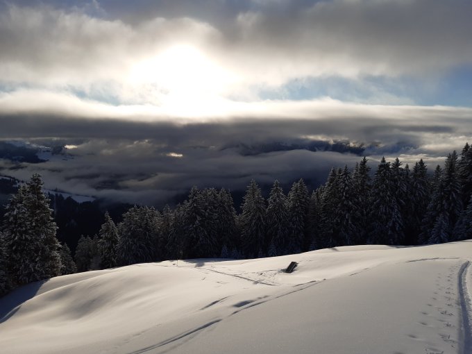 Aufstiegsroute dann über Pligugg-Galfralieng-Wurzaneina-Sadreinegg über den Grat bis zum Steinmann auf 2200müM. Am Grat allgemein wenig Schnee und viele Steine, für Aufstieg kein Problem, Abfahren am Grat geht fast nicht. Auf 2200m habe ich umgedreht, da der folgende Grat ebenfalls voller Steine ist, abfahren müsste man fast zwangsläufig im Hang. Ich bin dann bei P.2142 in den Nordost-Hang, ab dort Lawinen-technisch sicher unkritischer. Den Mulden entlang schönster Pulverschnee. Schneedecke ist allgemein oben rum etwas dünn/verblasen, unterhalb Sadrein fast besser da weniger Wind drin war. Wetter nicht zu toppen, in der Abfahrt Höhe Sadrein noch eine letzte Nebelbank erwischt.