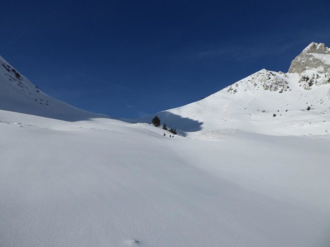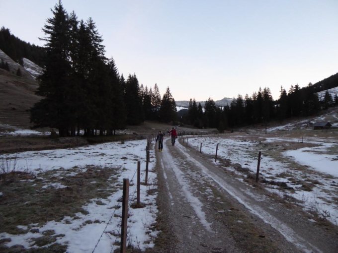 Etwas erschrocken sind wir schon an der Hengstkurve: wo ist der Schnee? Offensichtlich hat es im Gantrisch nicht bis 1200m geschneit, sondern nur bis ca. 1400, darunter geregnet. Weiter zur unteren Gantrischhütte? Nein: Da ist sicher der Teufel los. Also nicht abschrecken lassen: Wir haben die Ski geschultert und sind los. Es hat sich gelohnt!
