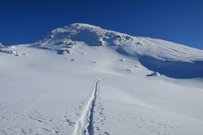 Sehr schöner Aufstieg durch verschneite Tannen. Ab Waldgrenze zum Teil eisig, aber ohne Harscheisen machbar. Oben ist alles verblasen. Von unten bis oben gute Spur. War alleine auf dem Gipfel.