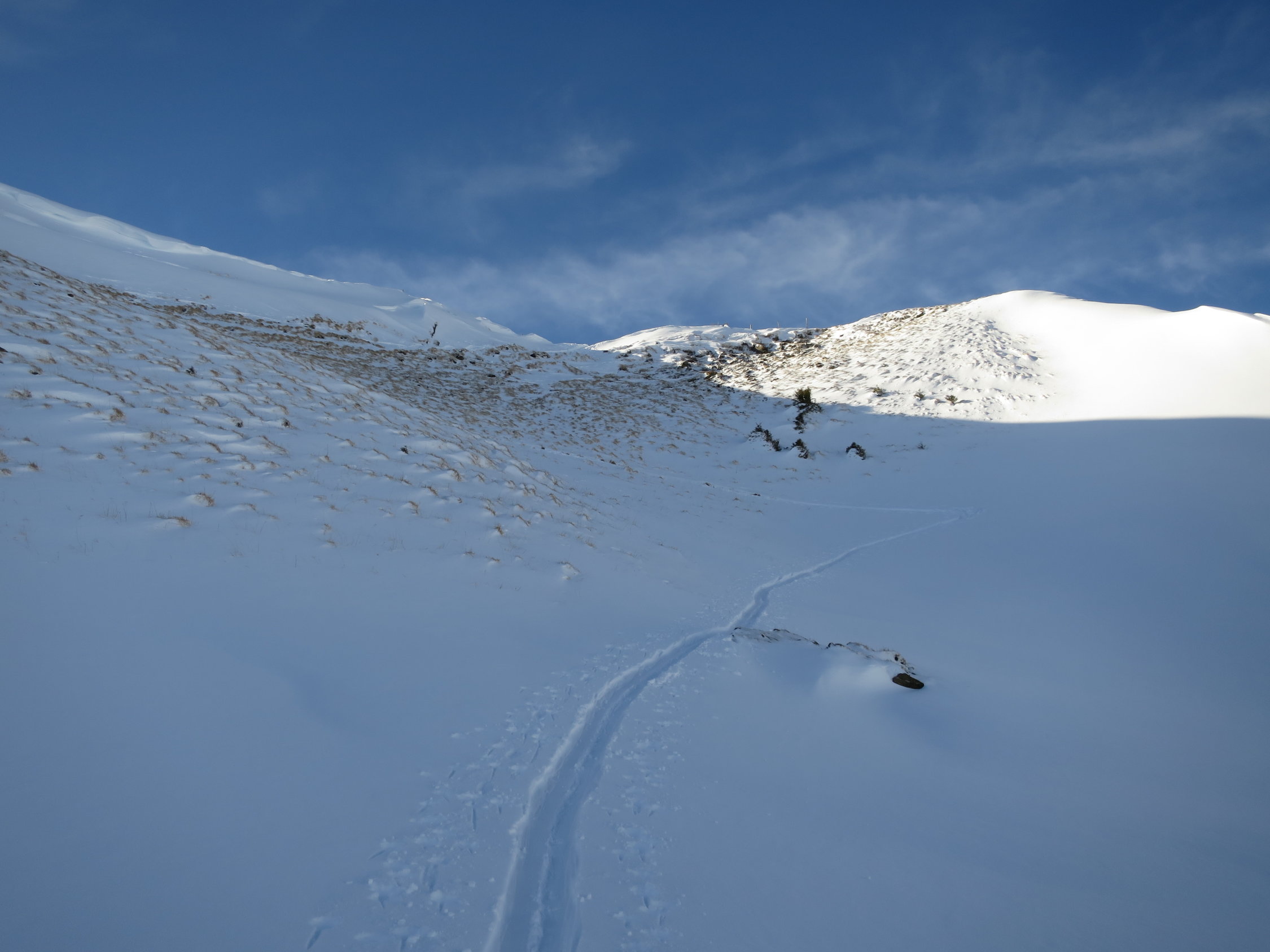 Auf dem Grat ist der Schnee weggeblasen, doch es geht noch gut mit den Skis.