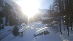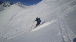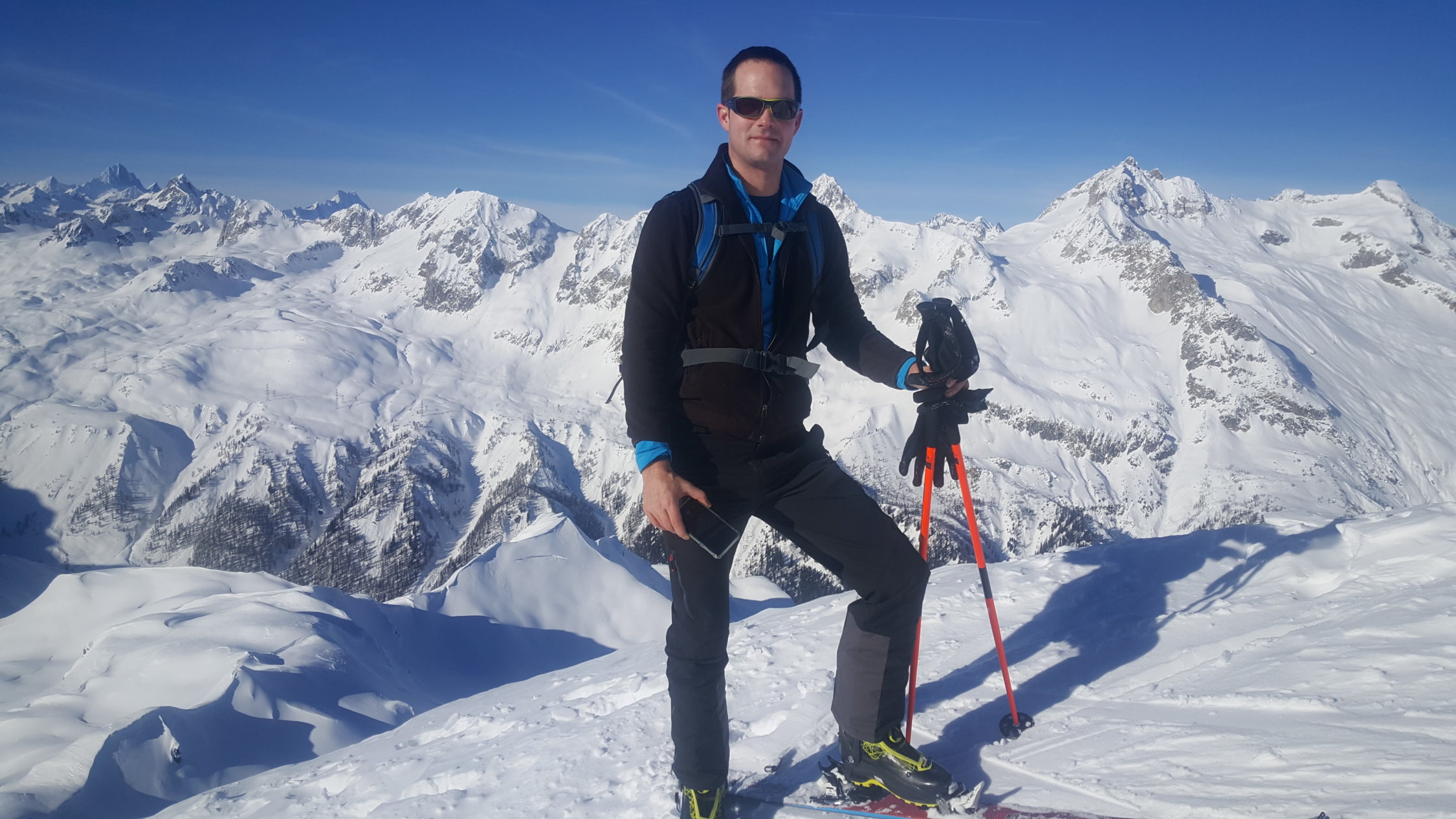 Wetter prächtig. Temperatur in All'Acqua um den Gefrierpunkt. Am Parkplatz liegt über 1 m Schnee. Wenige Windböen am Gipfel. Schnee am Gipfel pistenartig, sonst Pulver, teilweise leicht windgepresst, unten im Wald gedeckelt aber gut fahrbar.