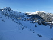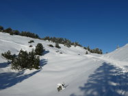Von dort aus ist aktuell durchgehend bis zum Gipfel gut gespurt. Neben der Spur überall schöner Pulverschnee. Die Spur verläuft, wie üblich im Winter, über die Mulde bei Oksatola.