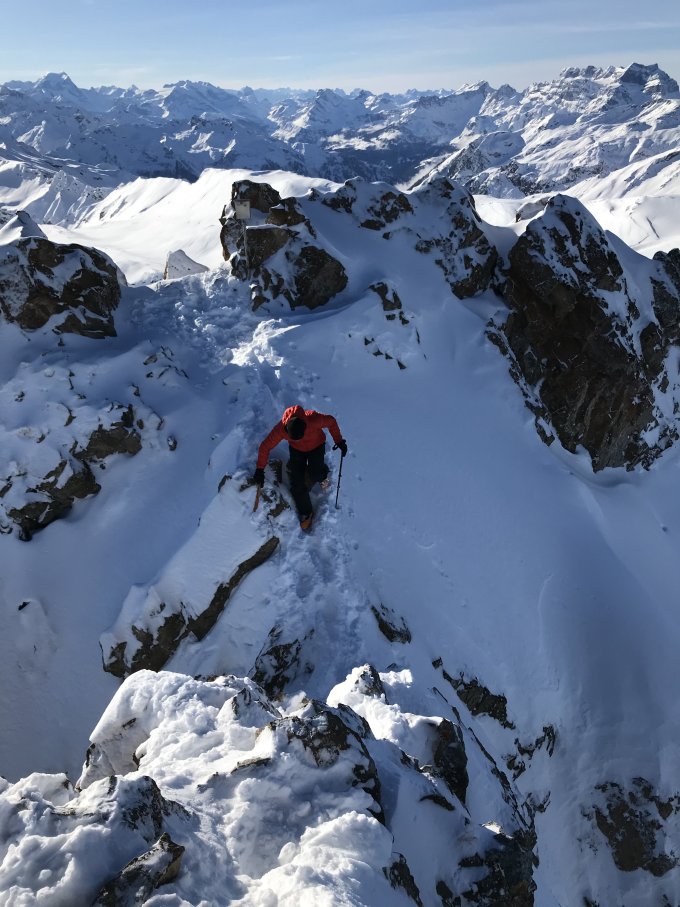 via Lücke zwischen Wissmeilen und Spitzmeilen, den Spitzmeilen bei wenig Schnee und mit Harscheisen westlich umrundet. Bis zum Gipfelcouloir mit ein paar Spitzkehren und zum Schluss zu Fuss auf den Gipfel. Danke für die vorhandene Spur. Pickel in den obersten paar Metern hilfreich. Abfahrt dann im Gipfelhang super. Aufgrund der fortgeschrittenen Zeit zurück ins Skigebiet.