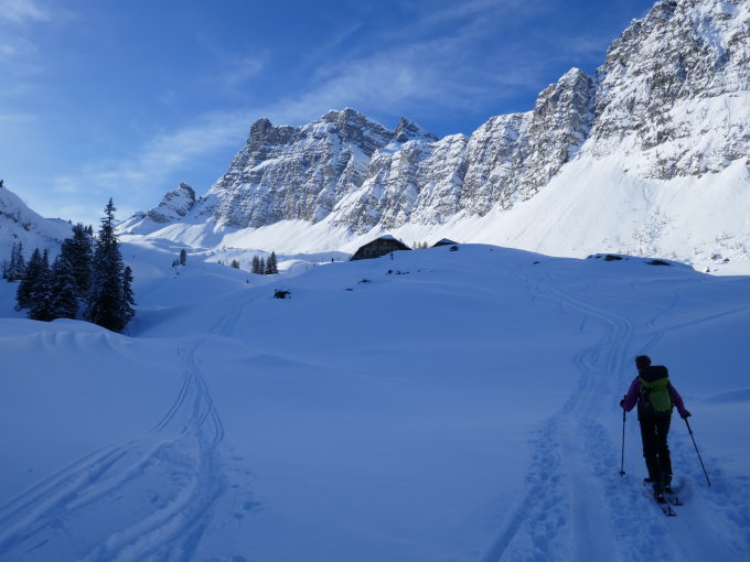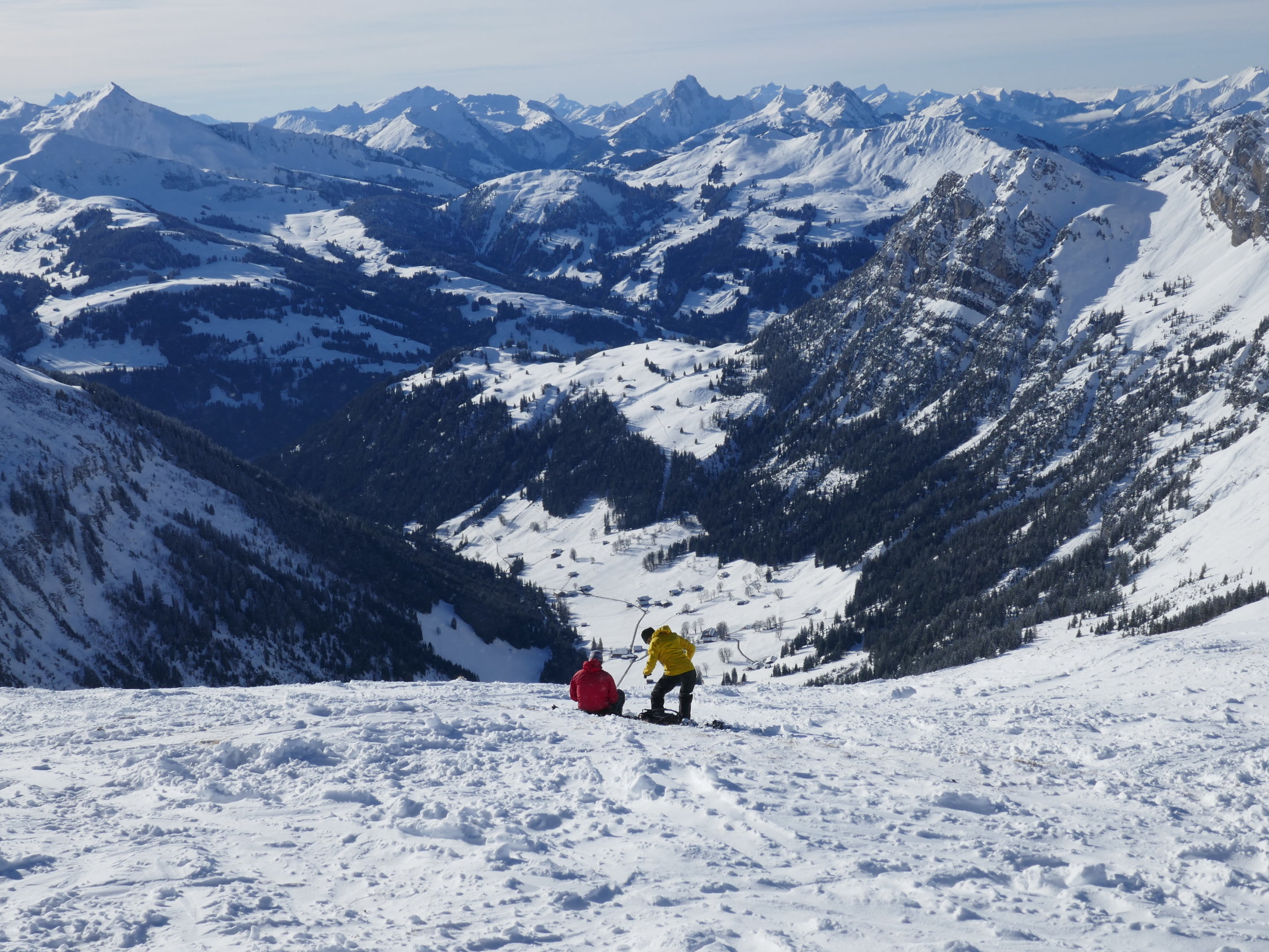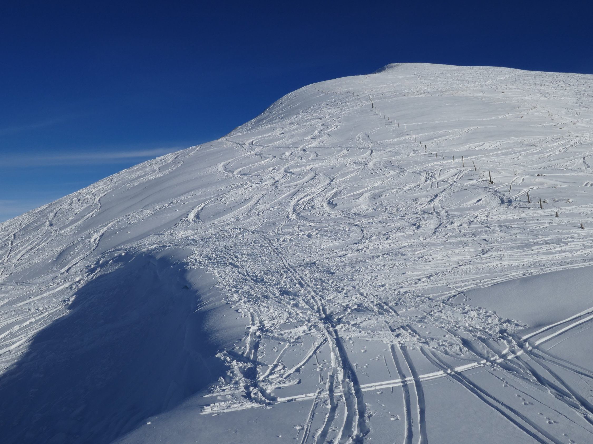Waldweg gut eingeschneit, Grimmialp sehr wenig Schnee, aber pistenähnlich verfestigt und ab Nydegg bis zum Parkplatz fast überall gut befahrbar, im oberen Teil bereits ziemlich verfahrener Pulverschnee