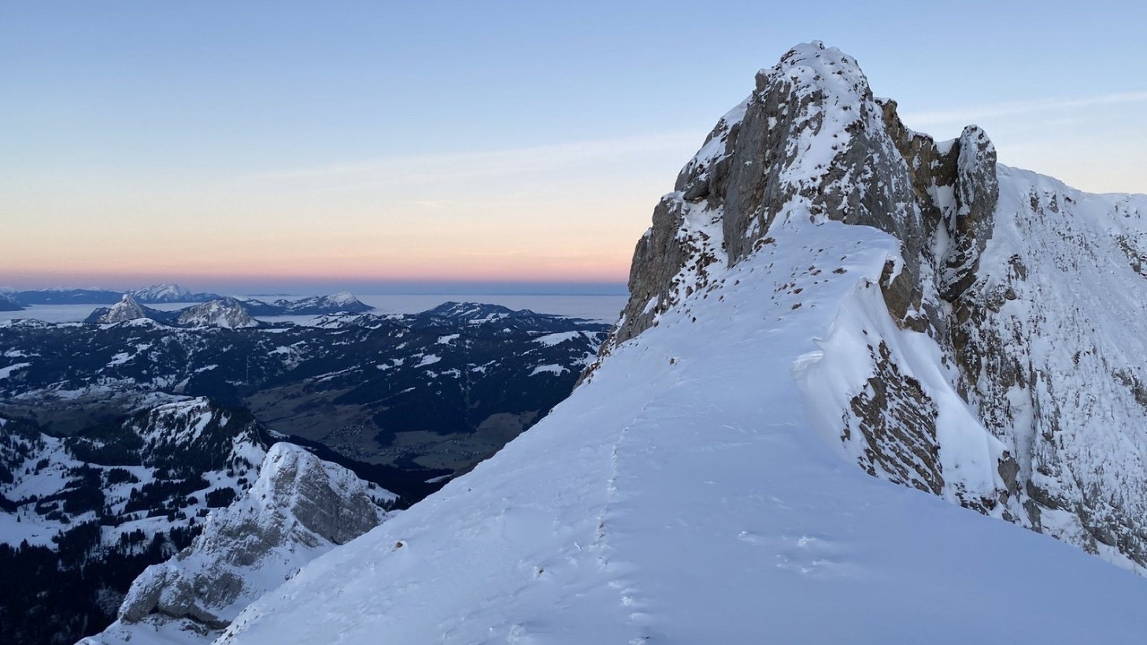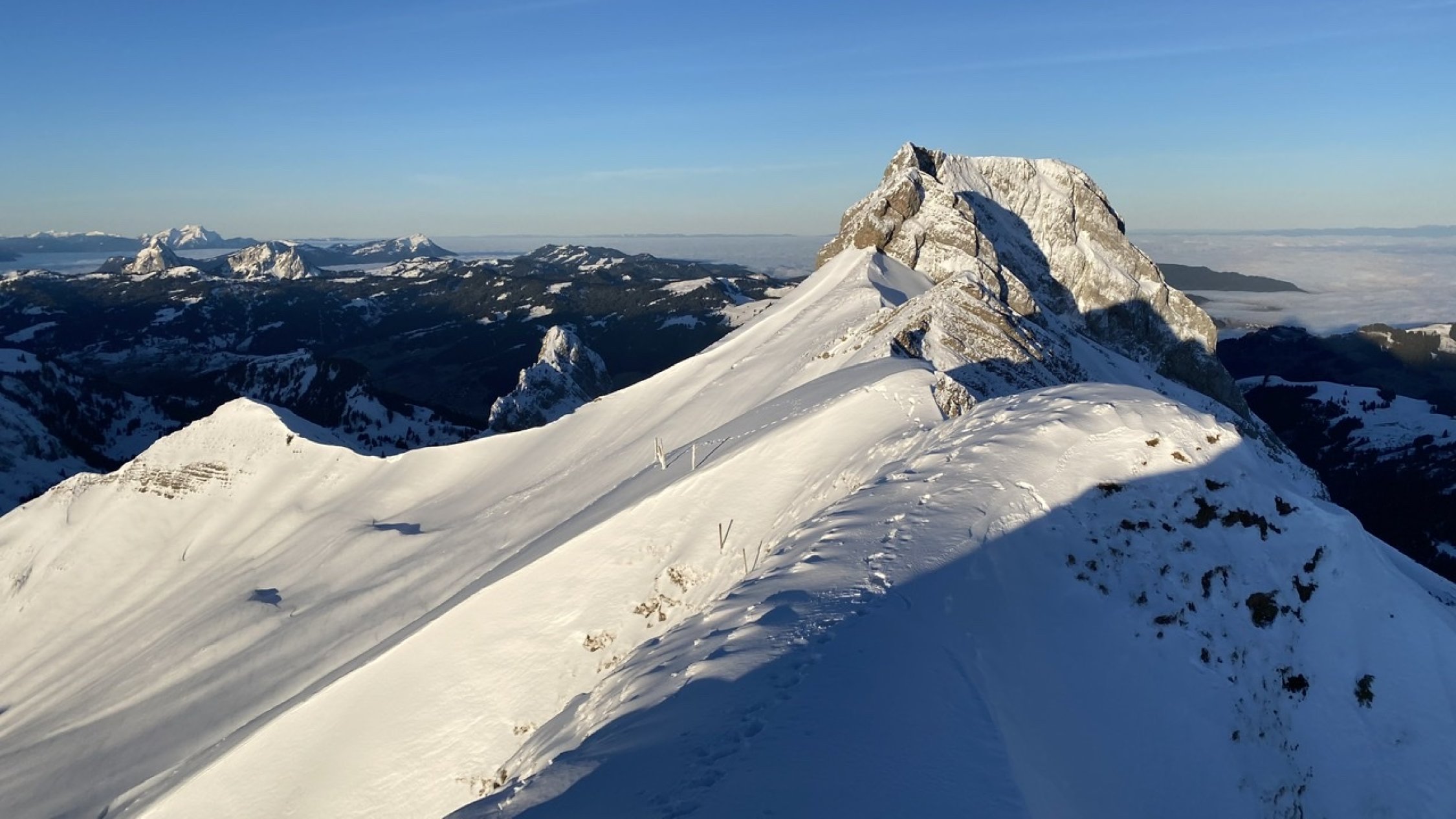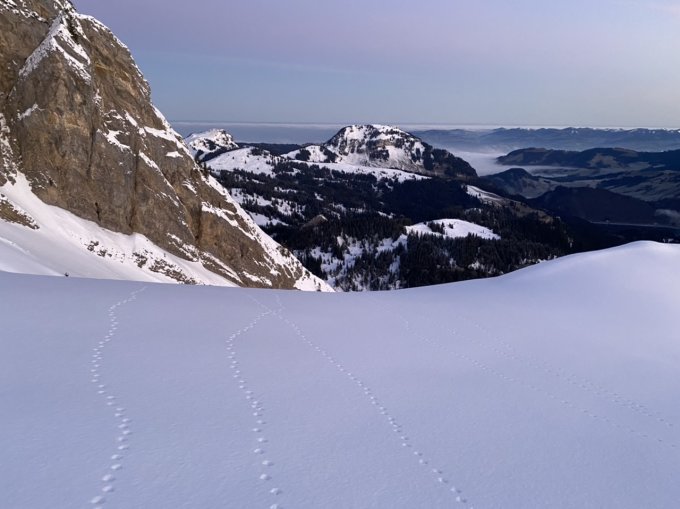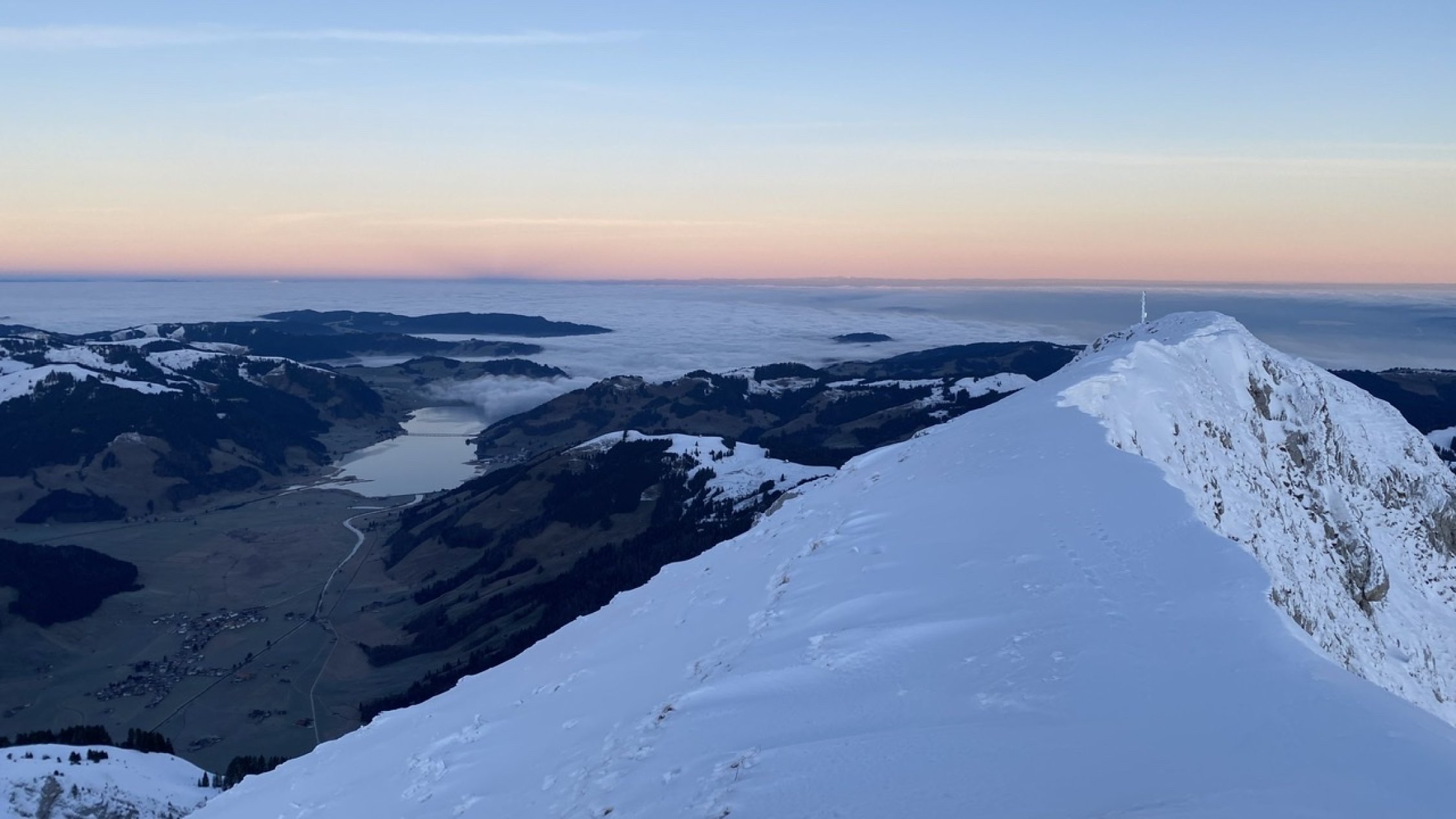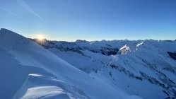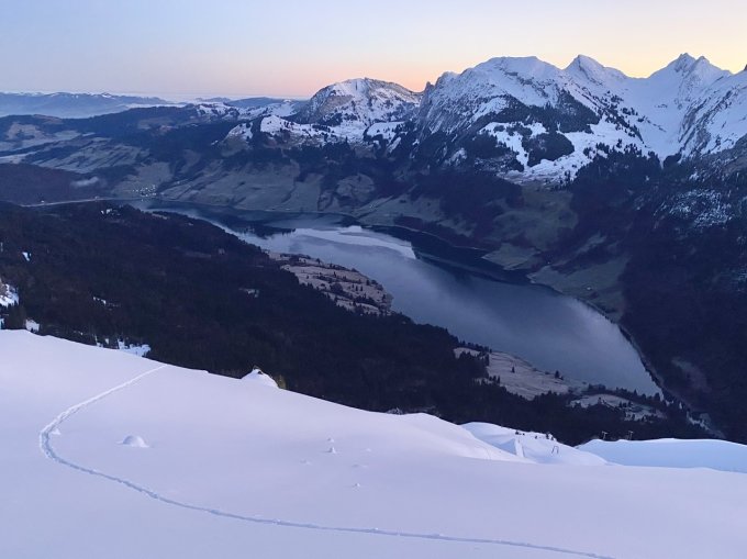 Unten nicht überraschend aper. Geschlossene Schneedecke ab 1180. Tragende, oben leicht durchbrechende Hartschneedecke. Für Aufstieg tiptop, für die Abfahrt eher anspruchsvoll aber noch fahrbar. Gipfelaufstieg zu Fuss mit Ketten problemlos. Die Sonne lässt auf sich warten, da der Glärnisch im Weg steht, also rüber zum Turner. Sonnenaufgang kurz vorher.
