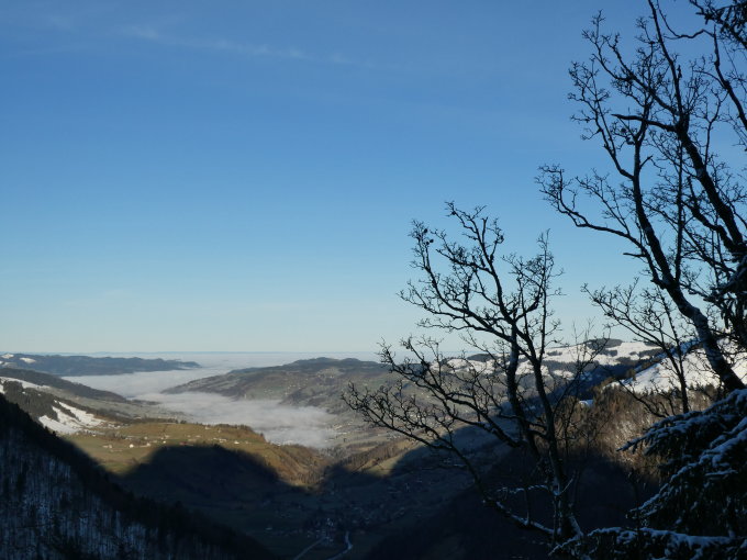 Im Aufstieg bis etwa 1200m kein oder nur wenig Schnee, z.T. eisig auf dem Wanderweg. Bei Pkt.1221 kann man momentan die Ski oder Schneeschuhe anschnallen. Im unteren Teil des Waldaufstiegs allerdings harter Schnee. Erst ab ca.1400m Pulverschnee mit leichtem Deckel. Es waren Schneeschuhspuren vorhanden.